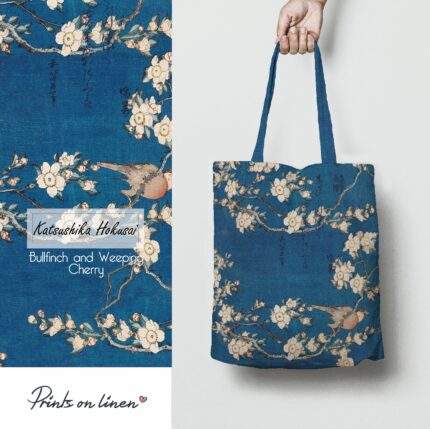 Katsushika Hokusai, tote bag canvas, Bullfinch and Weeping Cherry, linen bag, gift for teacher, shopping bag, PR1016