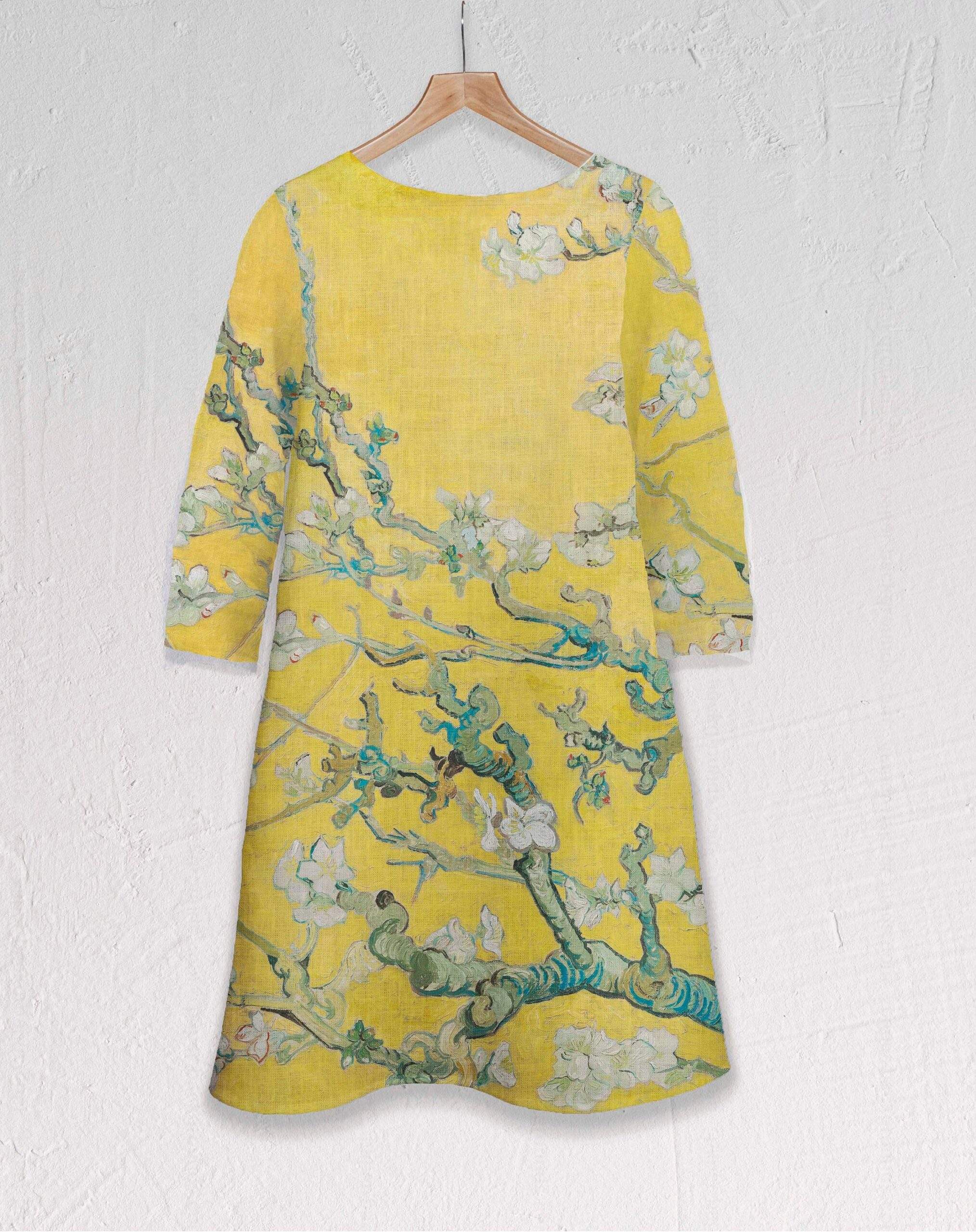 Linen dress of Vincent Van Gogh “Almond Blossom” (yellow edition). Even after the deepest darkness comes light and after the heavy storm returns absolute serenity. Smooth transitions of colours and shades reinforce the symbolic meaning of almond blossom that sharpen the sense of resurrection and the new awakening. Women’s linen dress of Almond Blossom can be standard size or plus size. This dress reminds to us that not only colours, but also shades are important in our life.