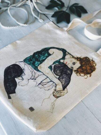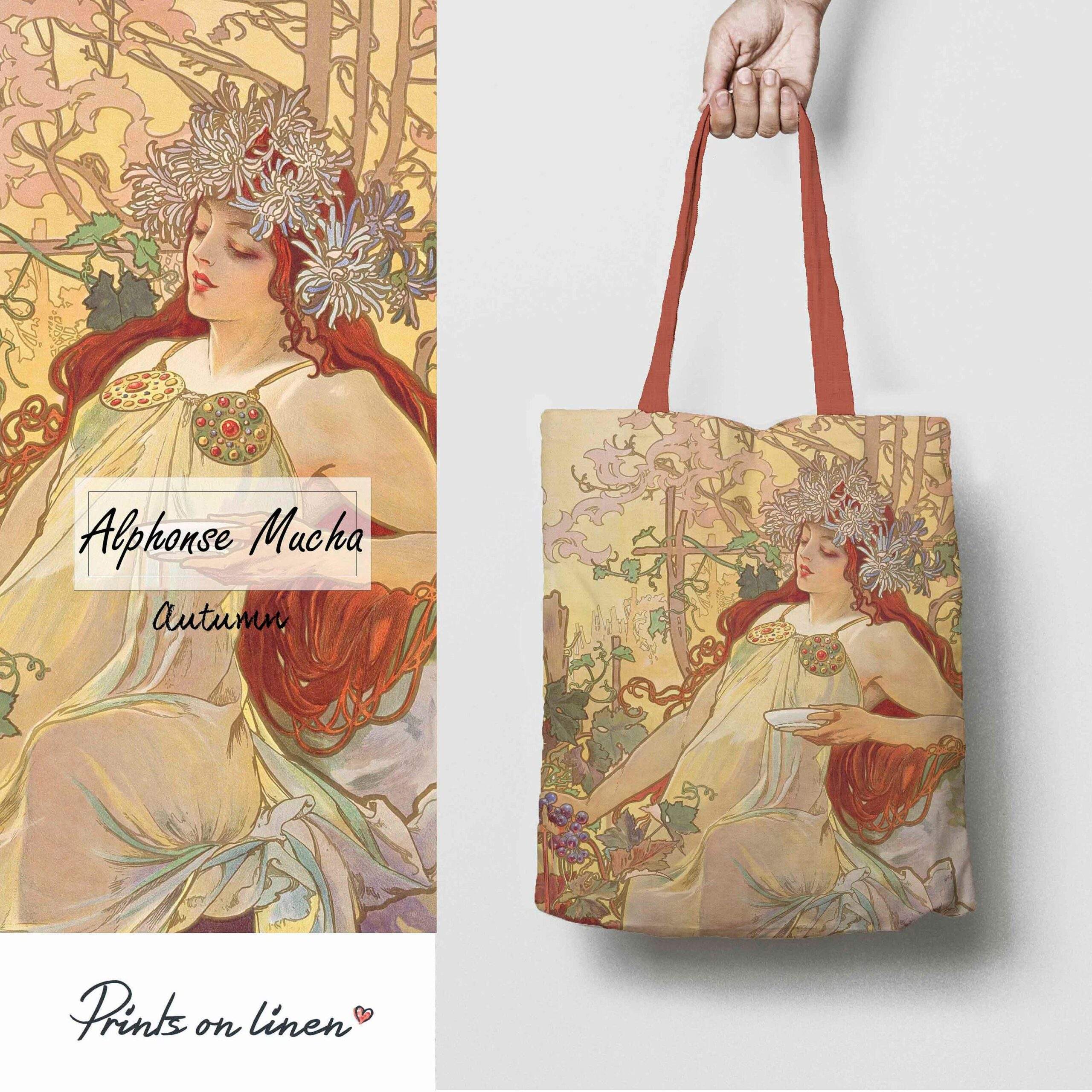 Linen tote bag “Autumn” by Alphonse Mucha, the Seasons (series). Print is on both tote bag sides.