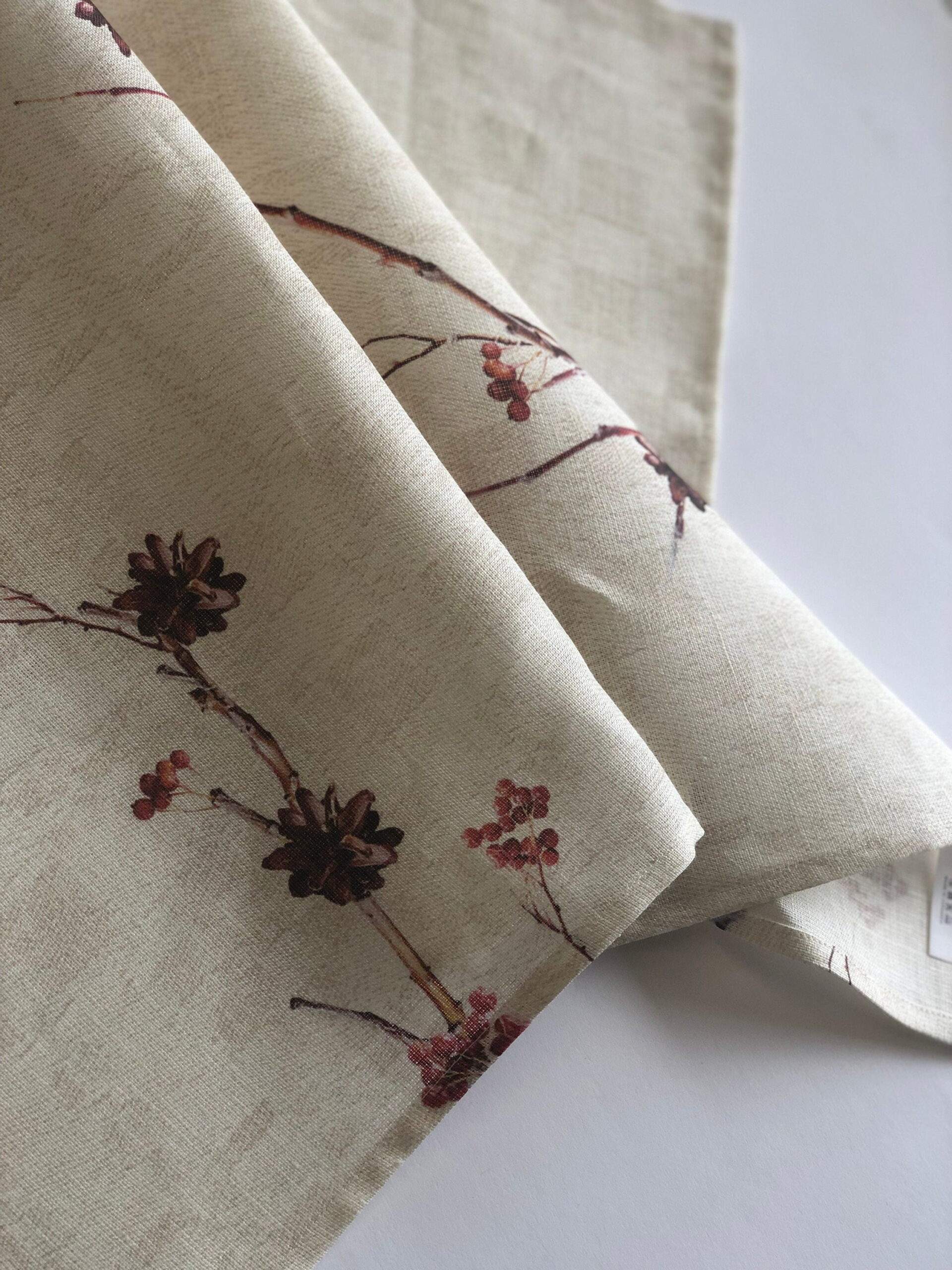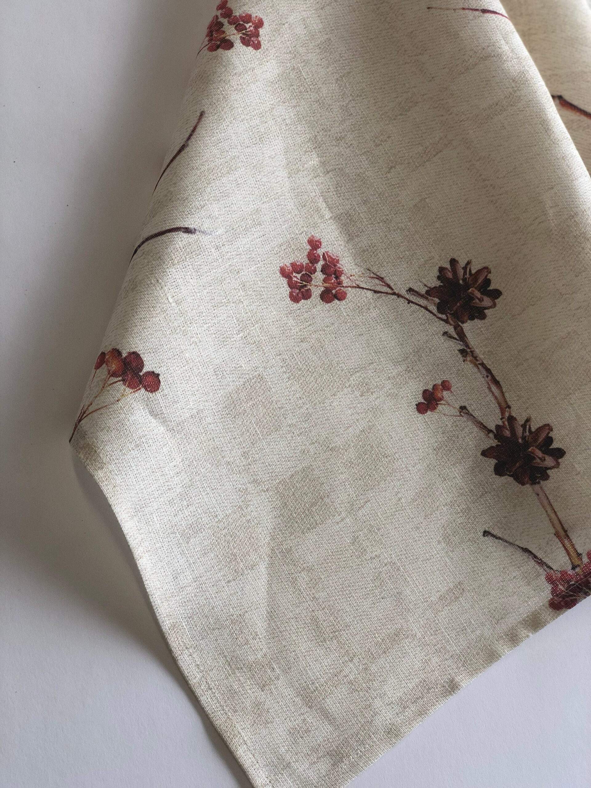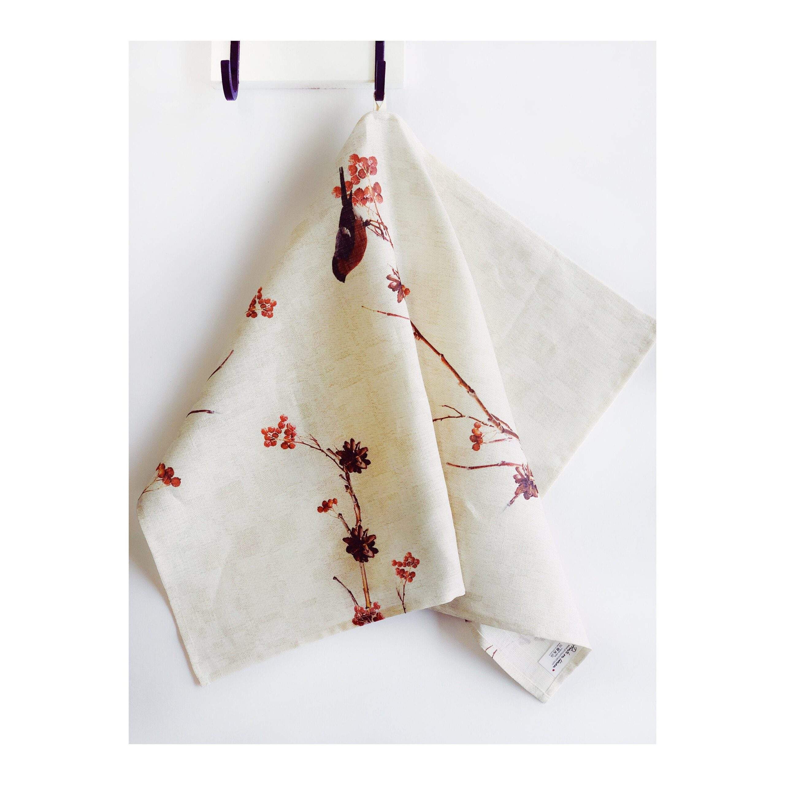 Linen kitchen towel with Cranberries print. We have same pattern linen table runner, tablecloth, napkins and placemats sets. 100% Natural white linen, hand painted pattern, personalized towel for home decoration, with hook.