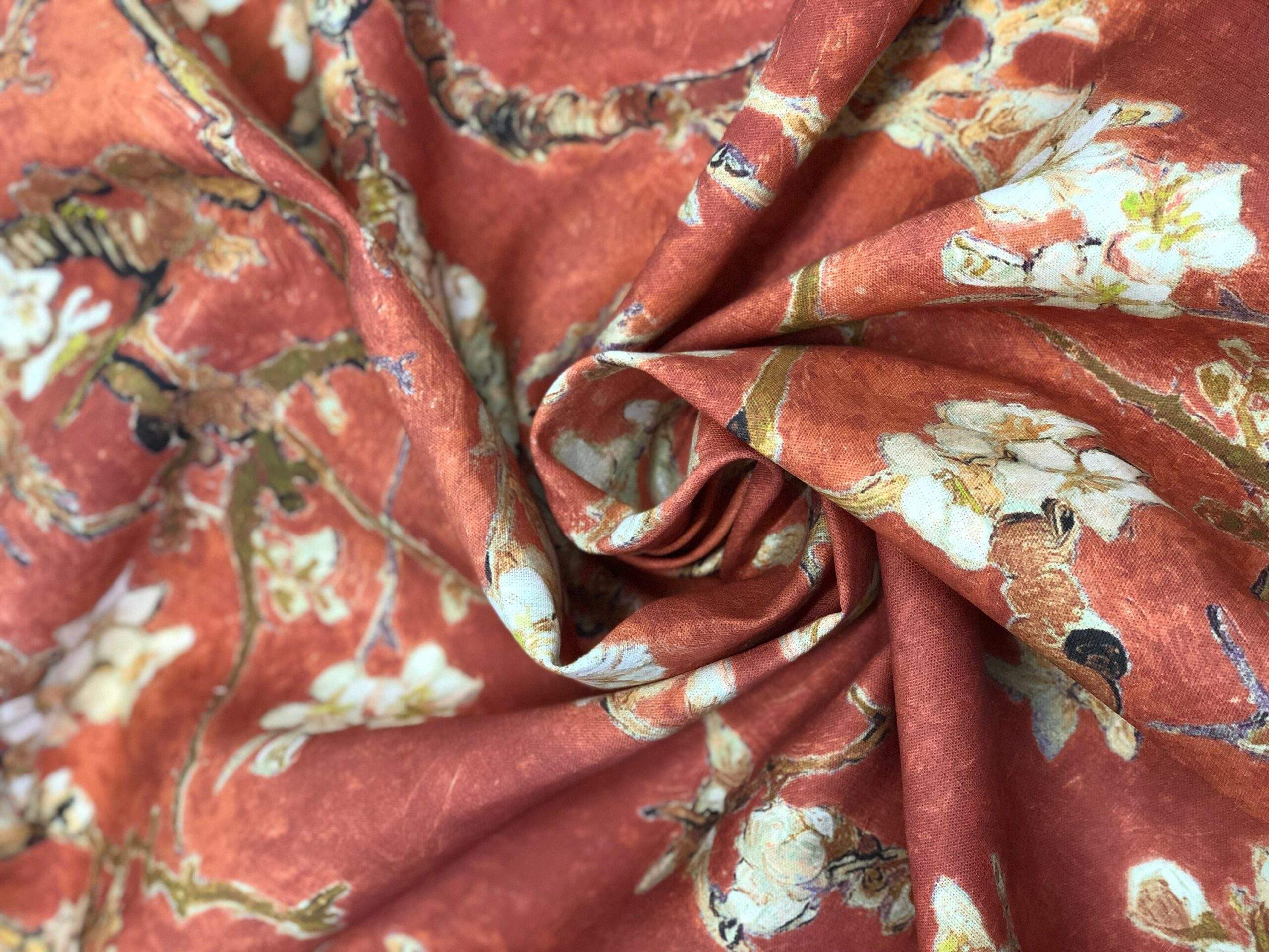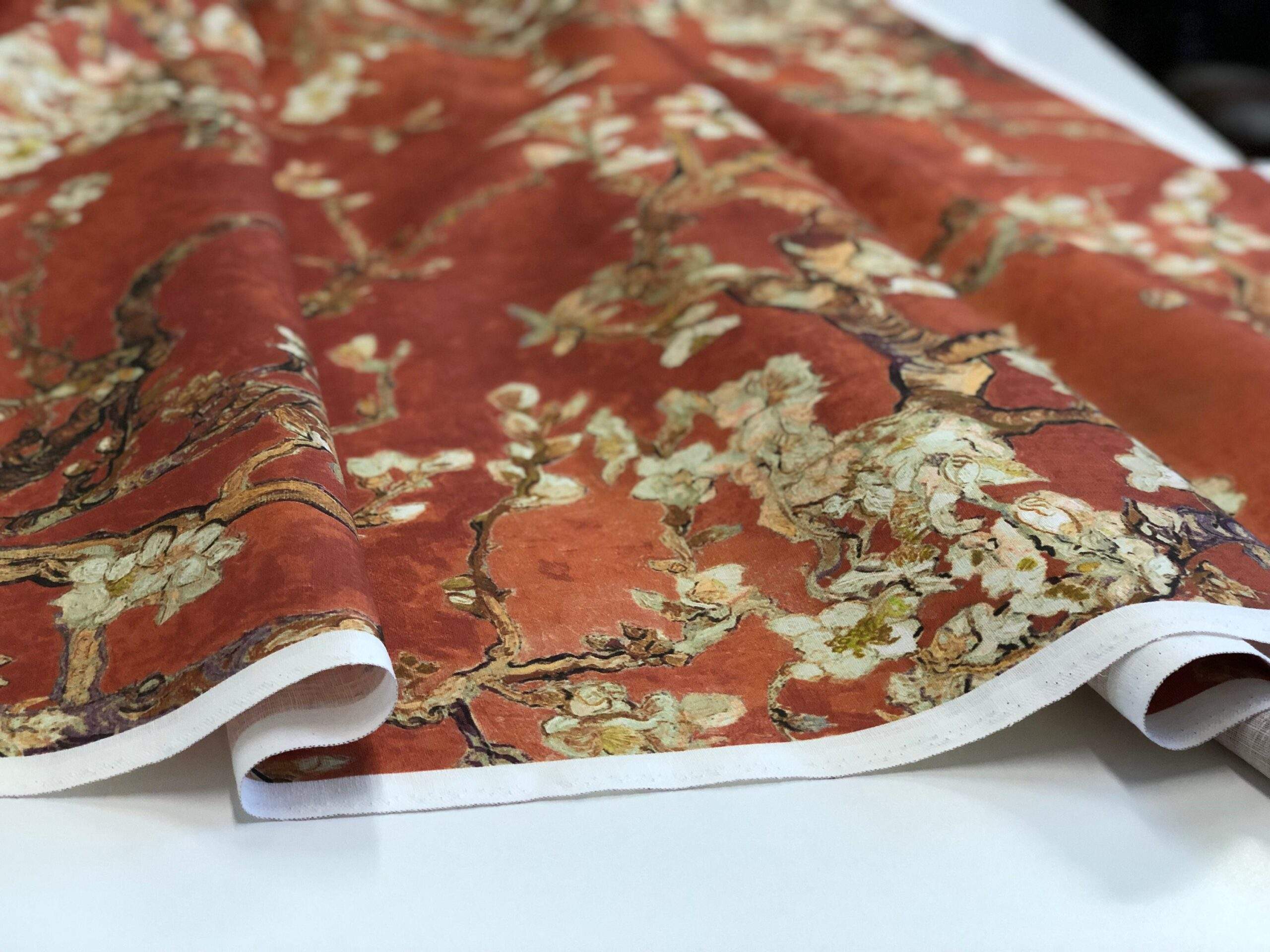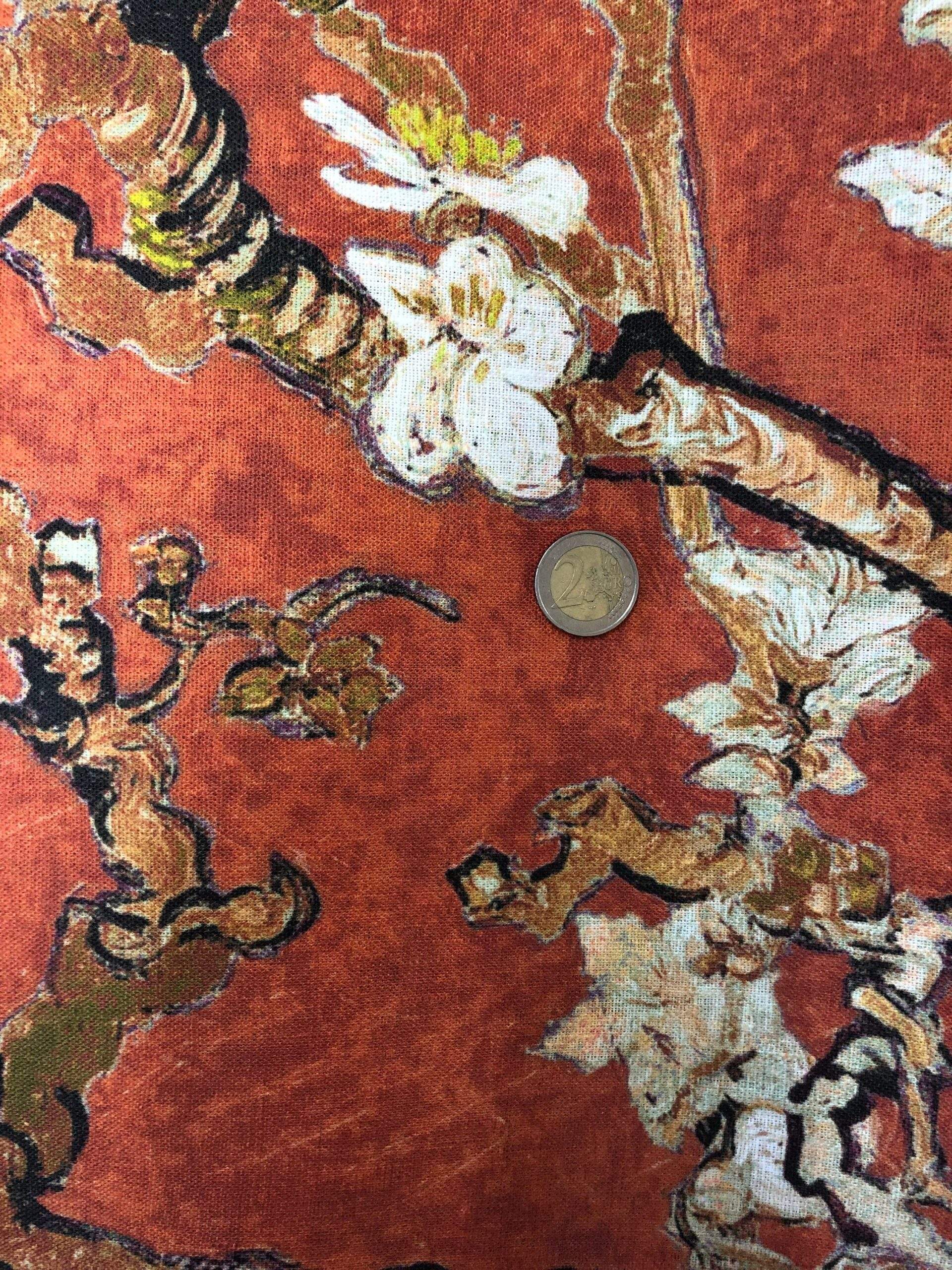 Linen fabric Vincent van Gogh “Almond Blossoms”. Copper red fabric.