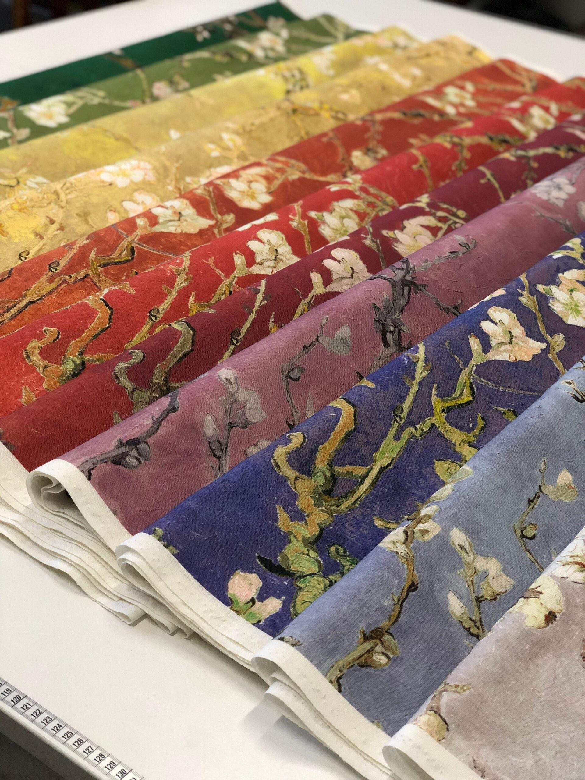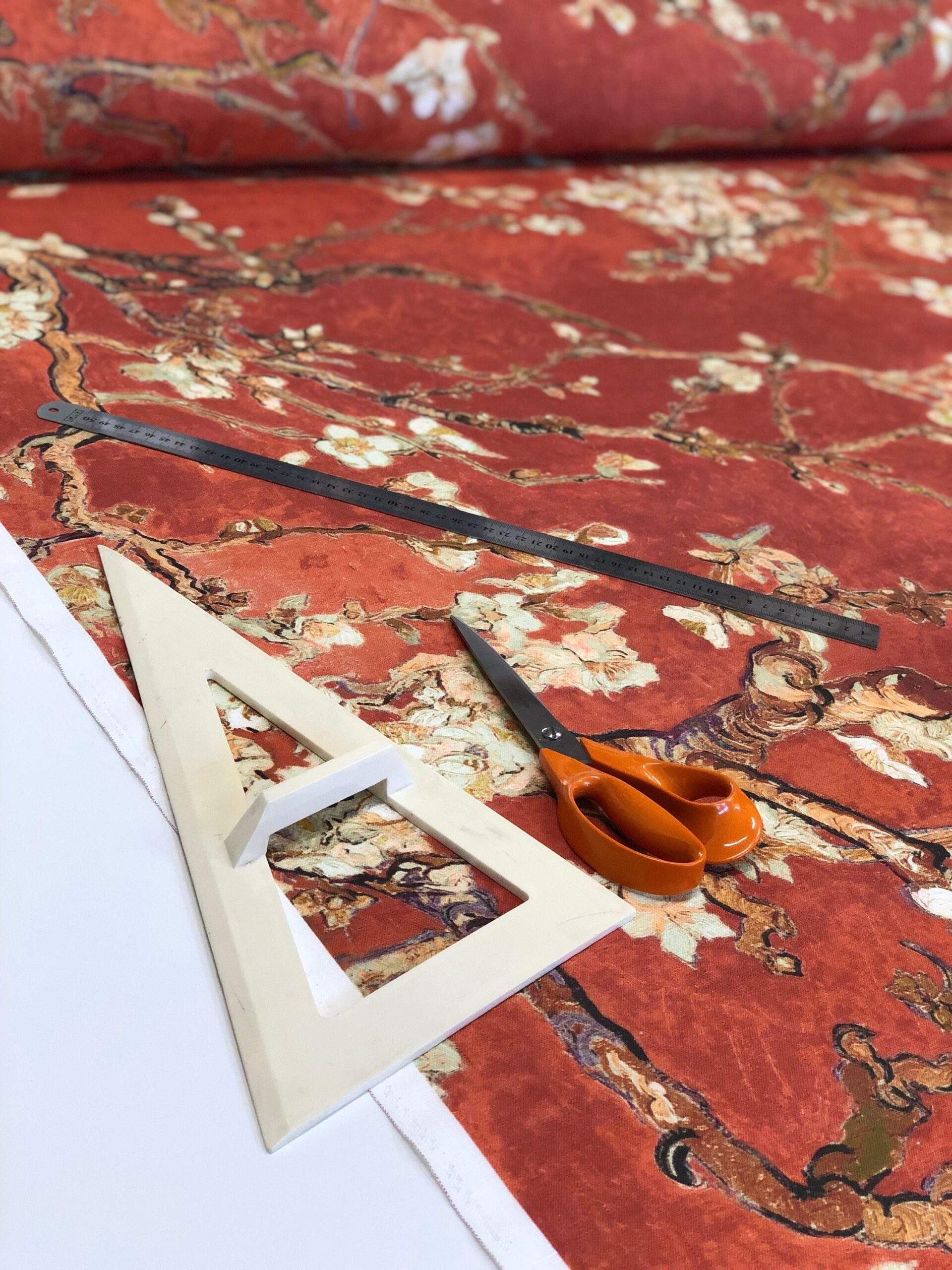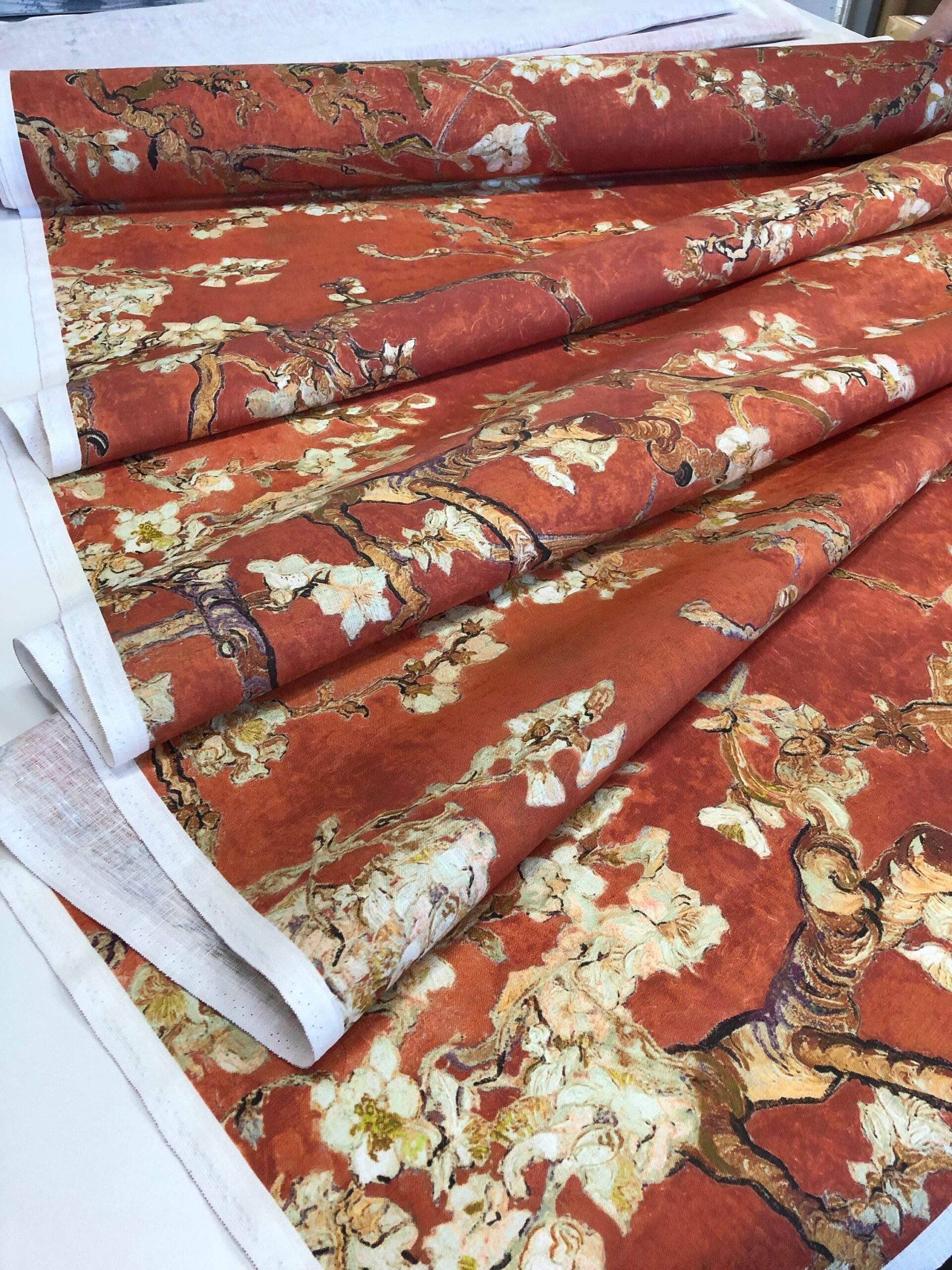 Linen fabric Vincent van Gogh “Almond Blossoms”. Copper red fabric.