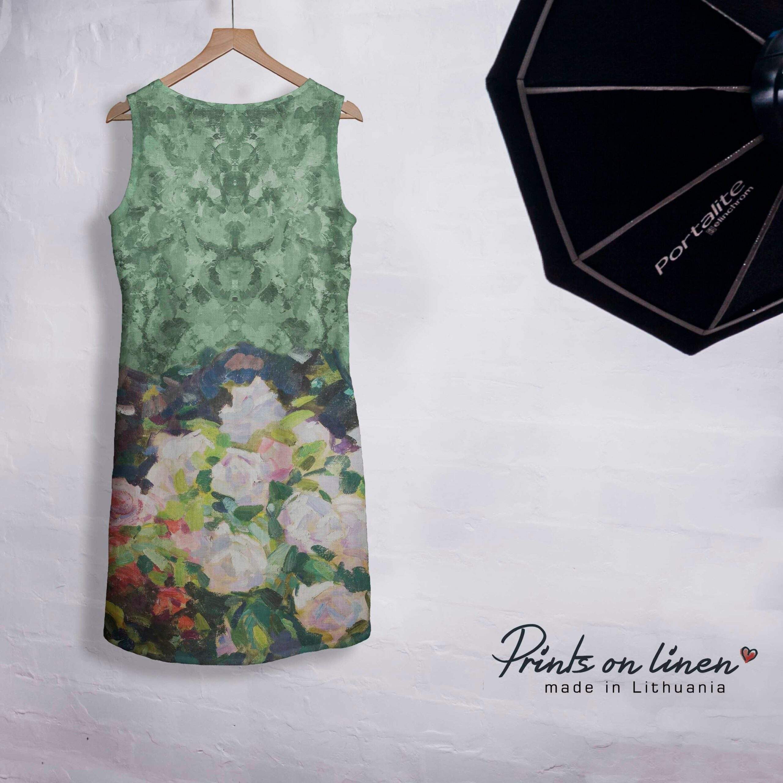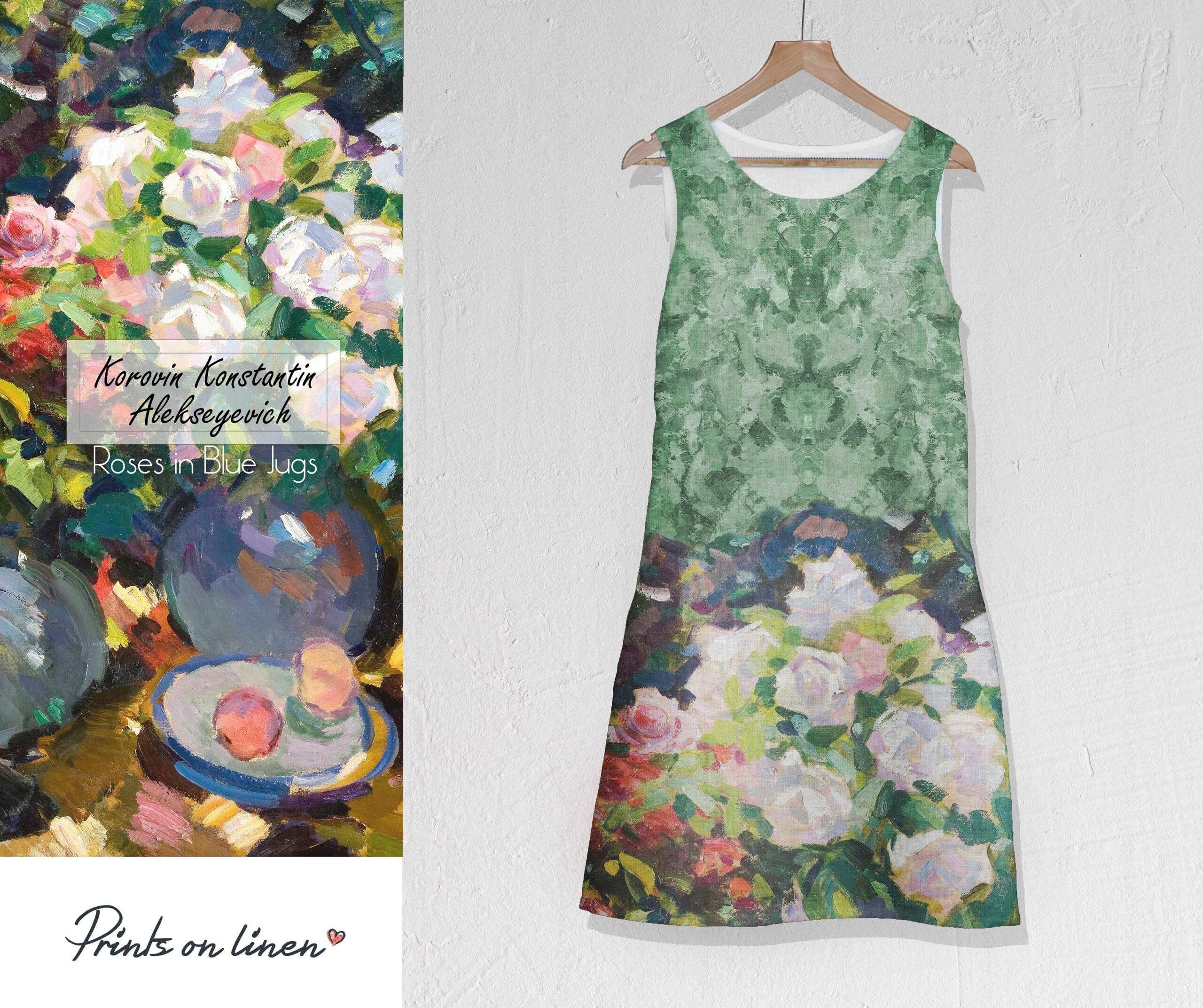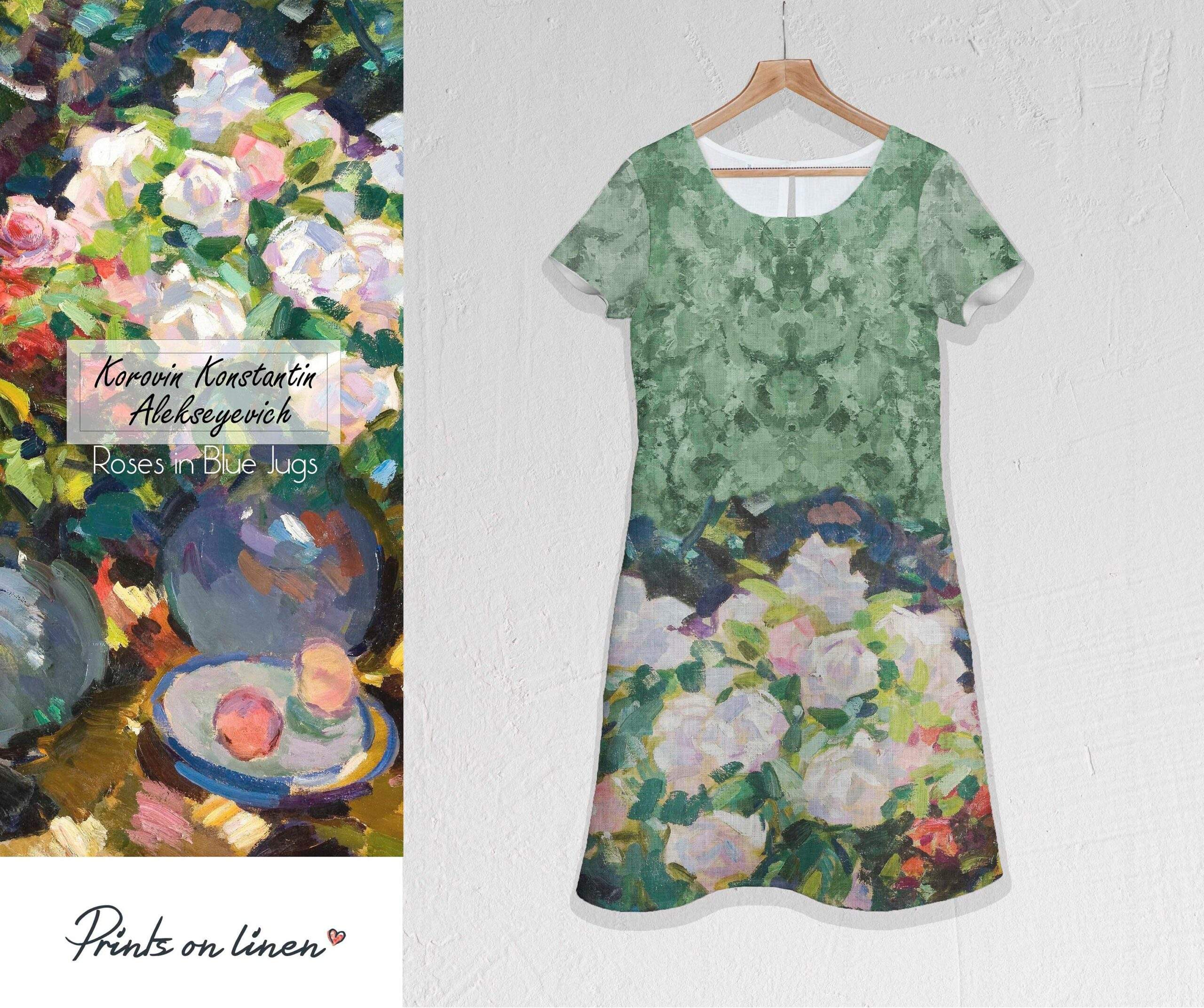 Linen dress inspired by Konstantin Korovin artwork “Roses in Blue Jugs”, print is on both dress sides, with pockets. You can choose sleeveless linen tunic or classic dress with short sleeves.