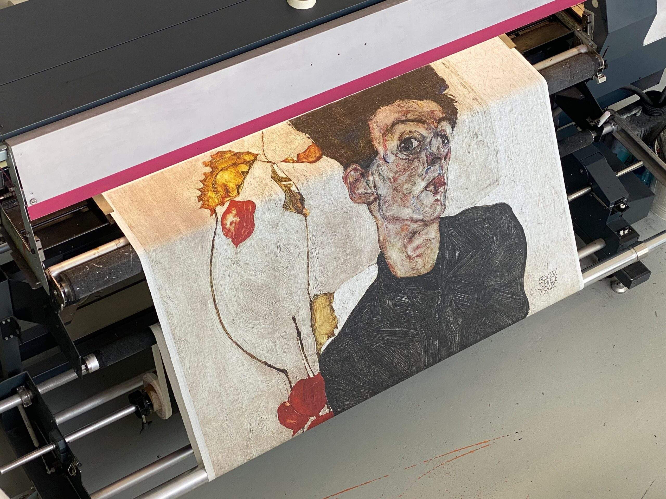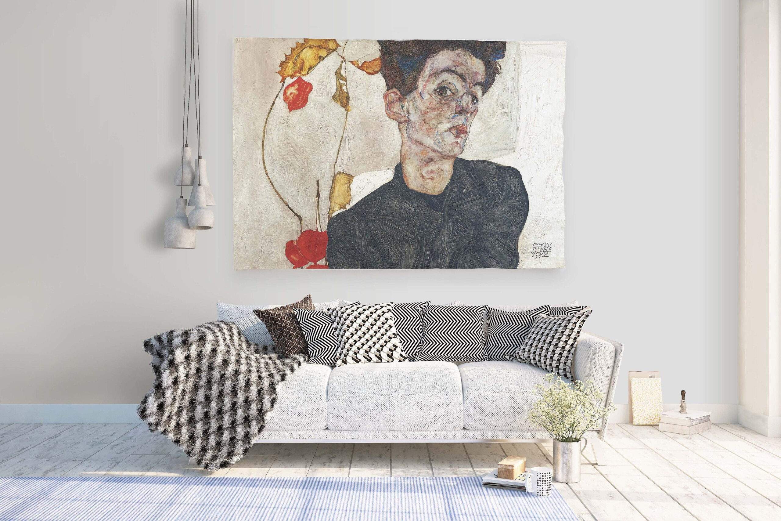 Wall tapestry Egon Schiele “Self-Portrait with Physalis”. Egon Schiele was an Austrian painter. A protégé of Gustav Klimt, Schiele was a major figurative painter of the early 20th century. Great, classy and unique decoration for your home, studio or workplace. Natural, organic materials and eco friendly dyes.