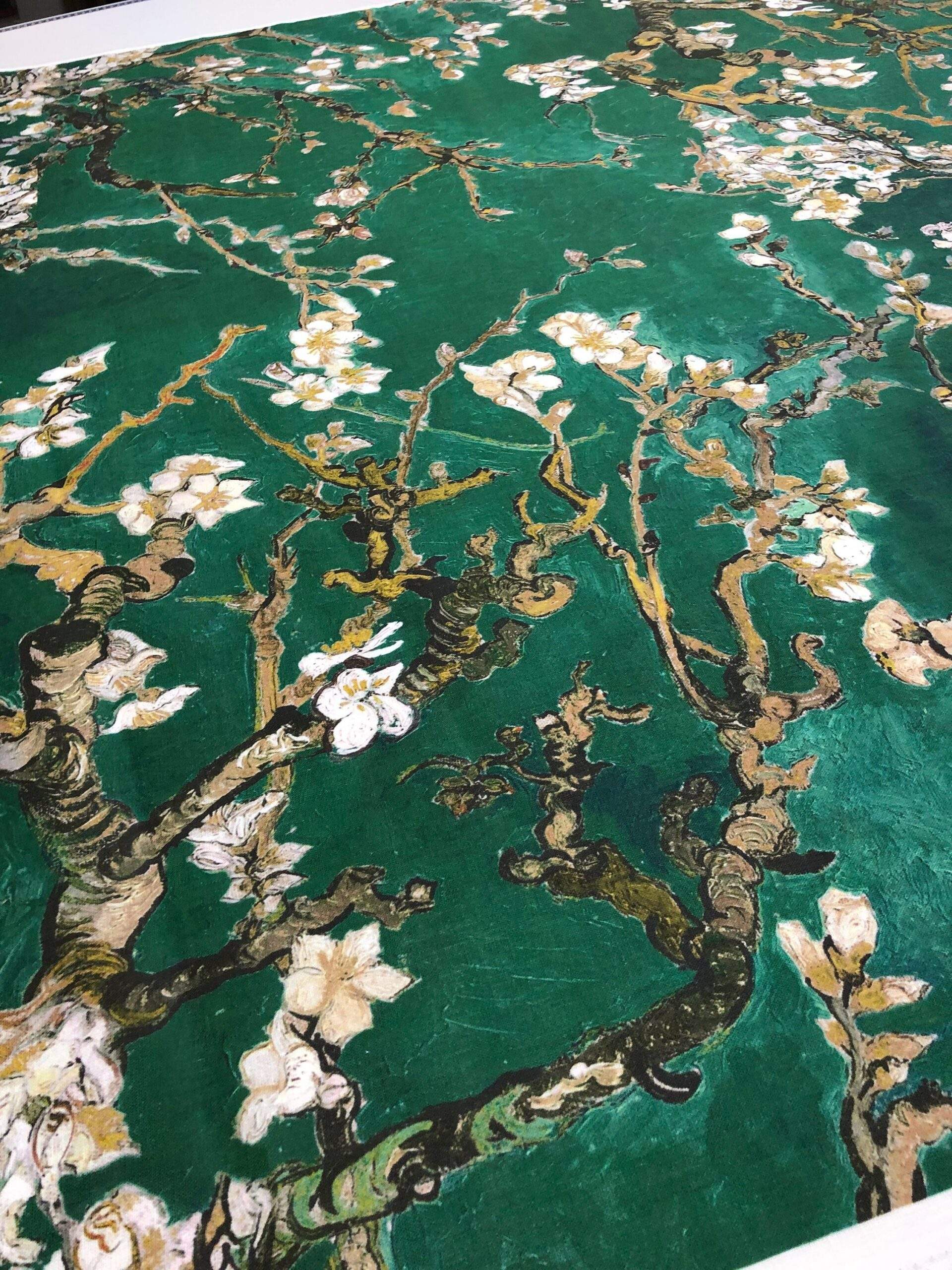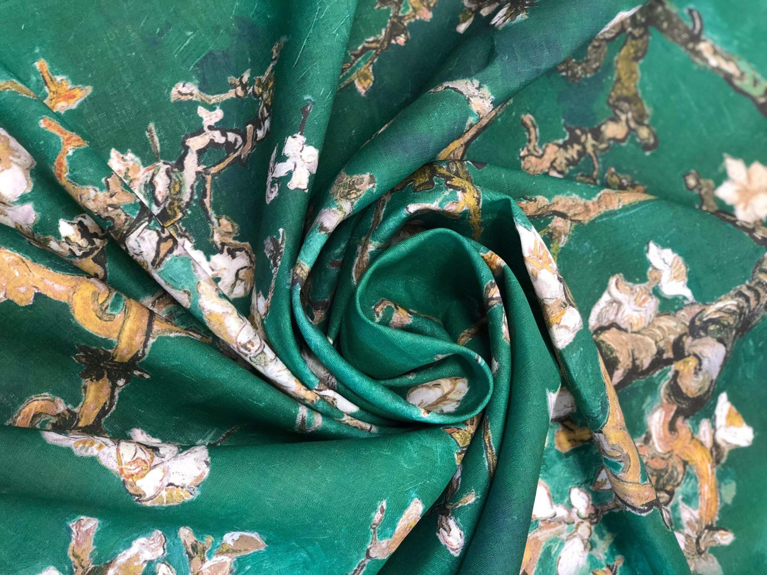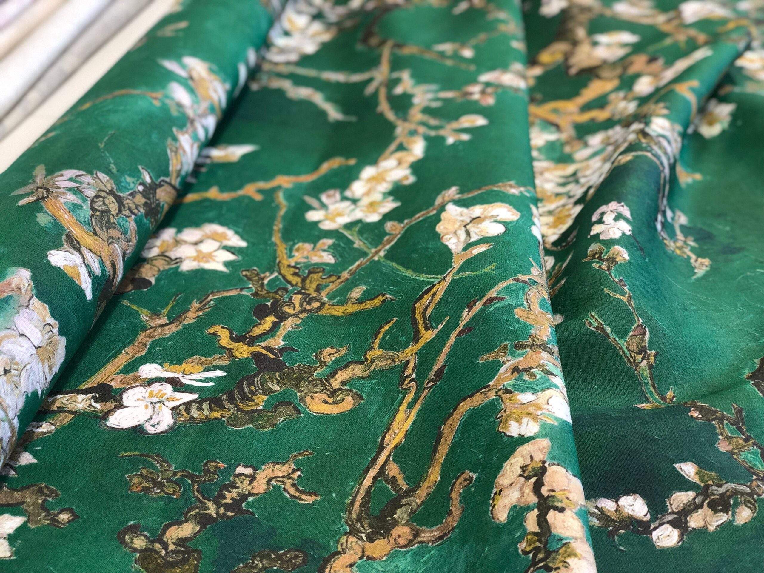 Linen fabric Vincent van Gogh “Almond Blossoms”. Emerald / Forest green colour.