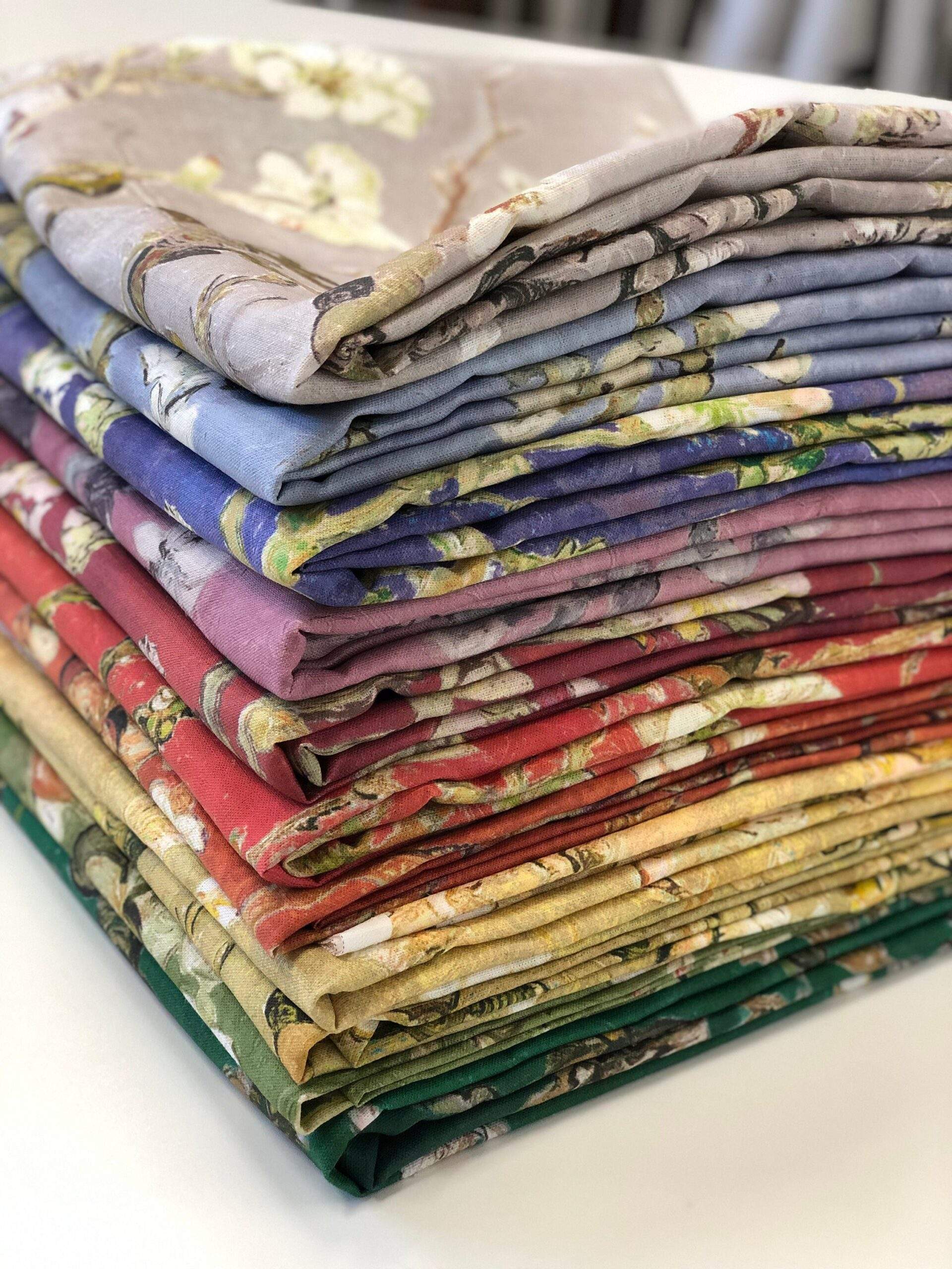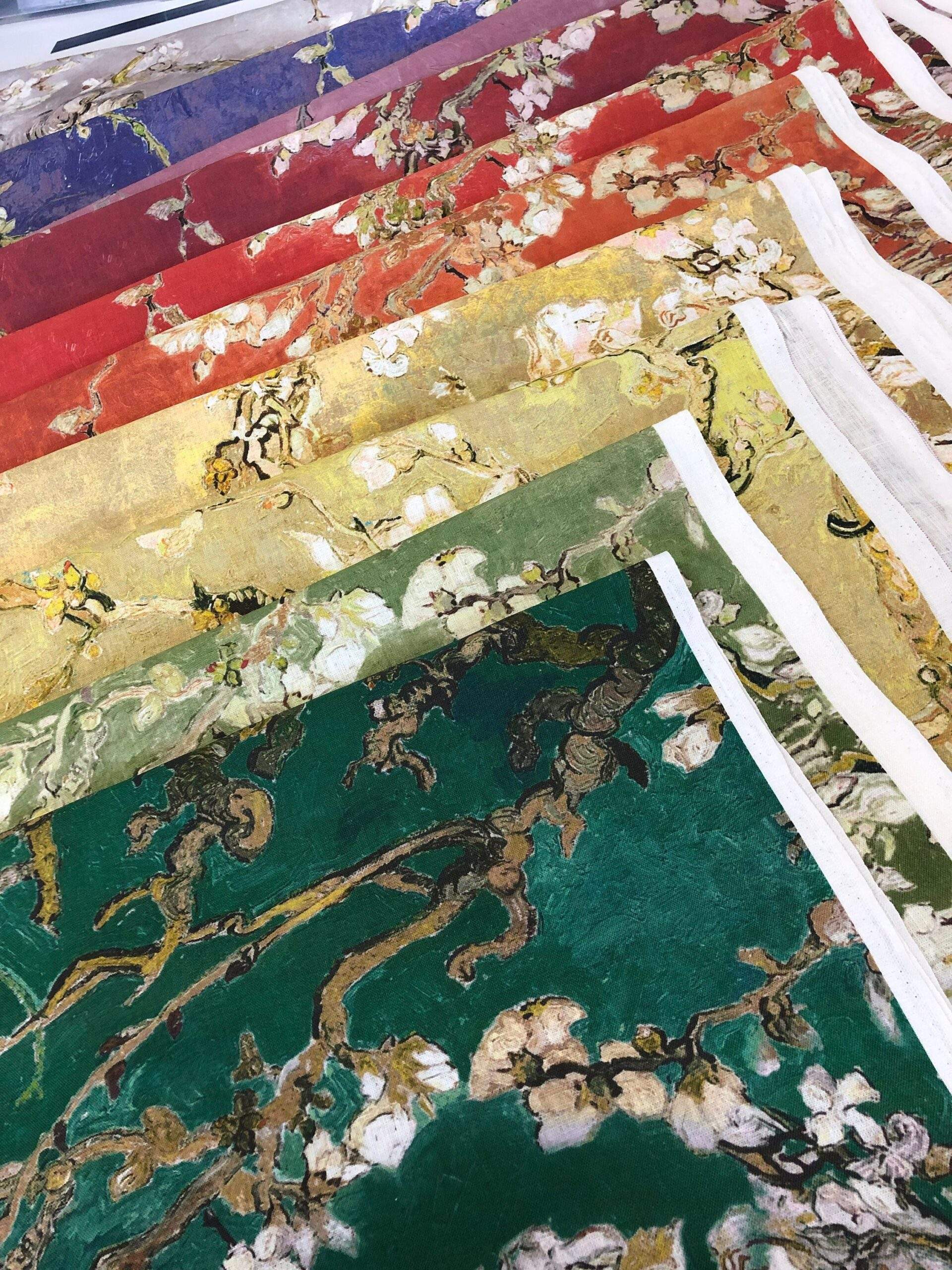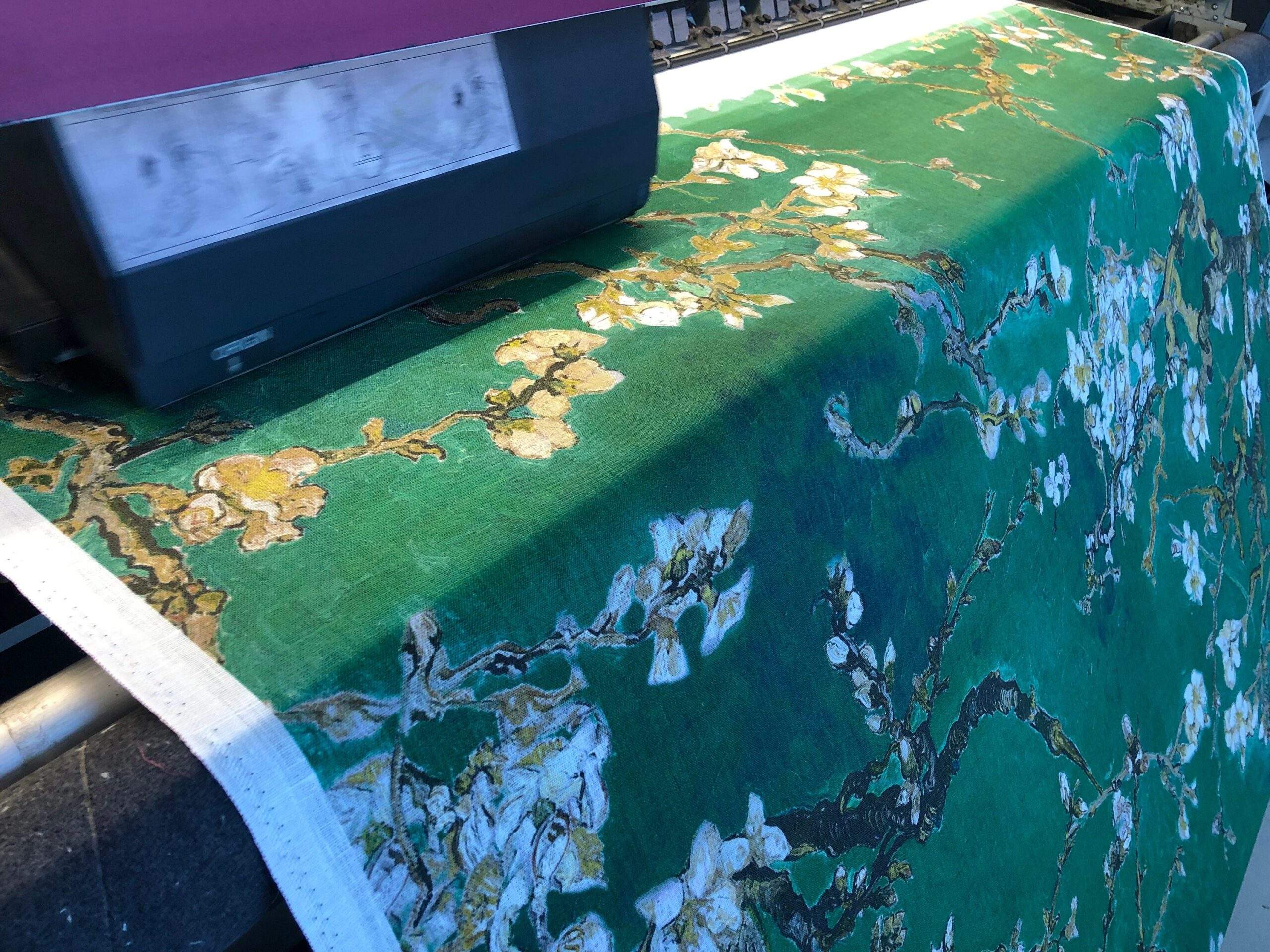 Linen fabric Vincent van Gogh “Almond Blossoms”. Emerald / Forest green colour.