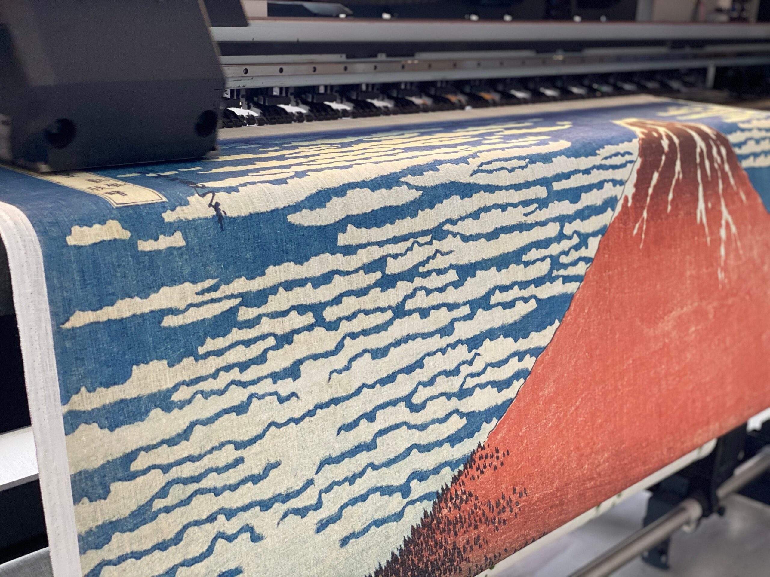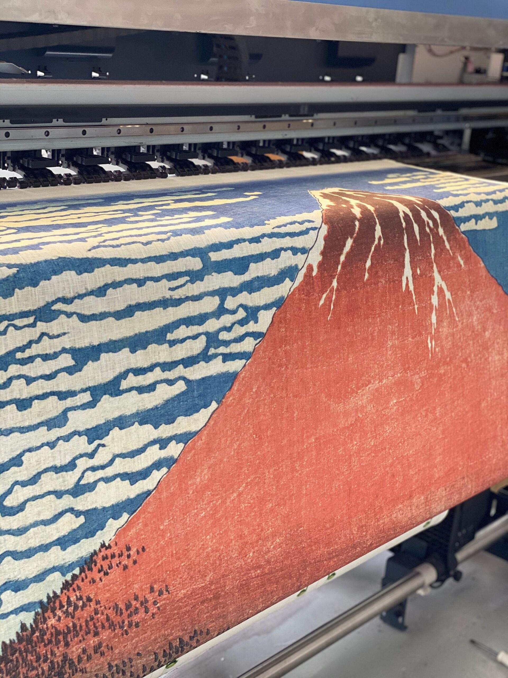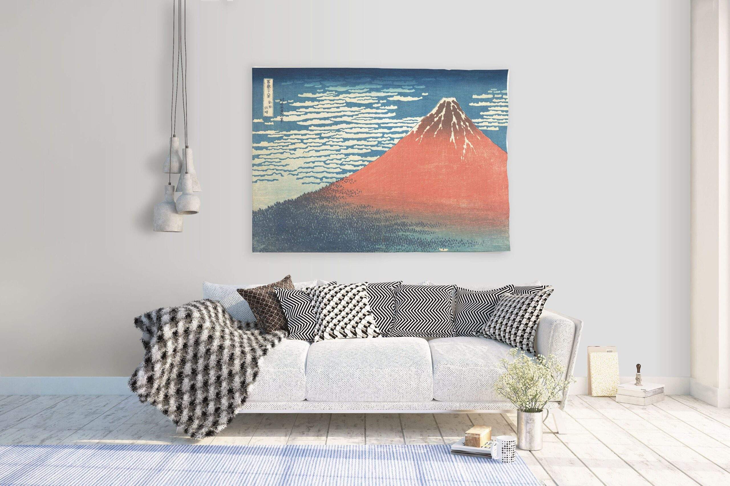 Wall tapestry “Fine Wind, Clear Morning”, also known as South Wind, Clear Sky or Red Fuji, by Japanese artist Hokusai, part of his Thirty-six Views of Mount Fuji series, dating from c. 1830 to 1832.
