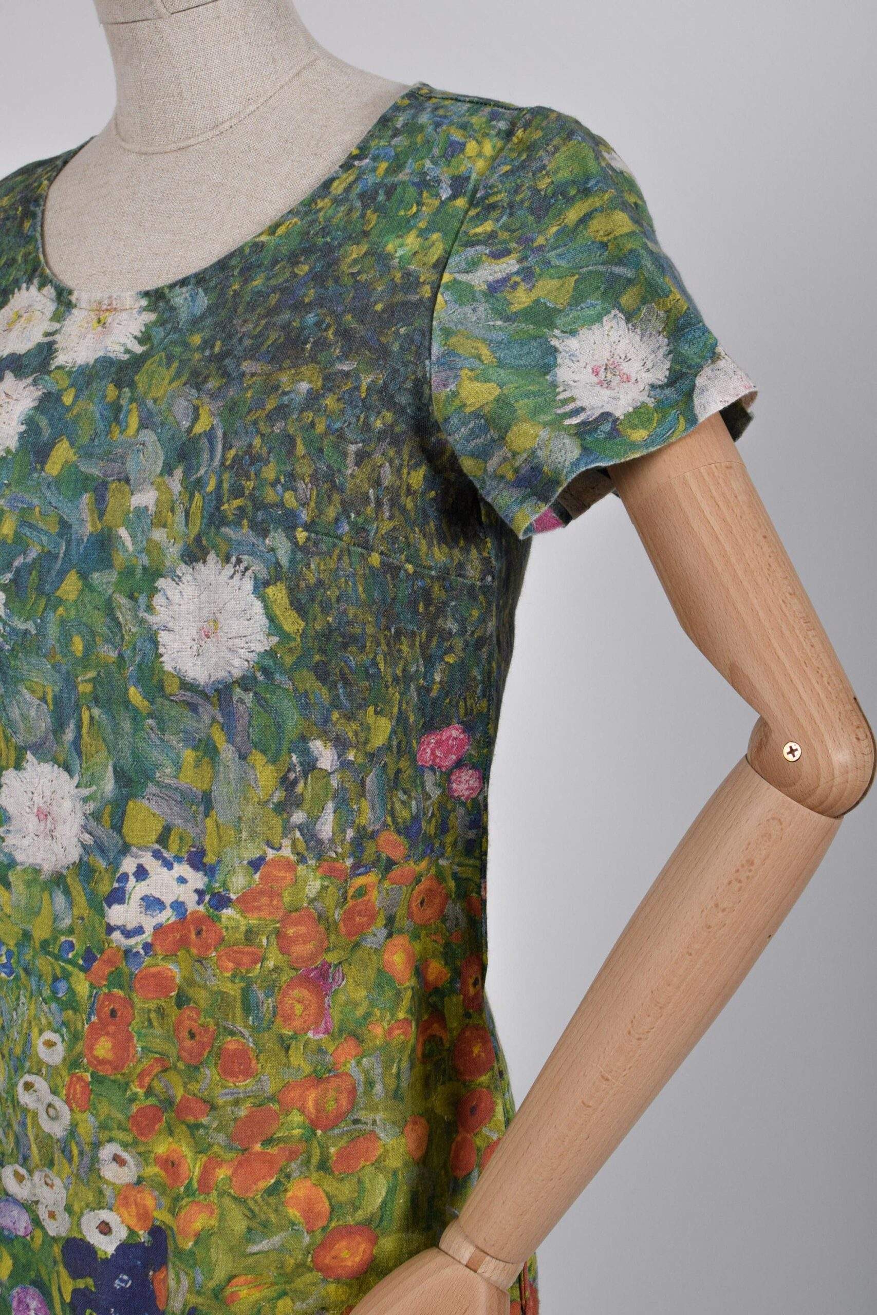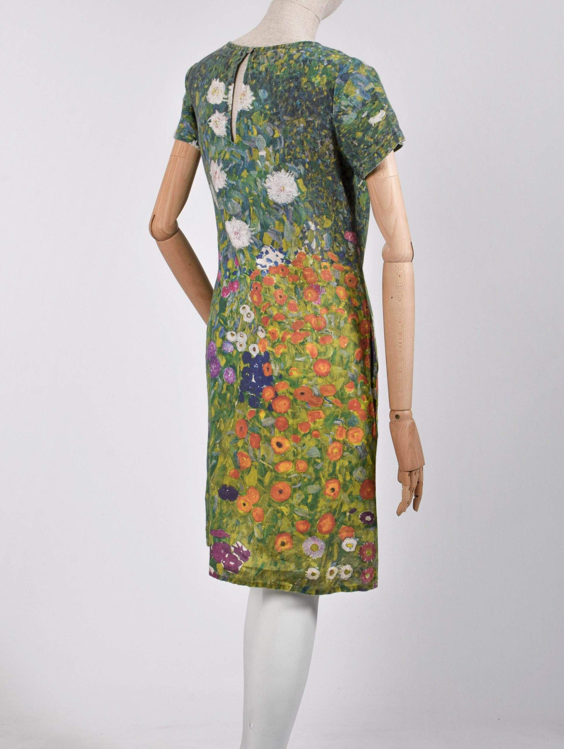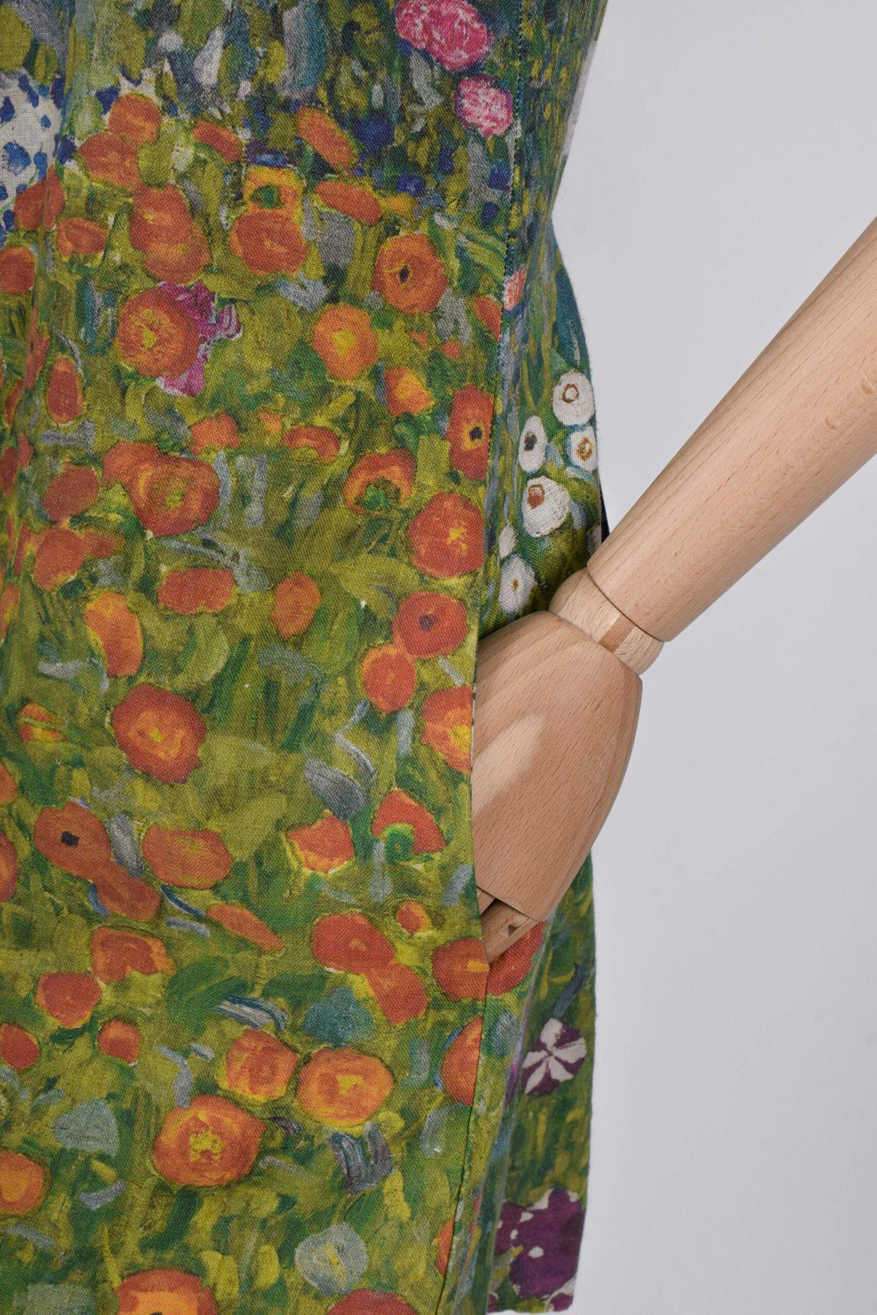 Gustav Klimt “Flower Garden” linen women dress with short sleeves and side pockets.