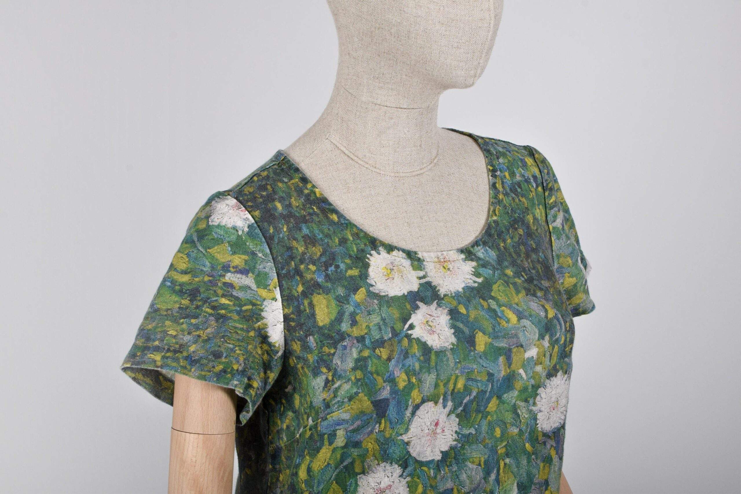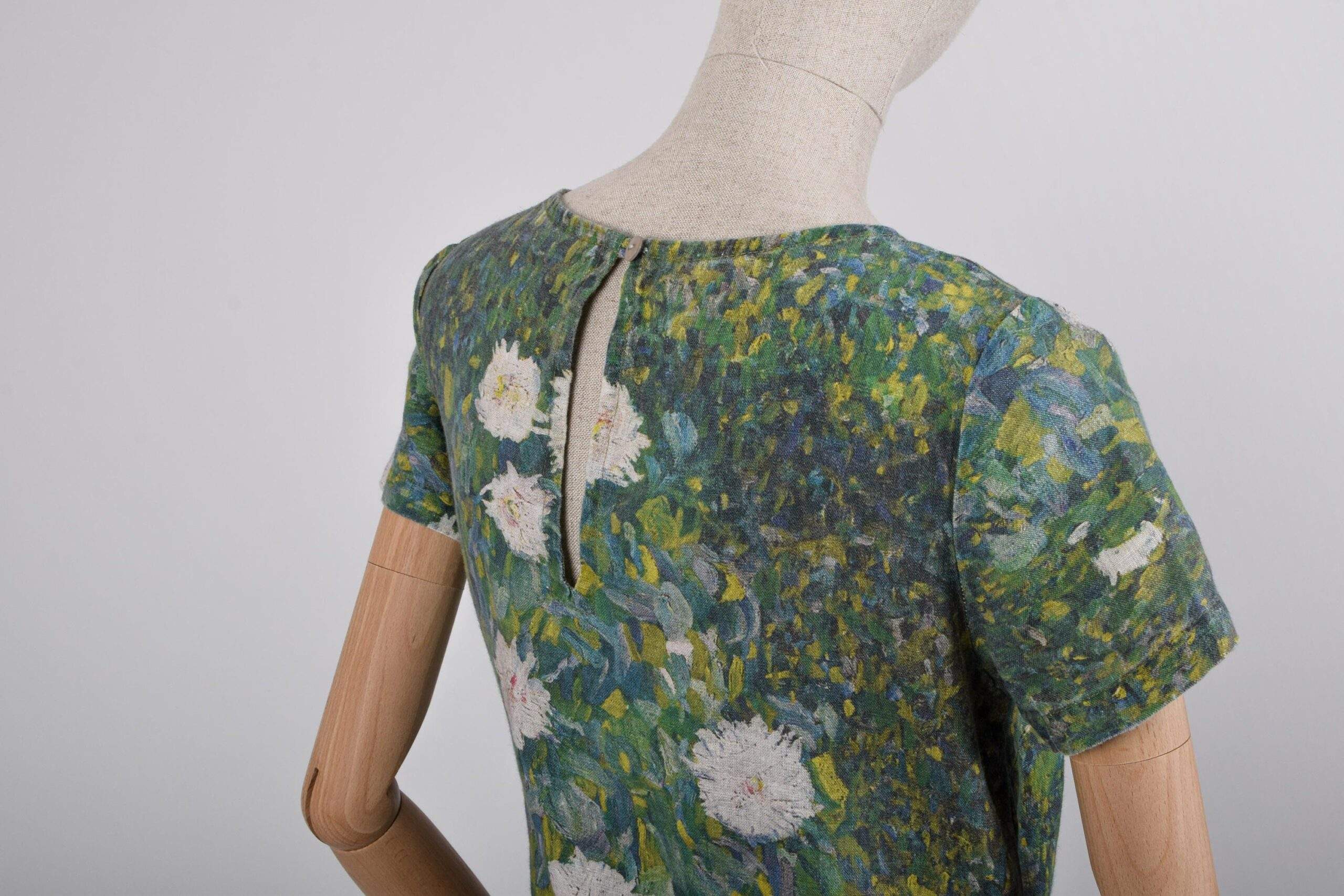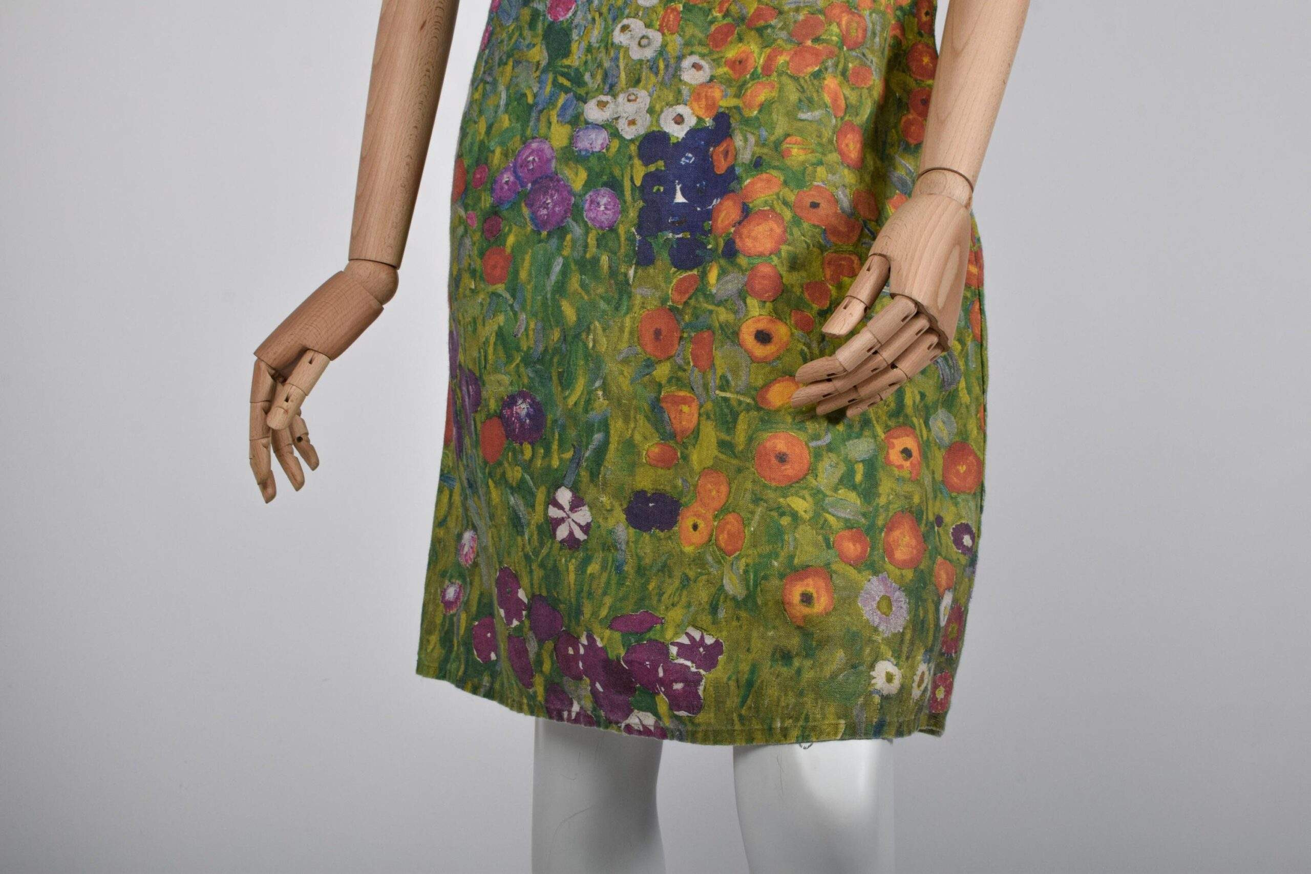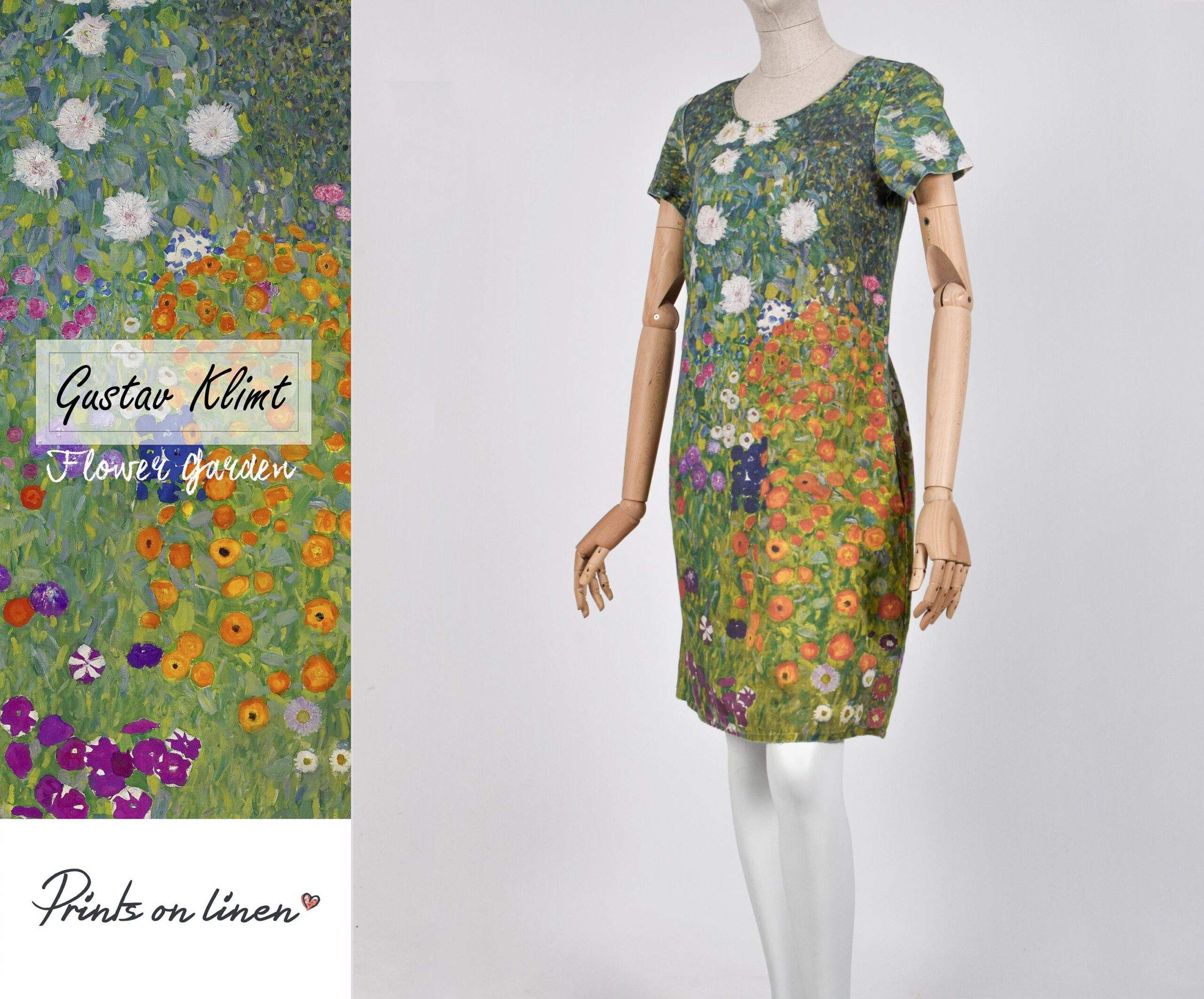 Gustav Klimt “Flower Garden” linen women dress with short sleeves and side pockets.