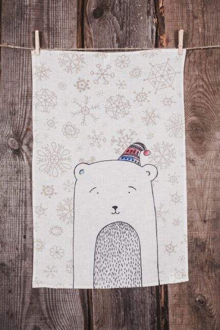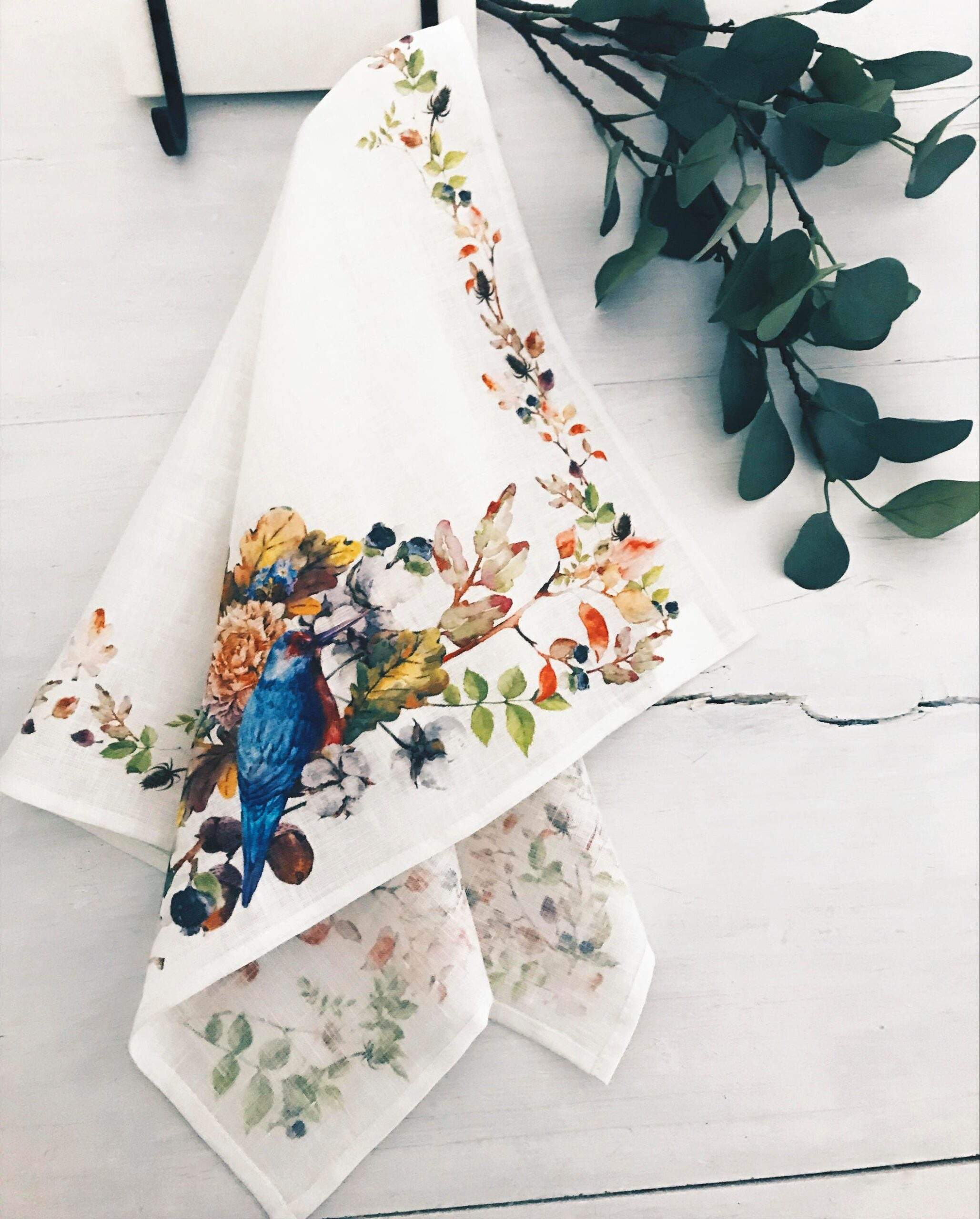 Linen kitchen towel with autumn leaves and bird pattern. 100% Natural white linen, hand painted pattern, personalized towel for home decoration, with hook.