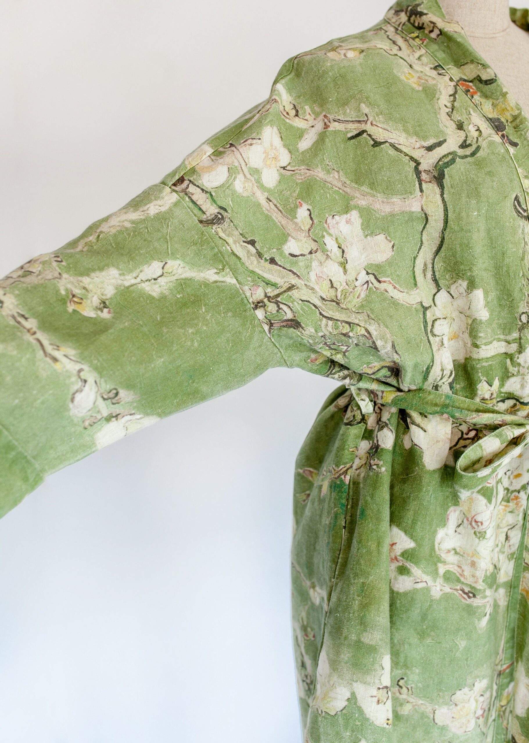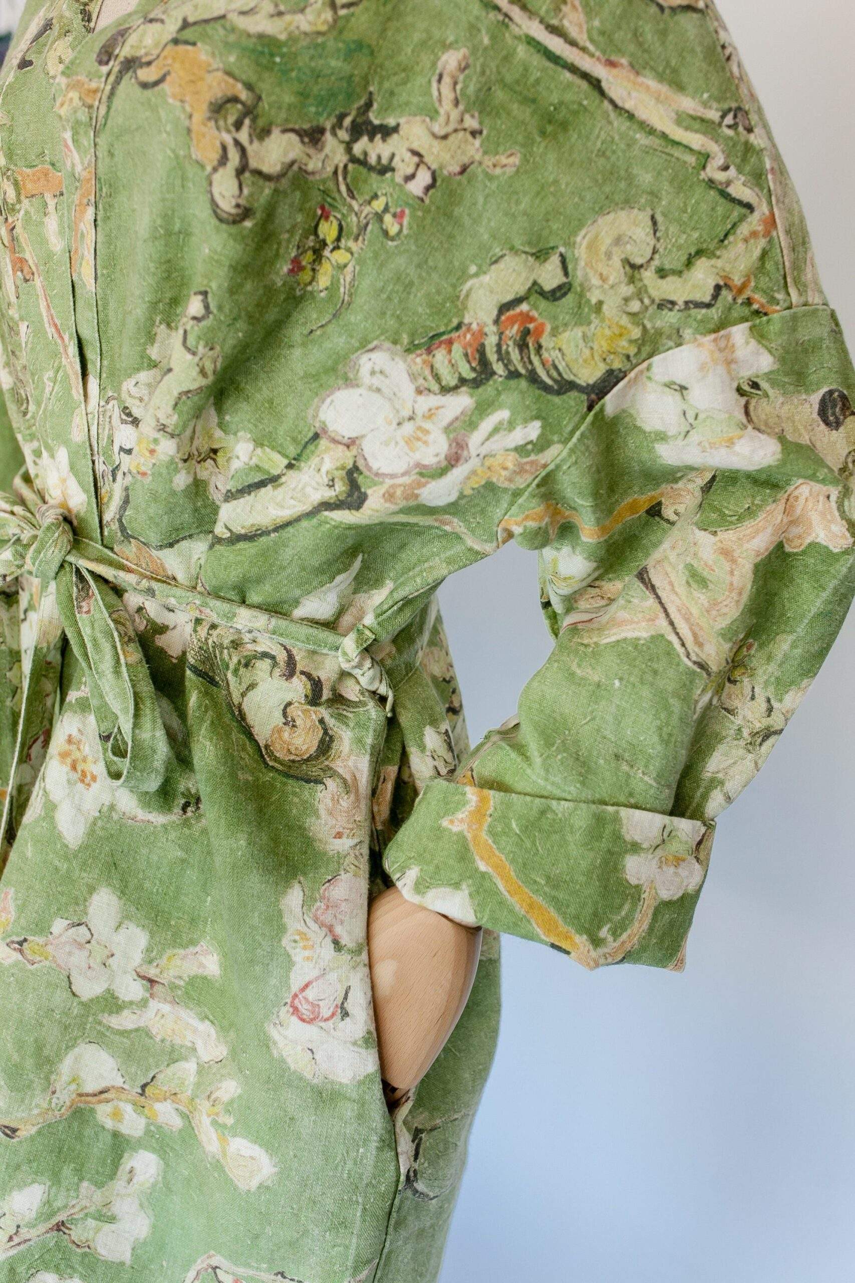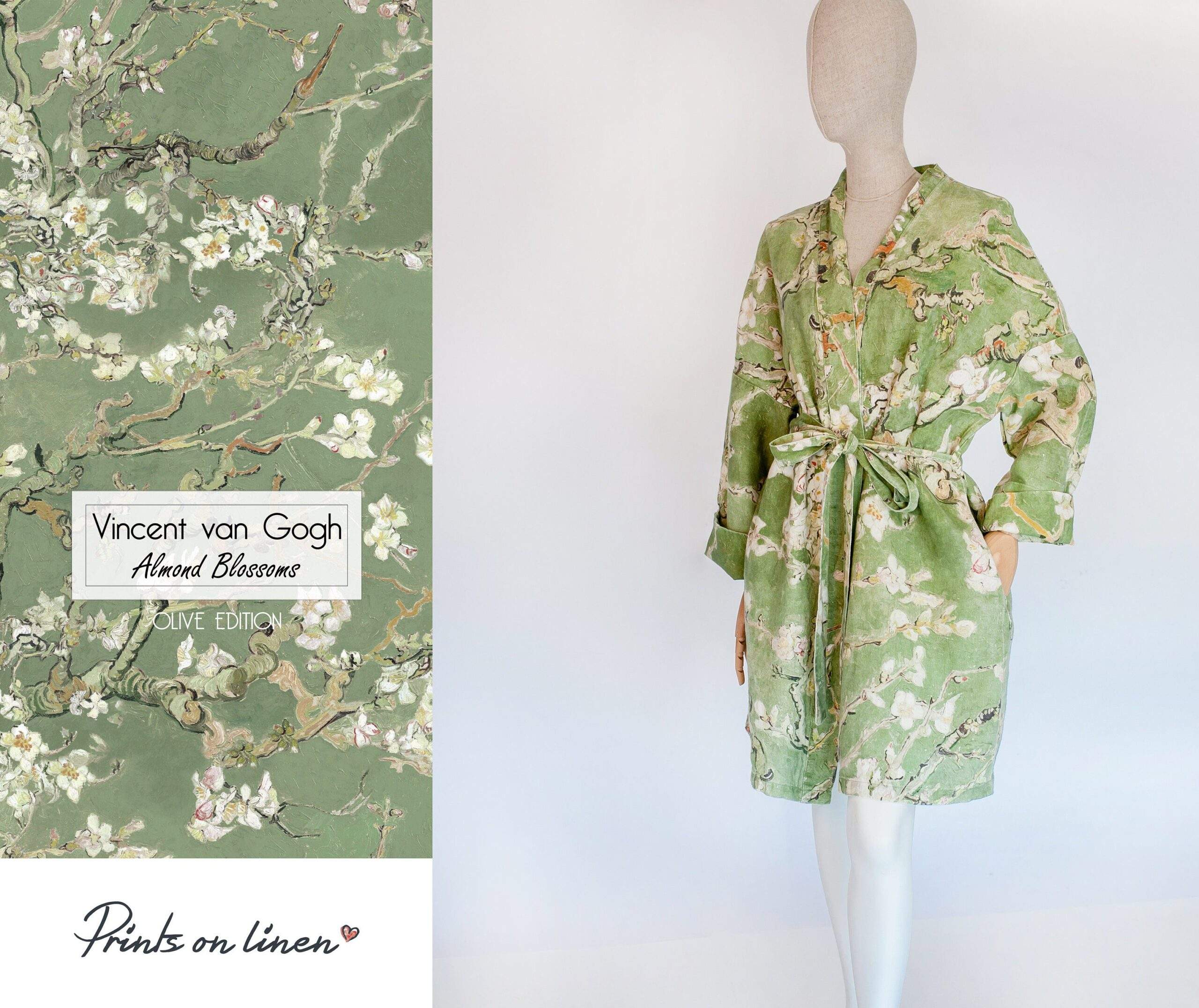Linen bathrobe Vincent Van Gogh “Almond blossom” with asymmetric collar. Olive colour edition. Robe with side pockets.