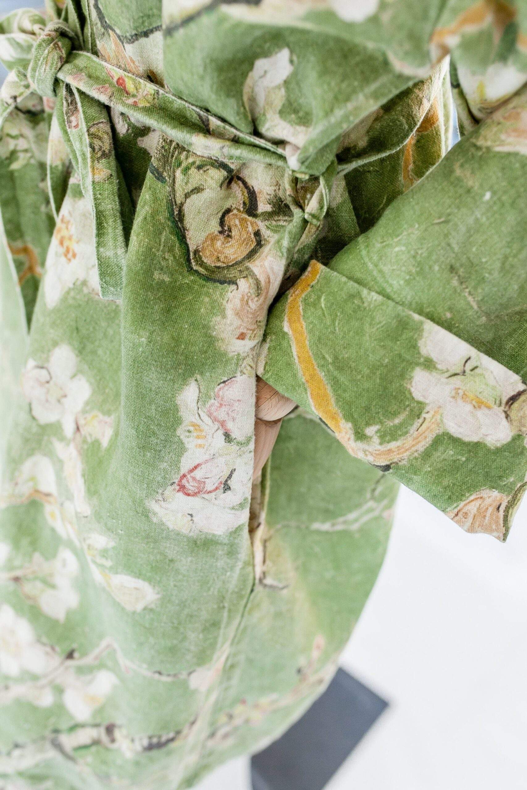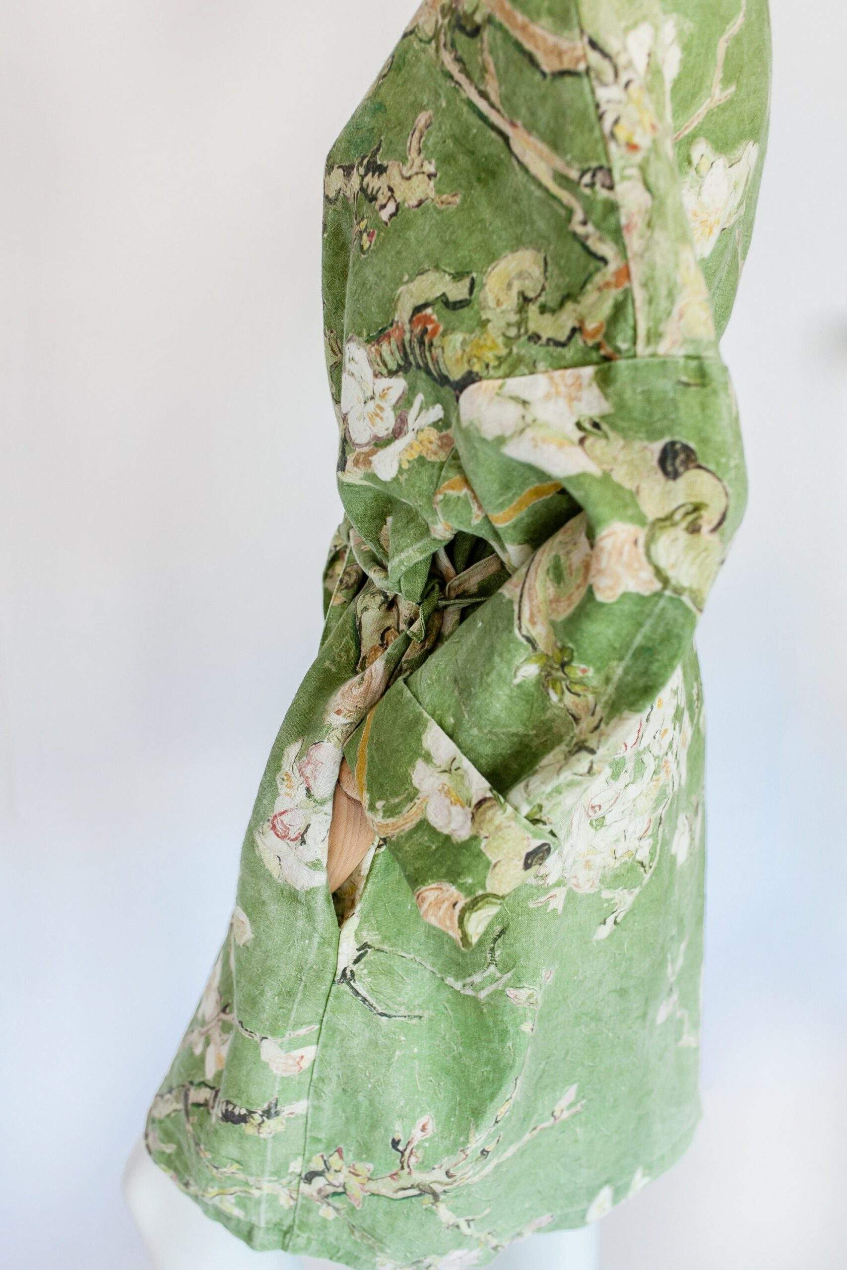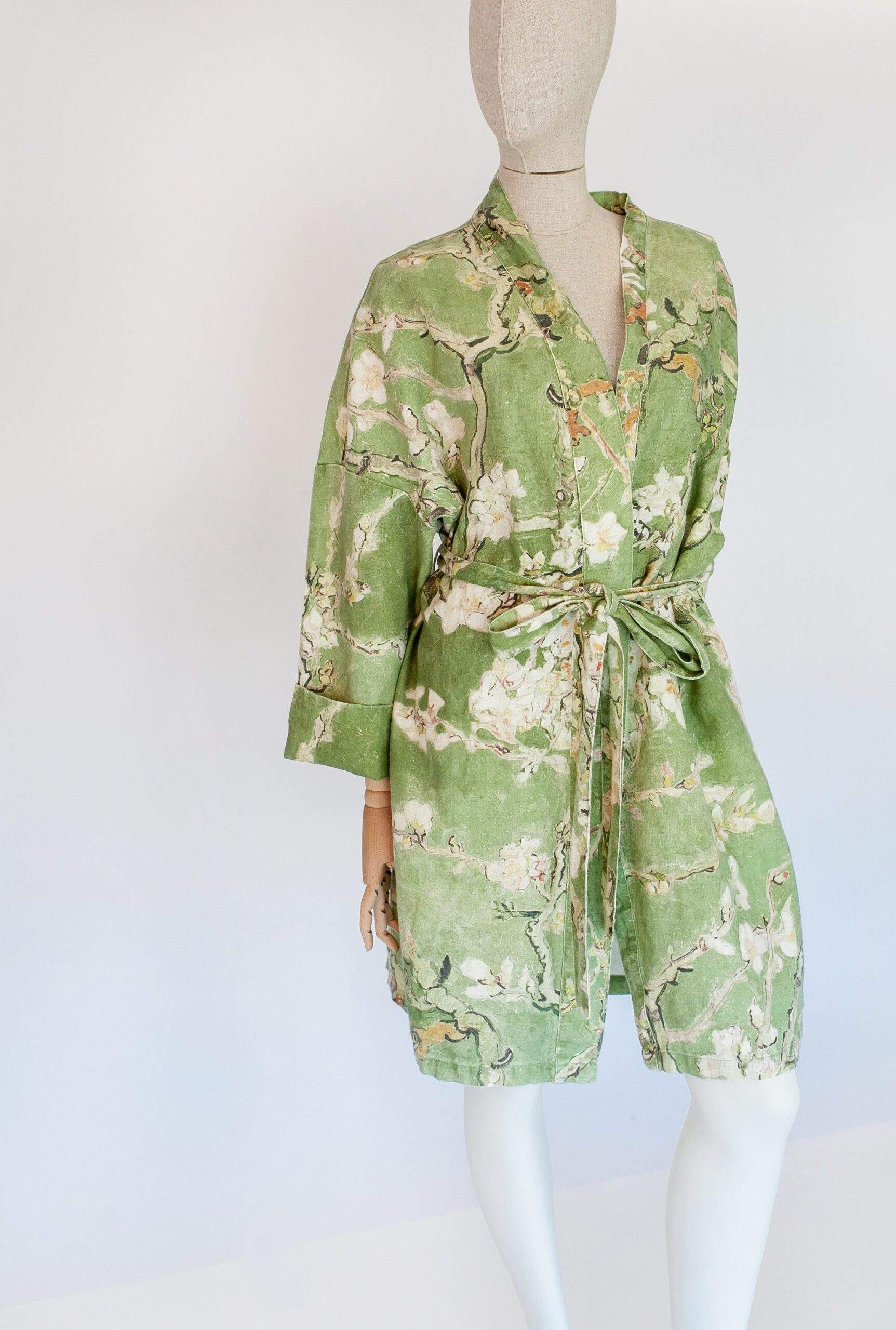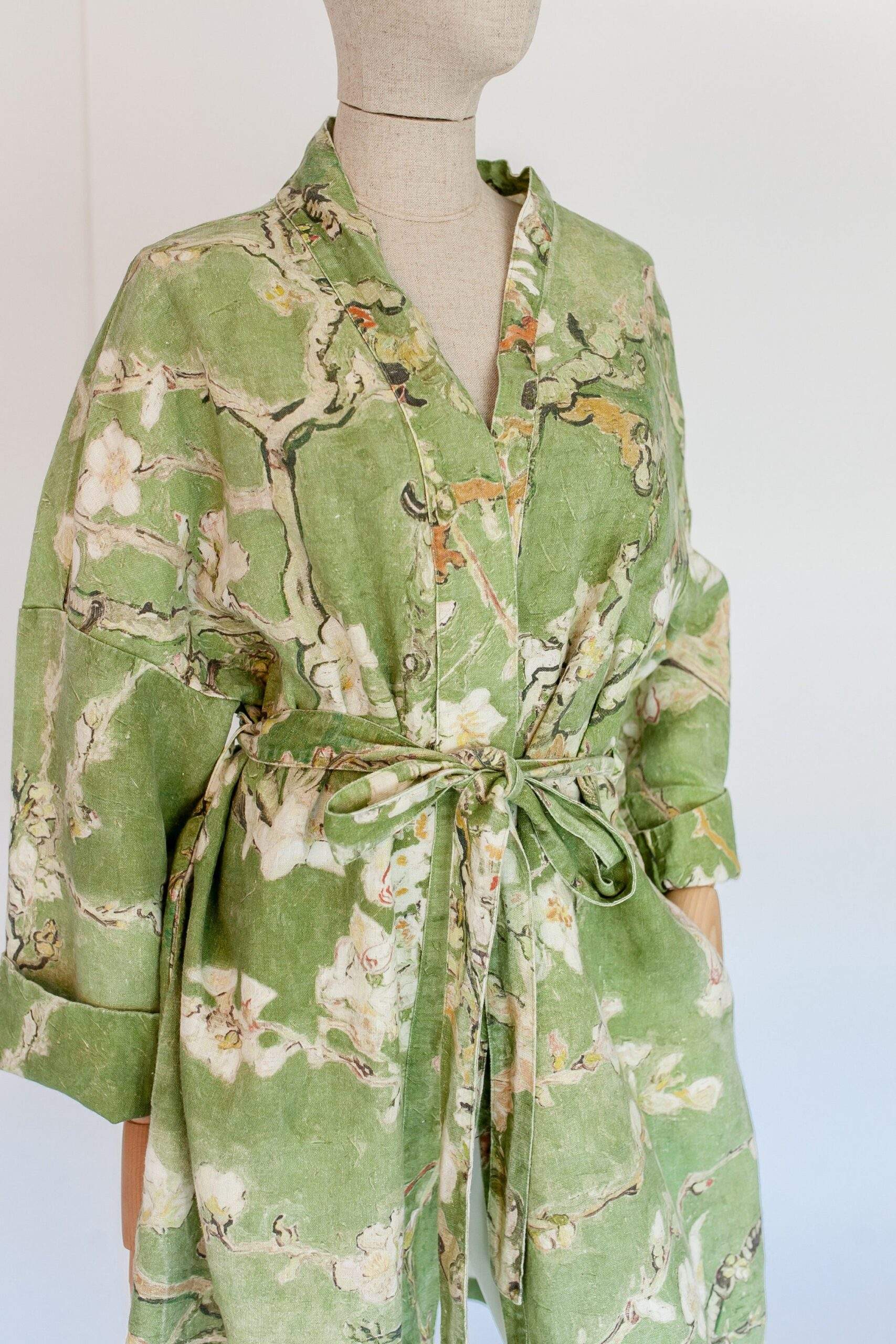 Linen bathrobe Vincent Van Gogh “Almond blossom” with asymmetric collar. Olive colour edition. Robe with side pockets.