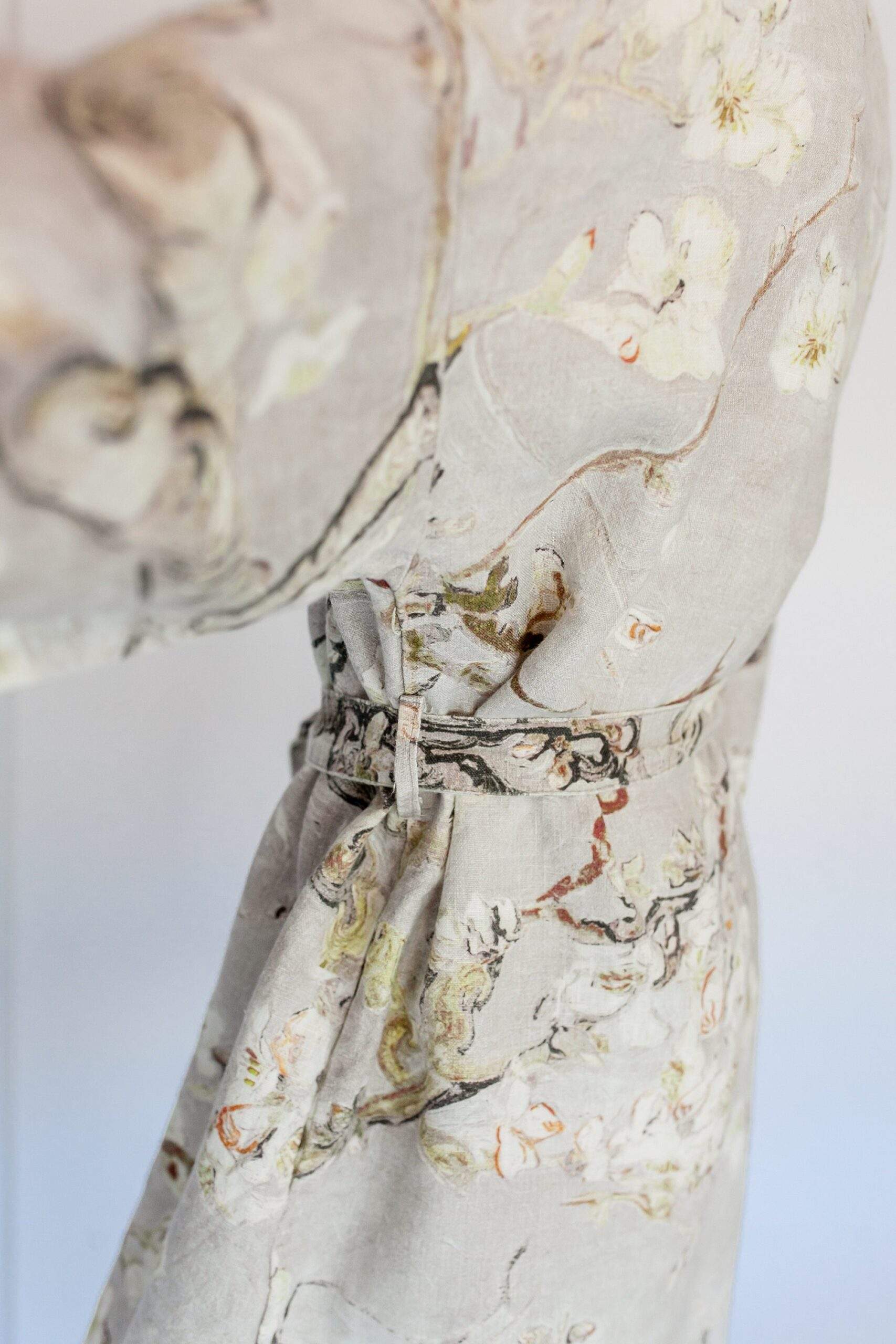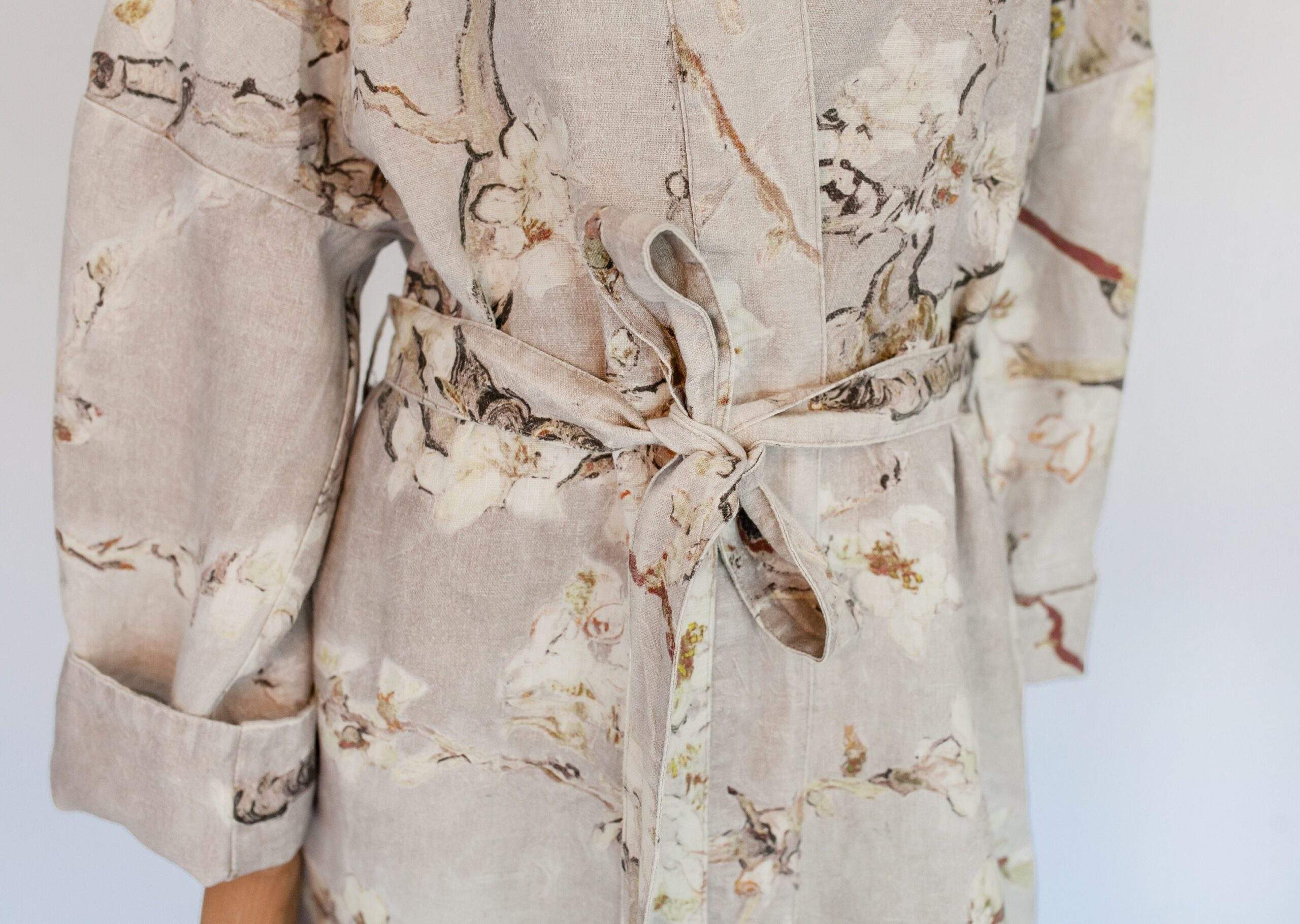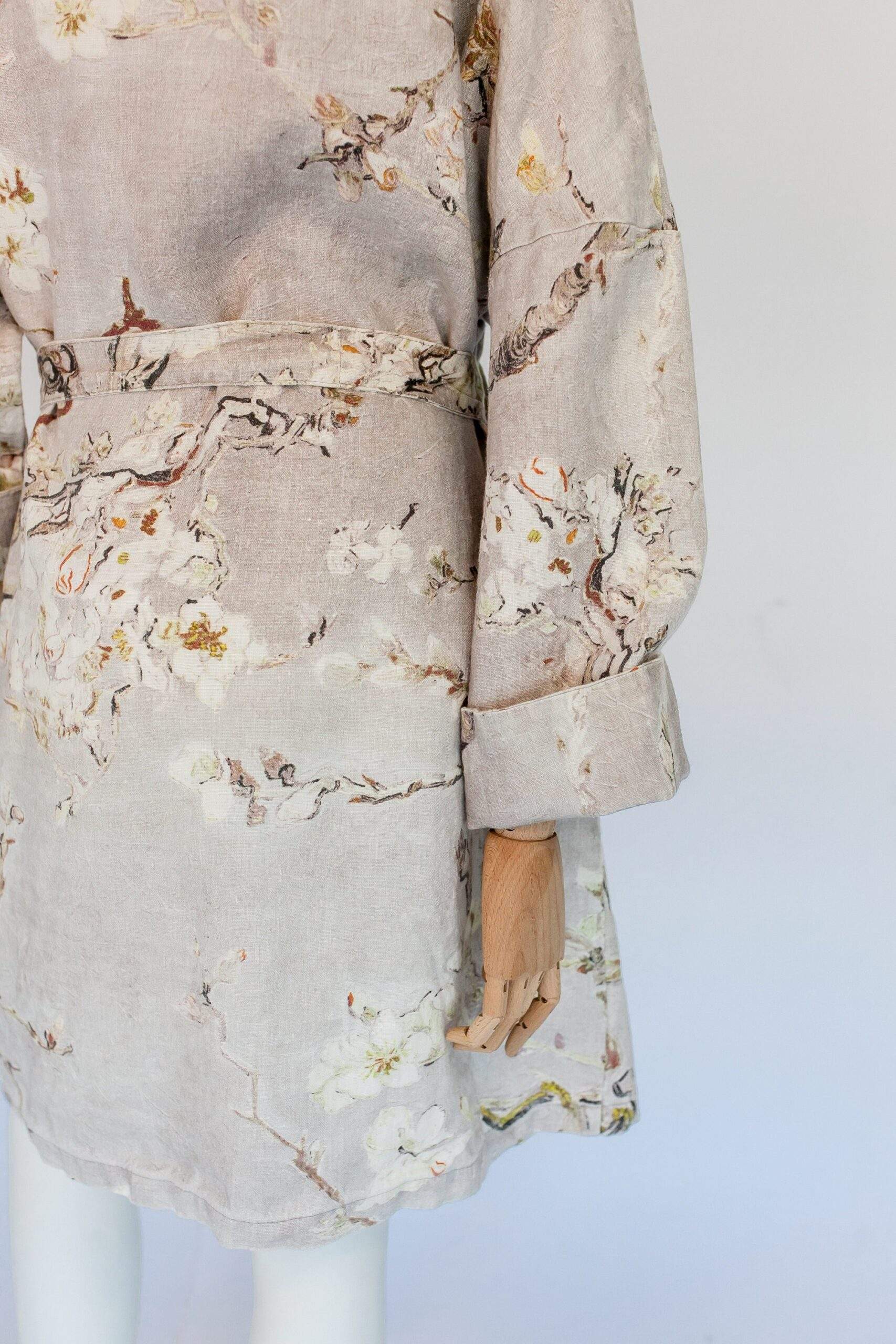 Women linen bathrobe Vincent Van Gogh “Almond blossom” with asymmetric collar. Ash grey color edition.