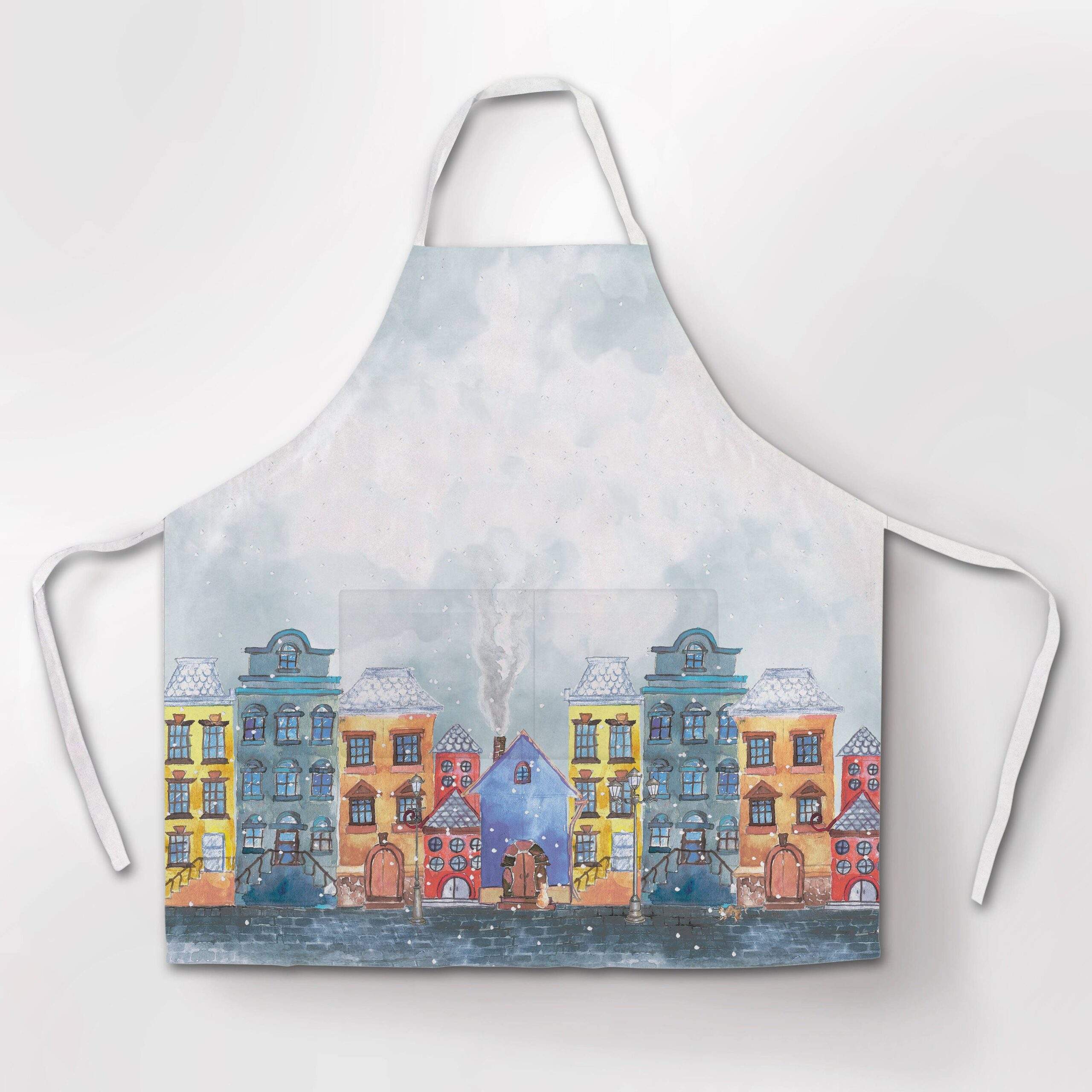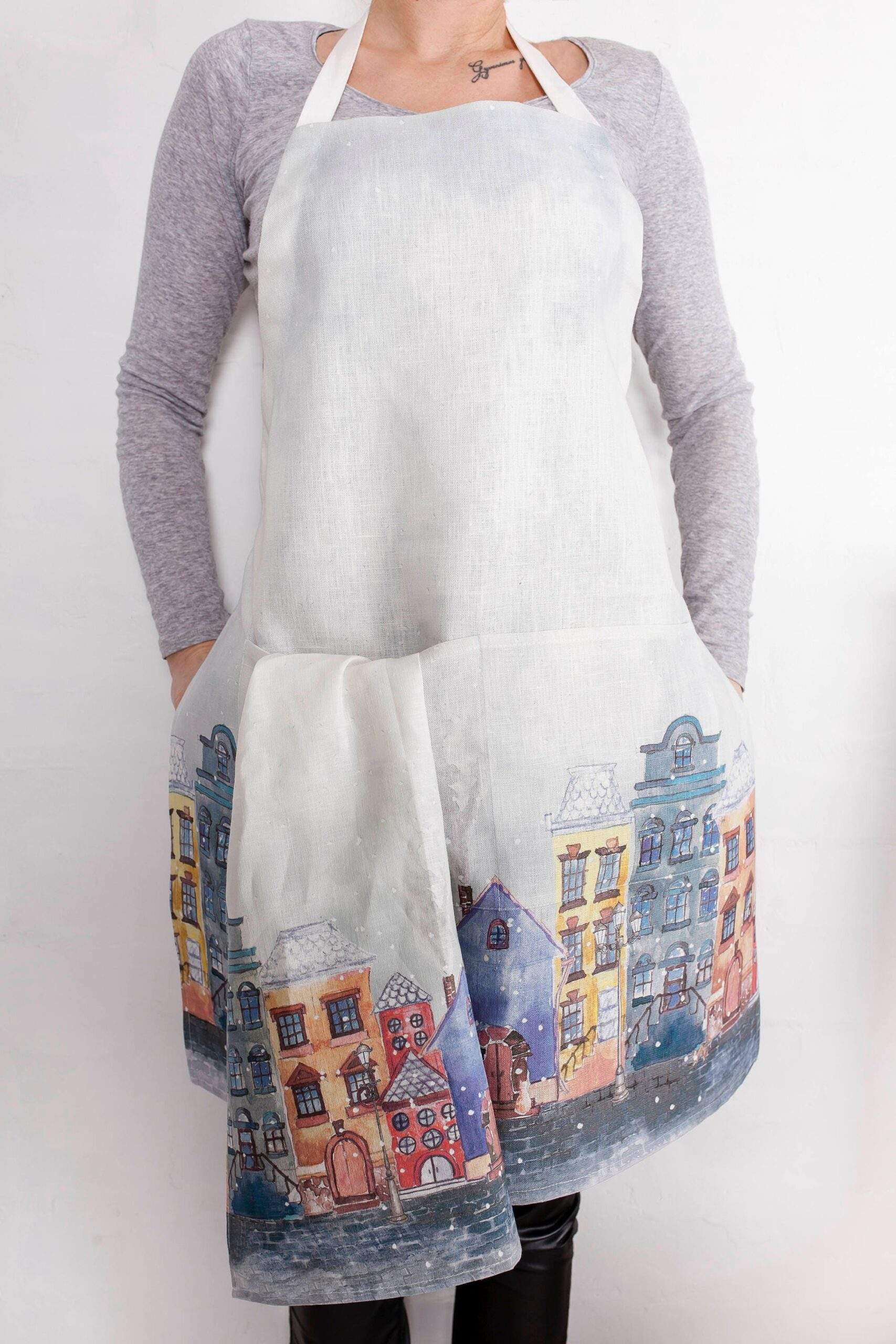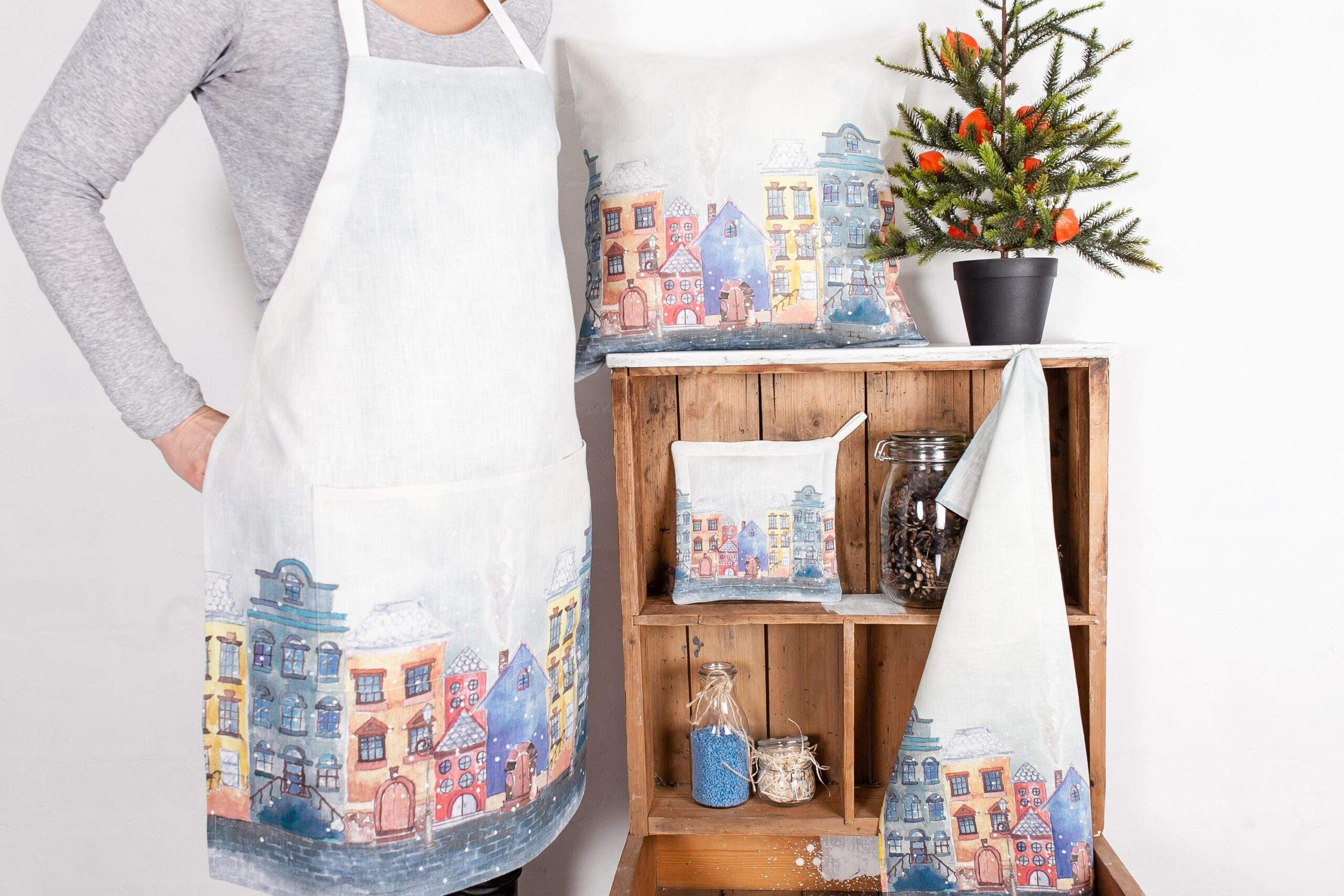 Linen Apron made of 100% organic linen with Winter city print. Free size linen apron with pocket. Cross back apron. Nice gift idea for women or men, baking gift, housewarming gift, pinafore, linen pinafore. Custom apron (We can write your text on this apron).