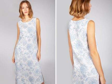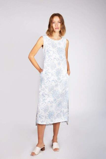 Pattern are on both dress sides, sleeveless dress with pockets.