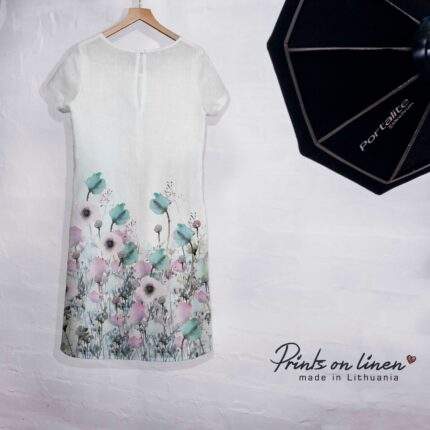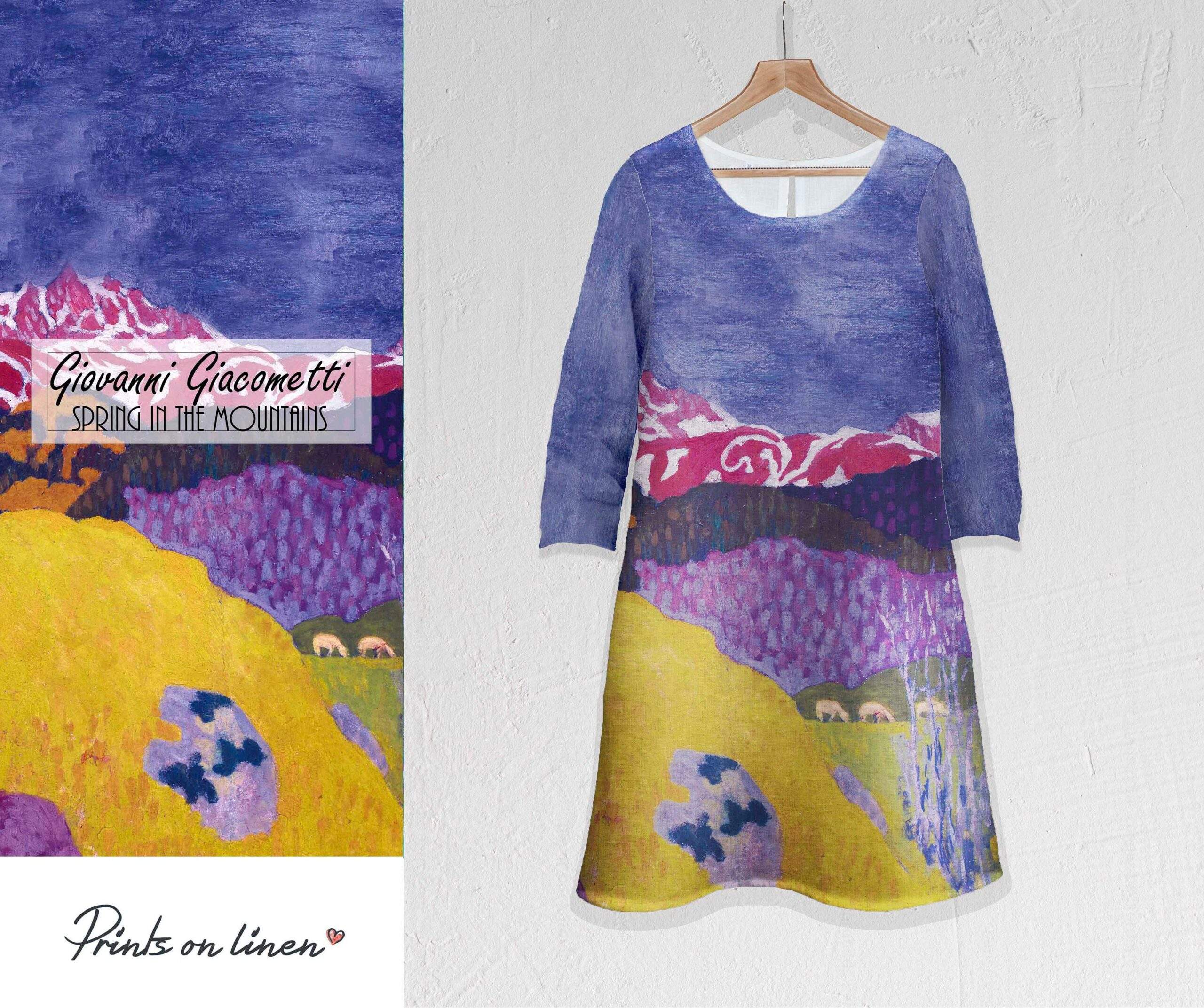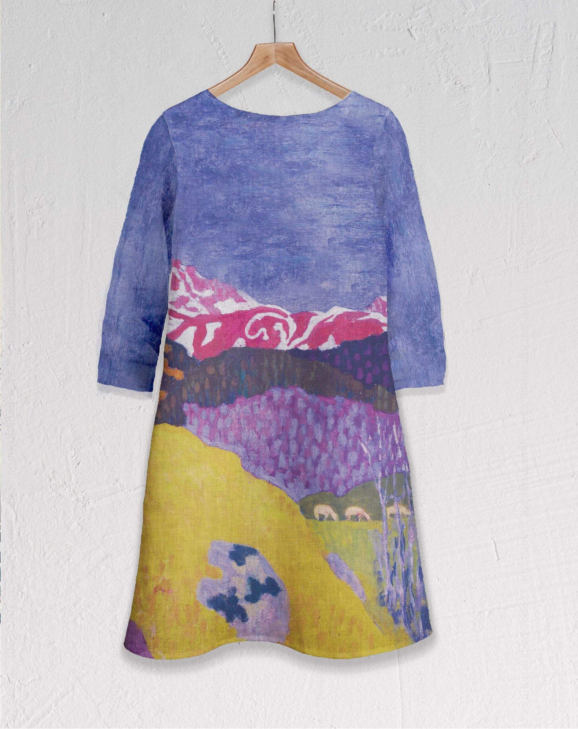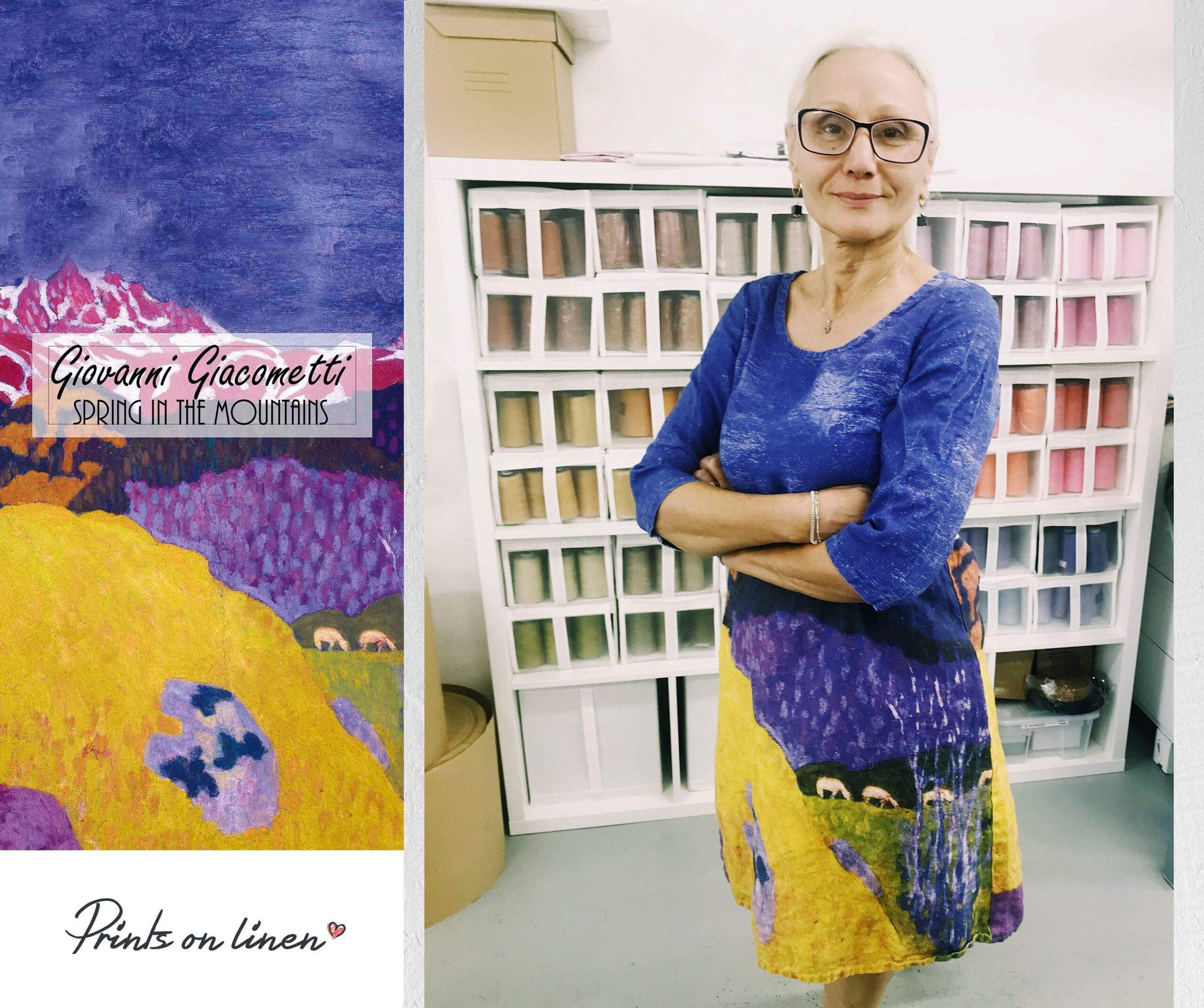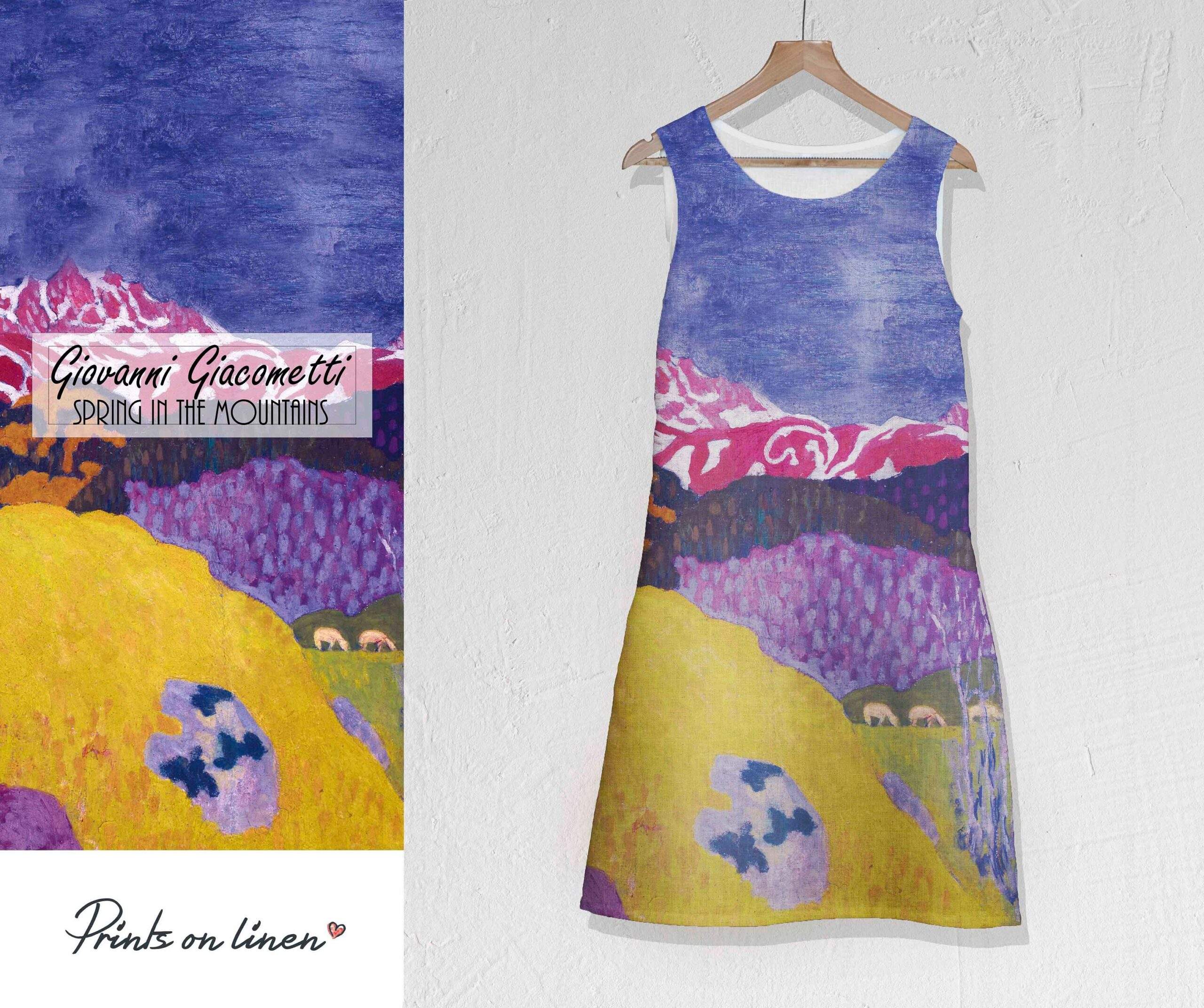 Linen dress, print inspired by Giovanni Giacometti artwork “Spring in the mountains” (print is on the both dress sides). We have THREE designs: sleeveless dress, dress with short sleeve and 3/4 sleeve. This dress have two deep pockets.