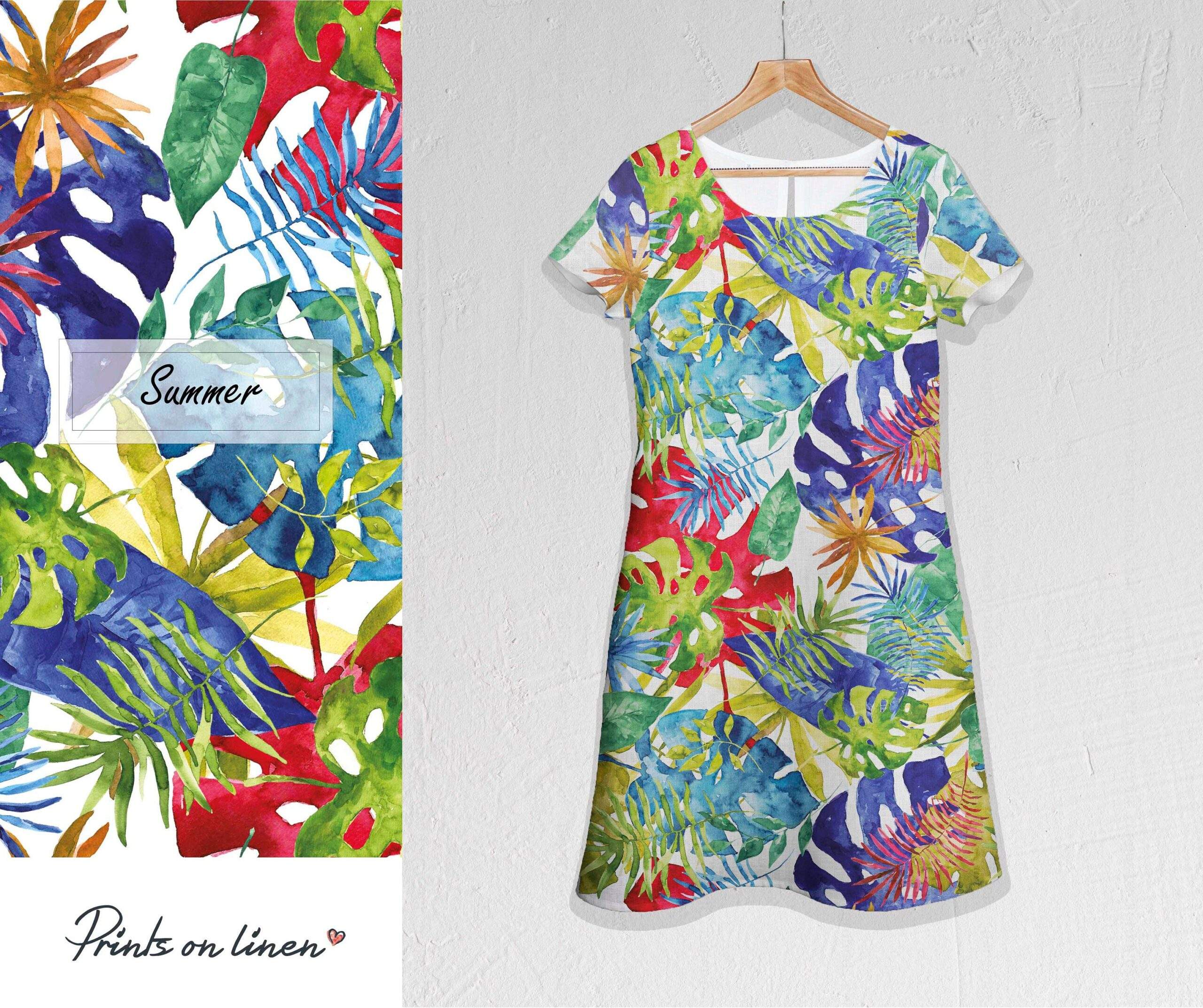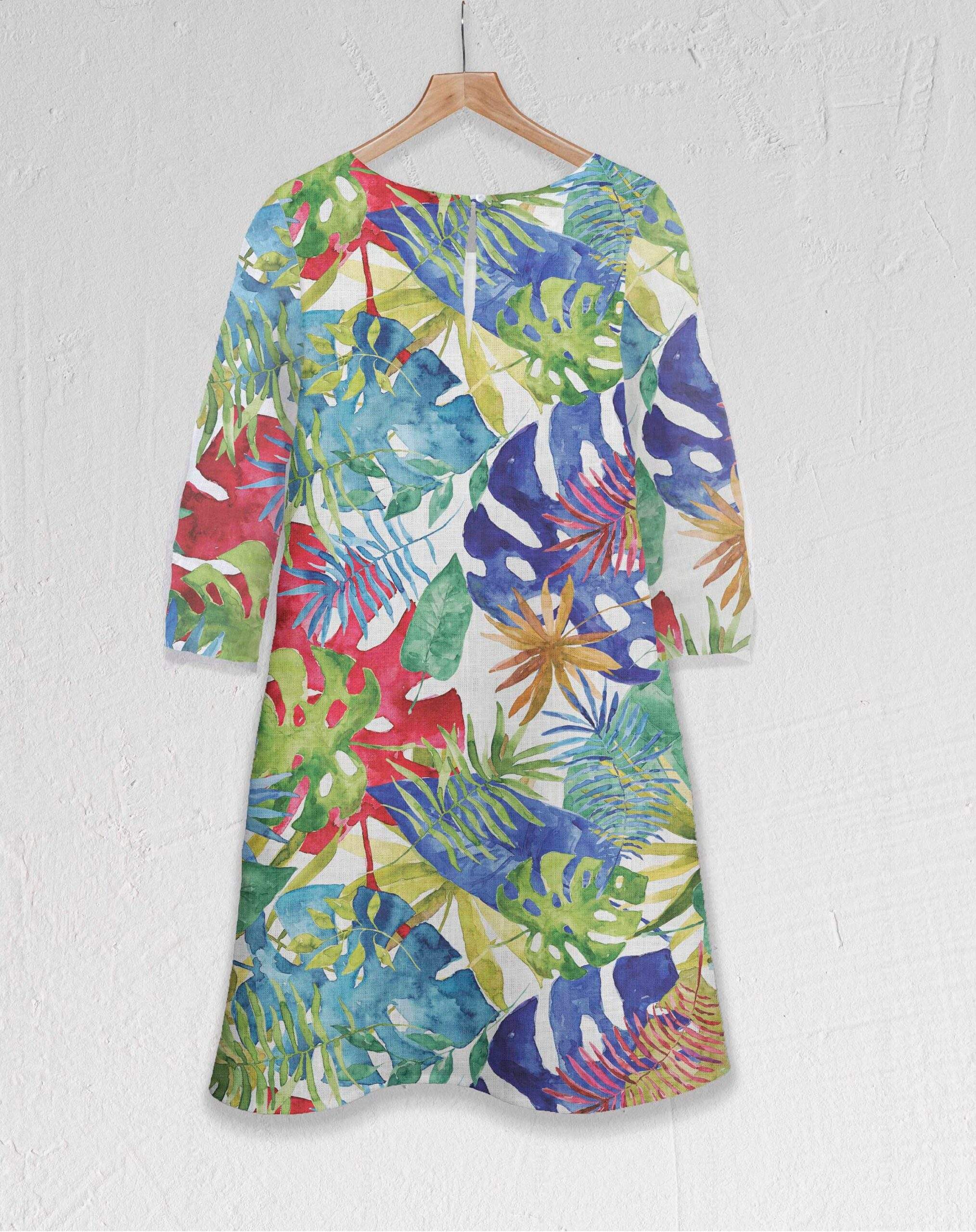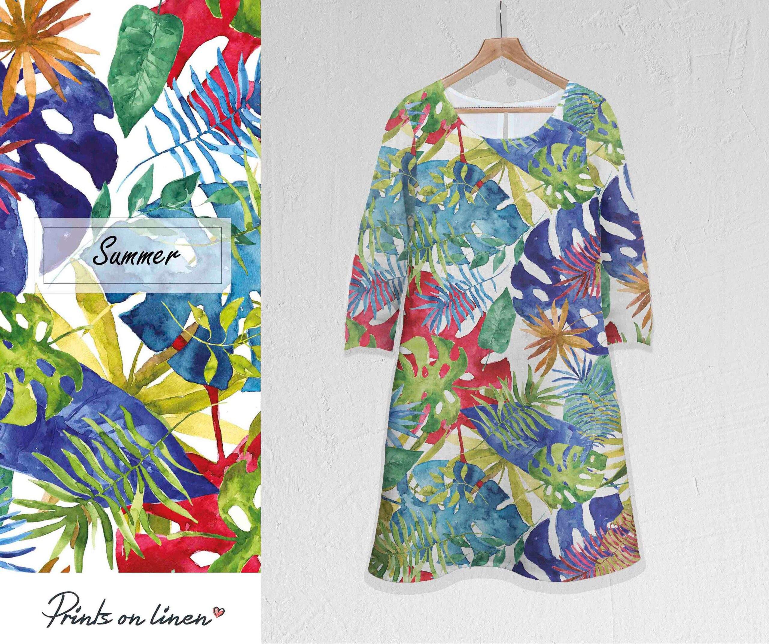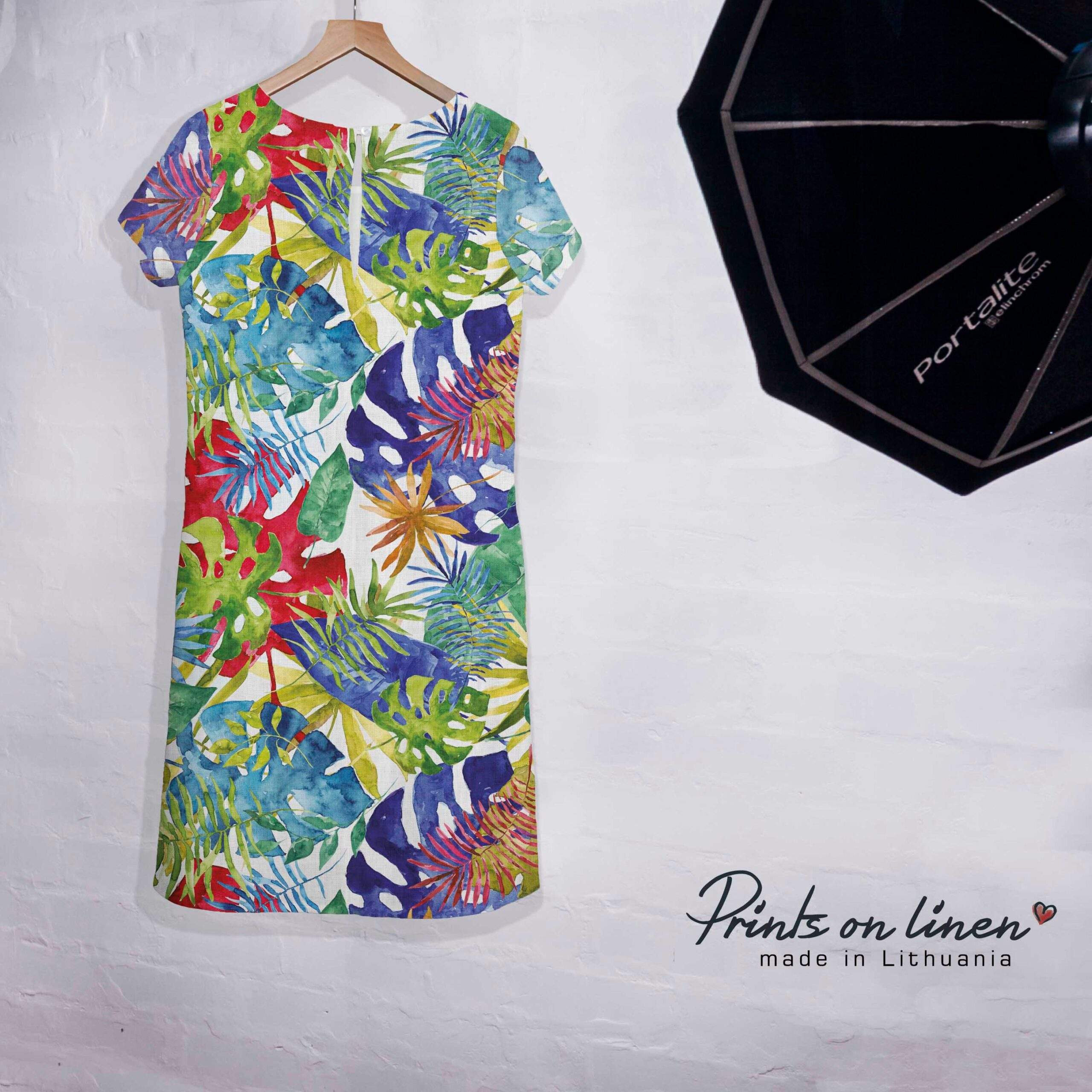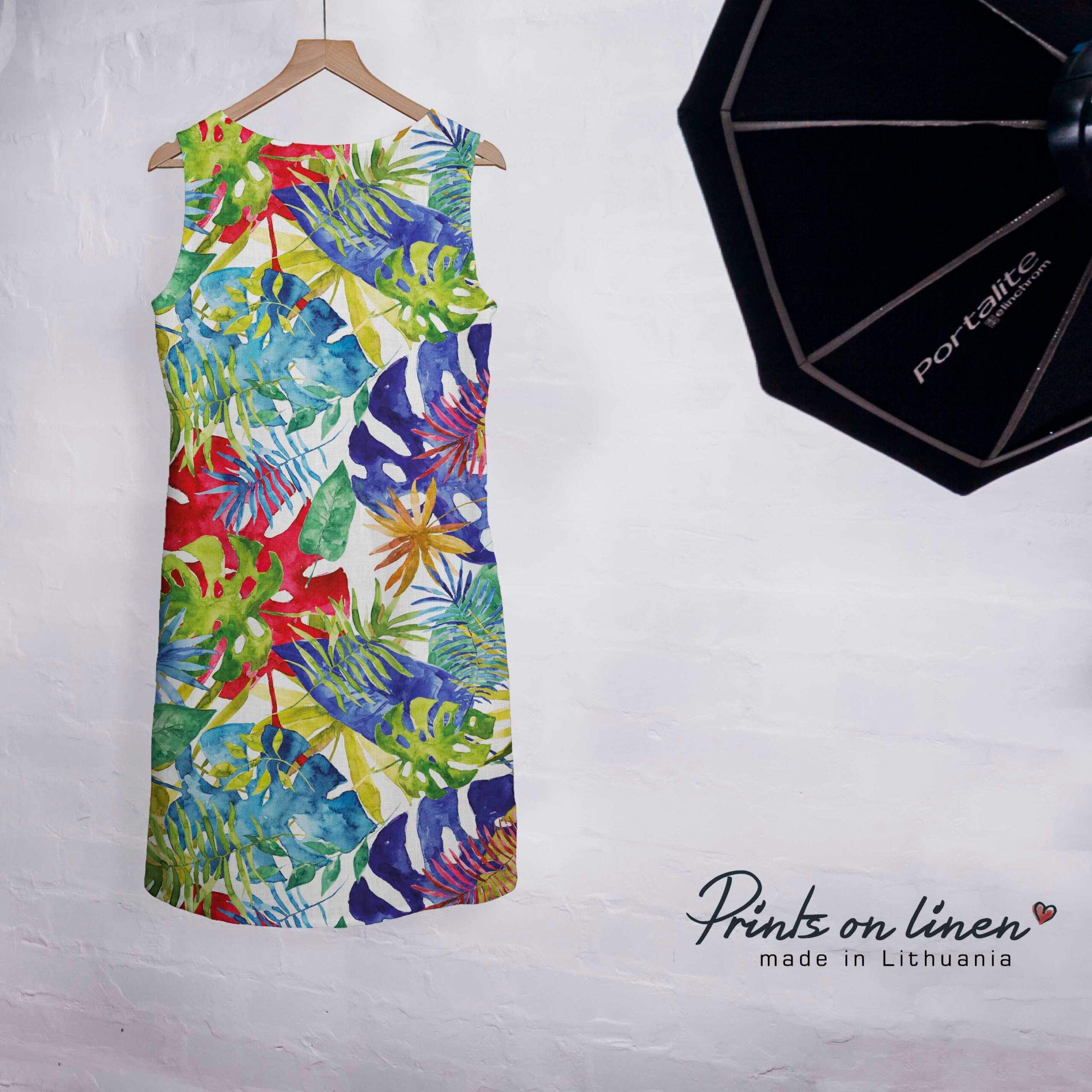 Linen women dress colourful Monstera leaves pattern. We have two designs: DRESS with short sleeves or sleeveless TUNIC style dress.