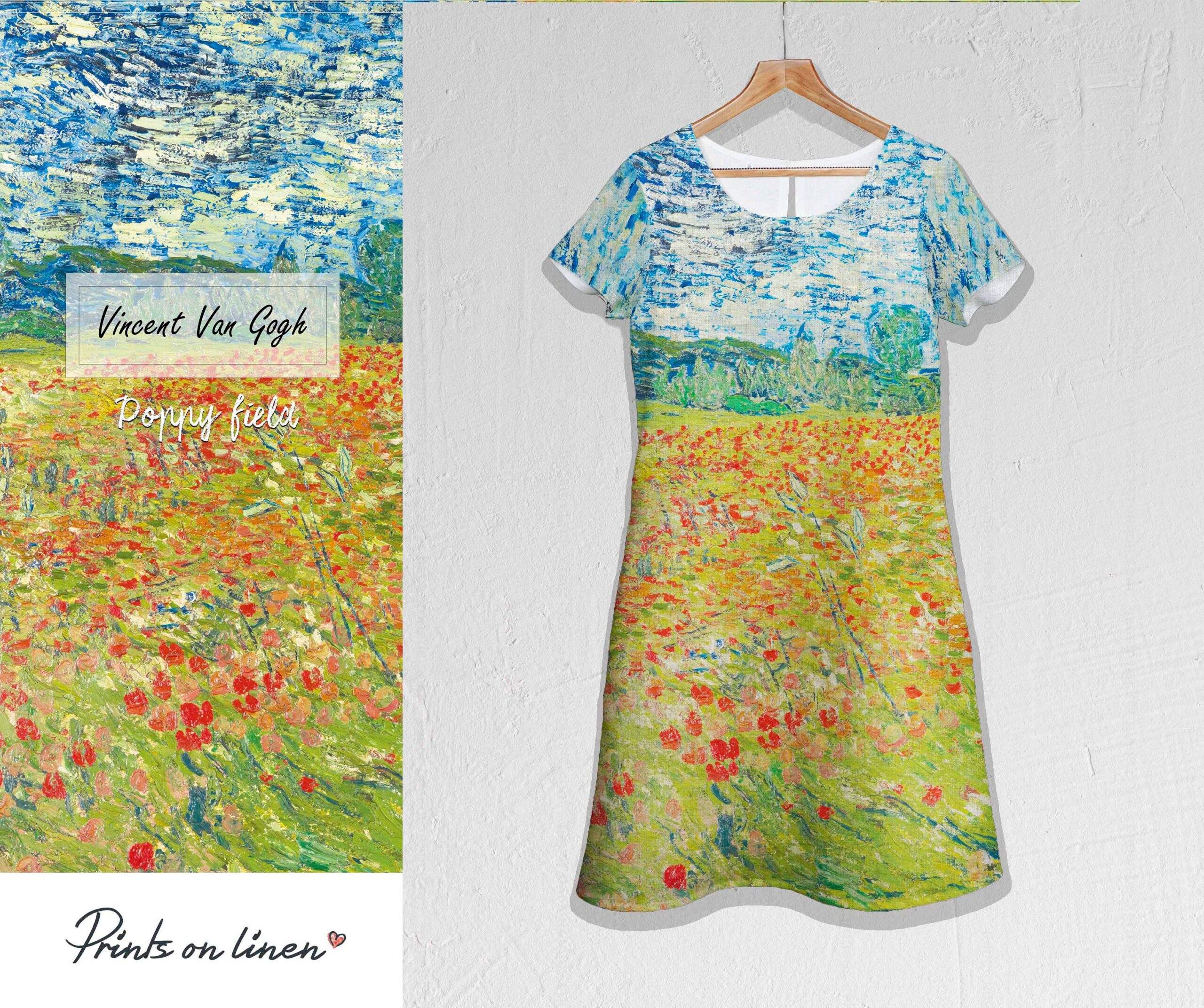 Linen dress of Poppy Field by Vincent Van Gogh for females. Looking at the horizons of the future, we sometimes forget about marvellousness of present day moment which is so fragile like a poppy blossom. Painting this piece of art, Vincent Van Gogh raised the line of the horizon in order to focus our attention on the blooming poppies field. Feminine standard size and plus size linen dress of Poppy Field by Vincent Van Gogh remind about the most beautiful and important things which are often hidden very close.