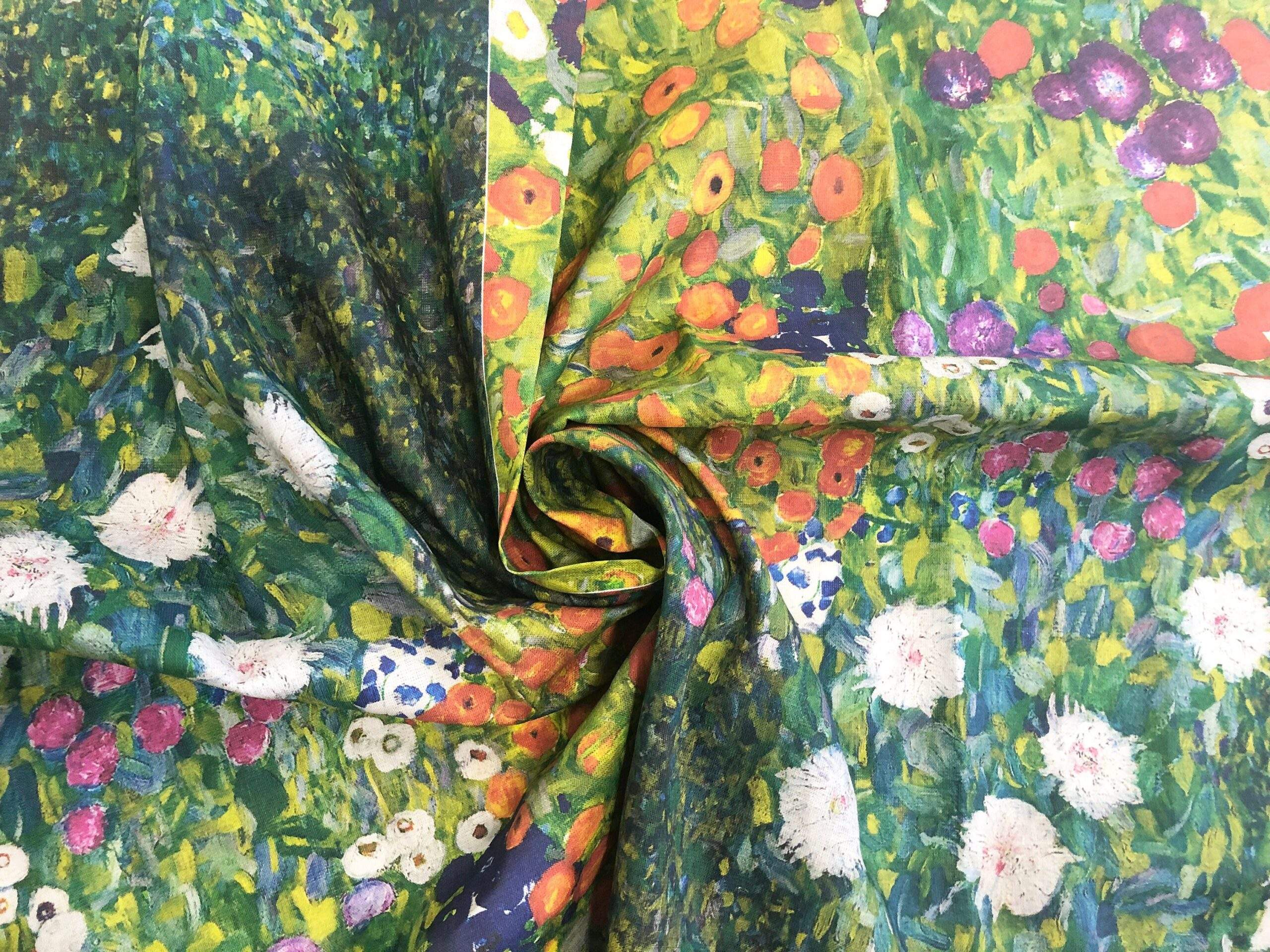 Linen fabric by meters / yards. Gustav Klimt artwork “Farm Garden” motif. 100% linen.