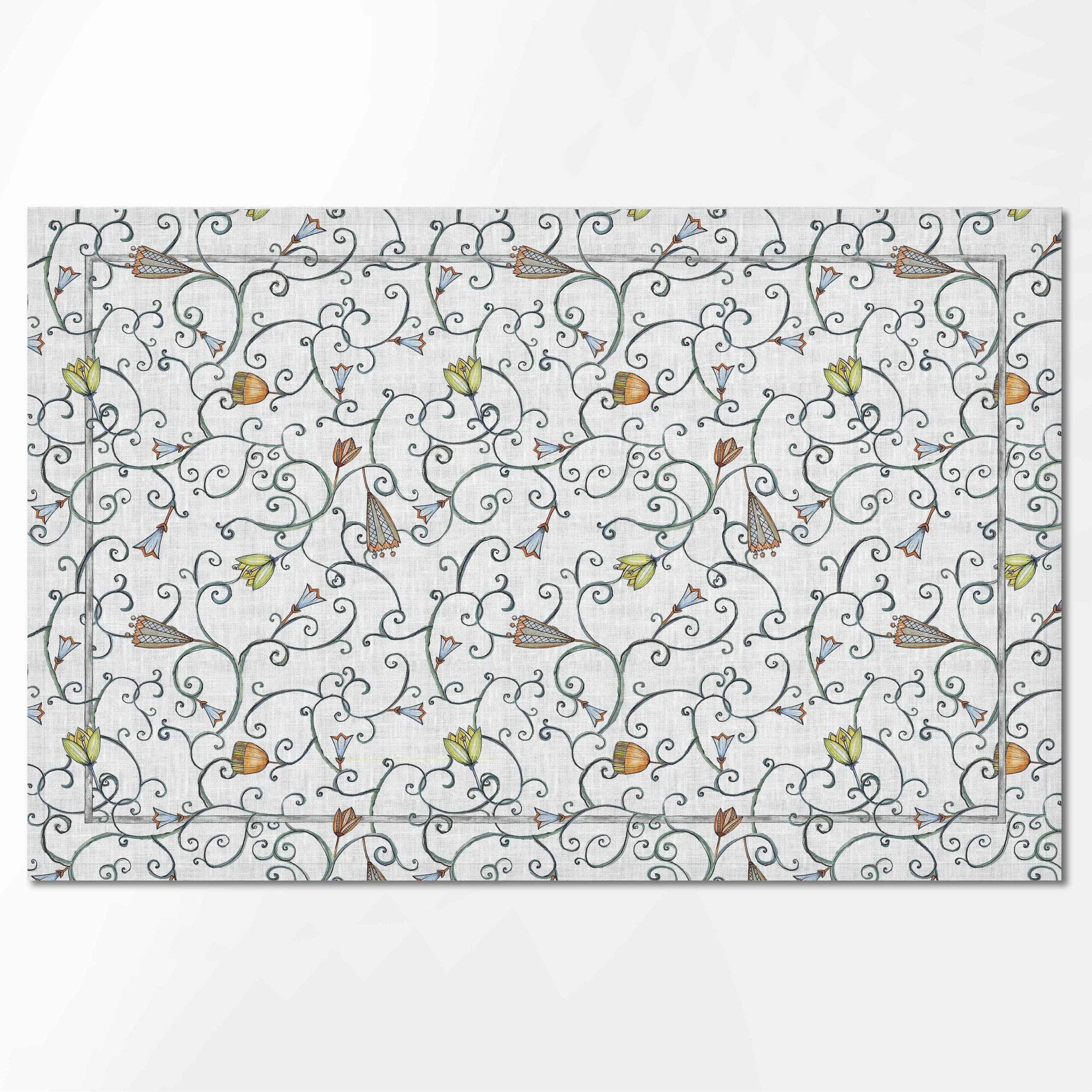 Linen placemats set with flowers print, made of 100% white linen fabric.