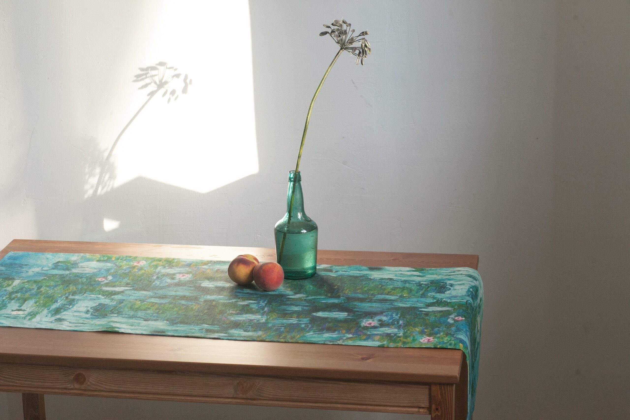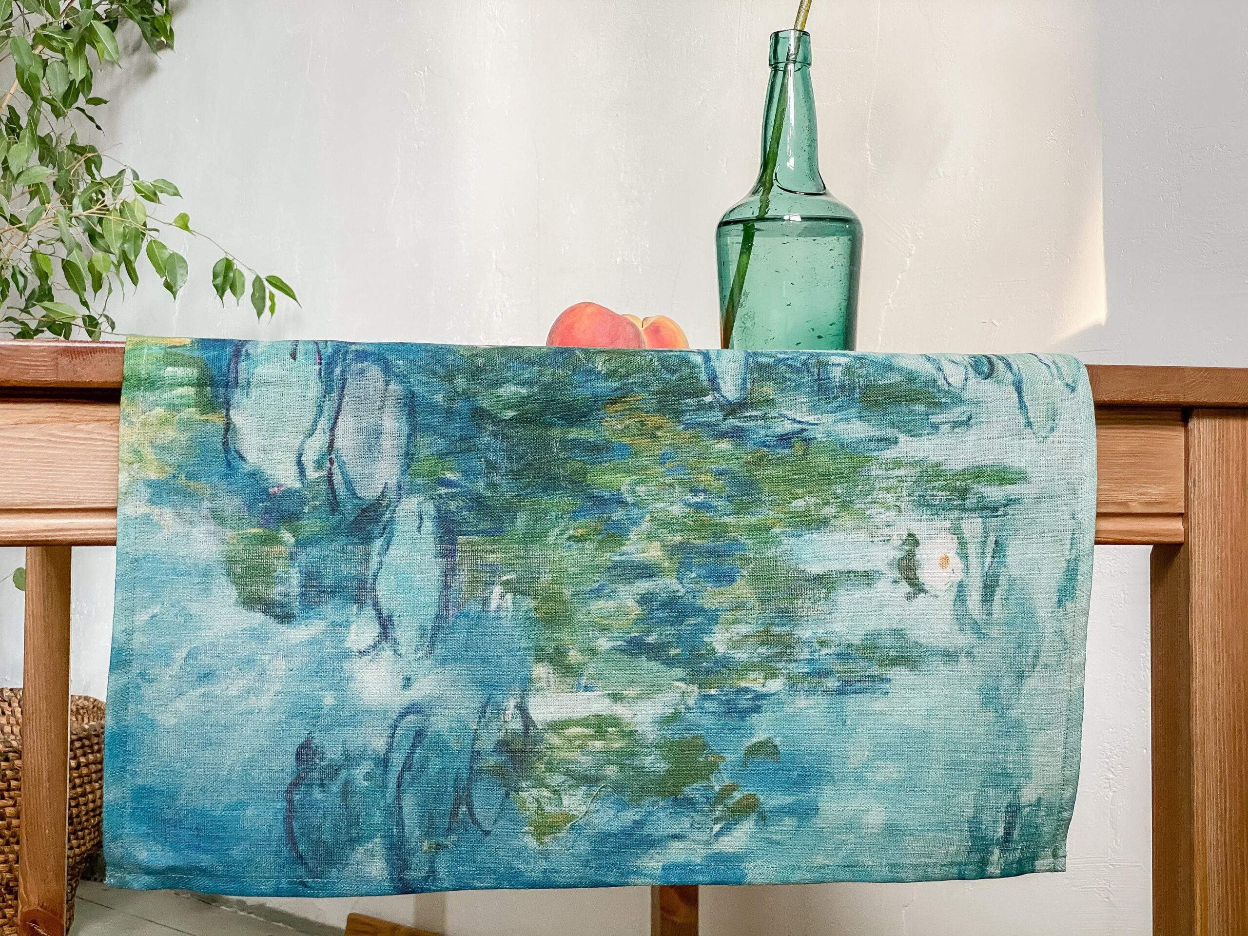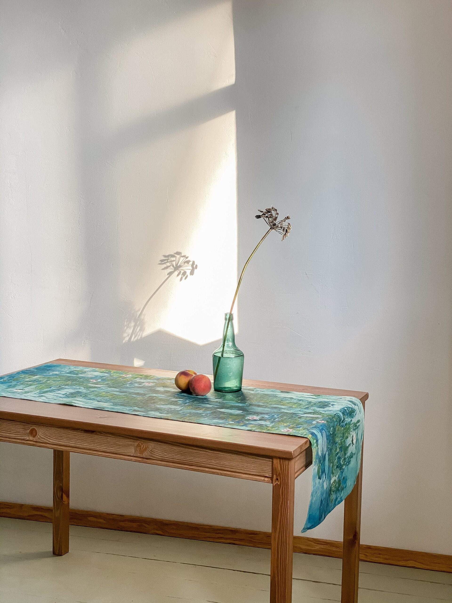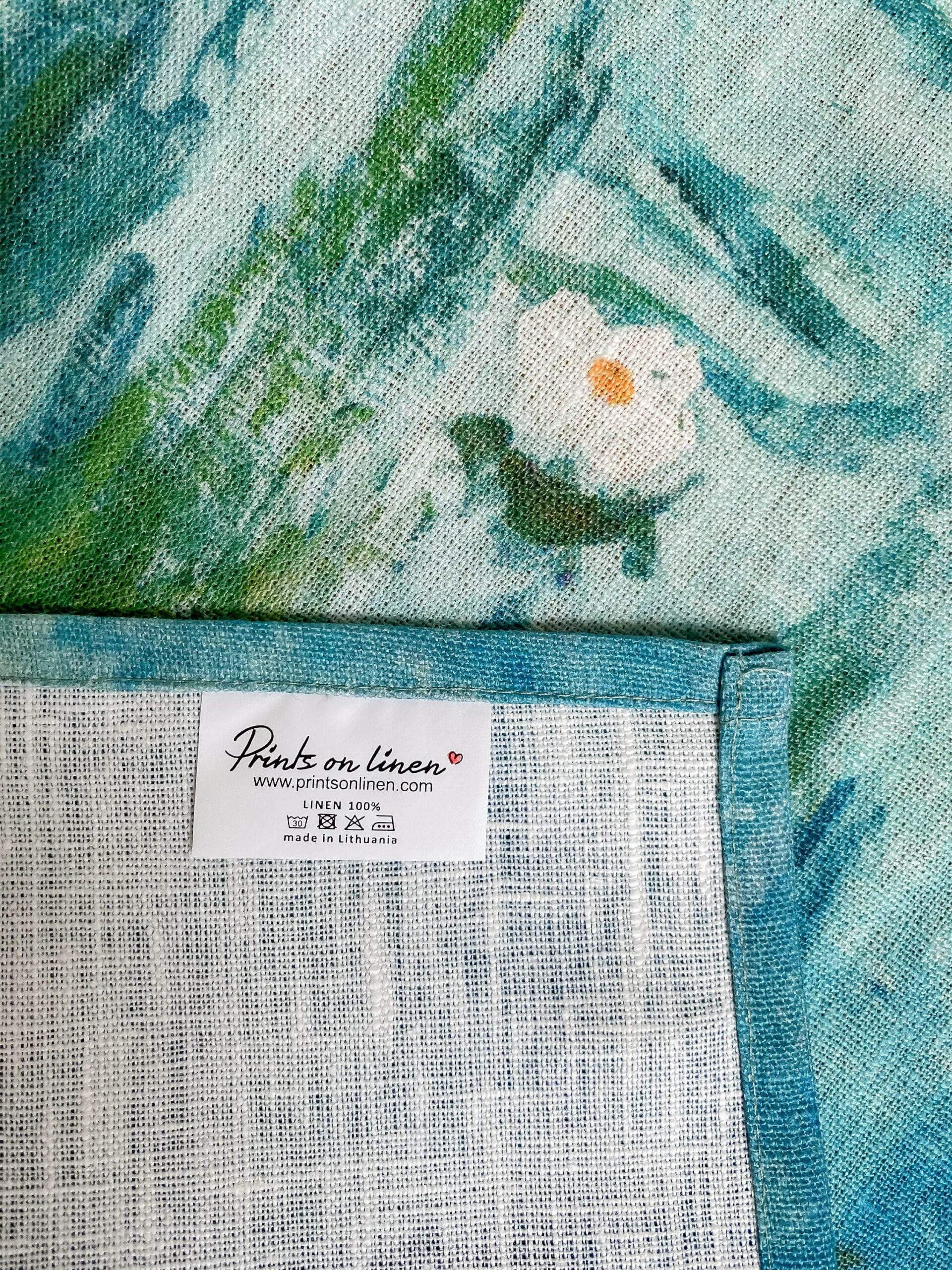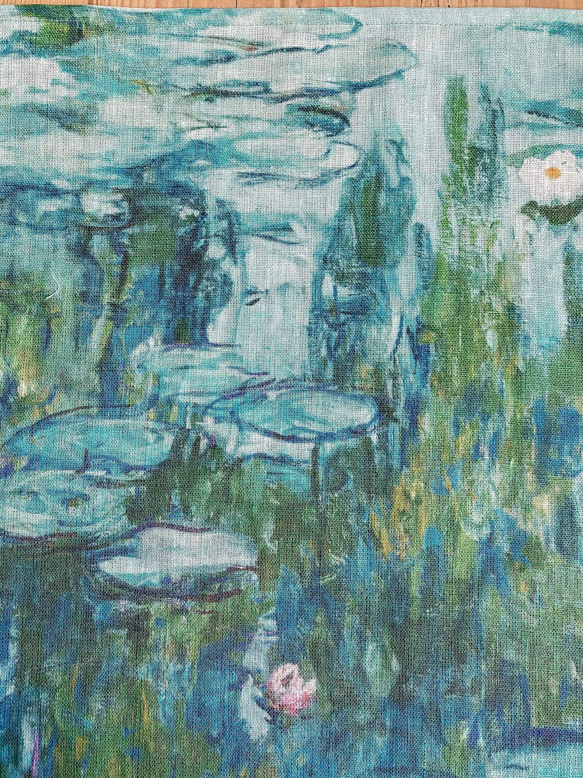 Linen table runner “Water Lilies” by Claude Monet. Water Lilies is a series of approximately 250 oil paintings by French Impressionist Claude Monet. The paintings depict his flower garden at his home in Giverny, and were the main focus of his artistic production during the last thirty years of his life. This table runner can be order with same pattern linen table napkins, placemats or tablecloths (different size).