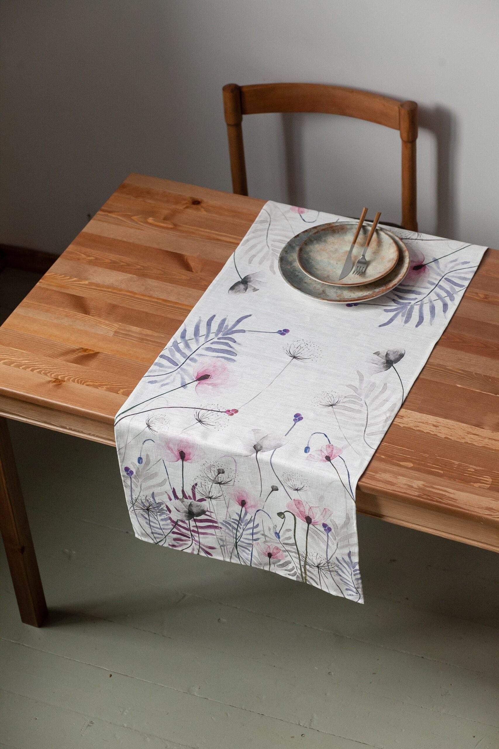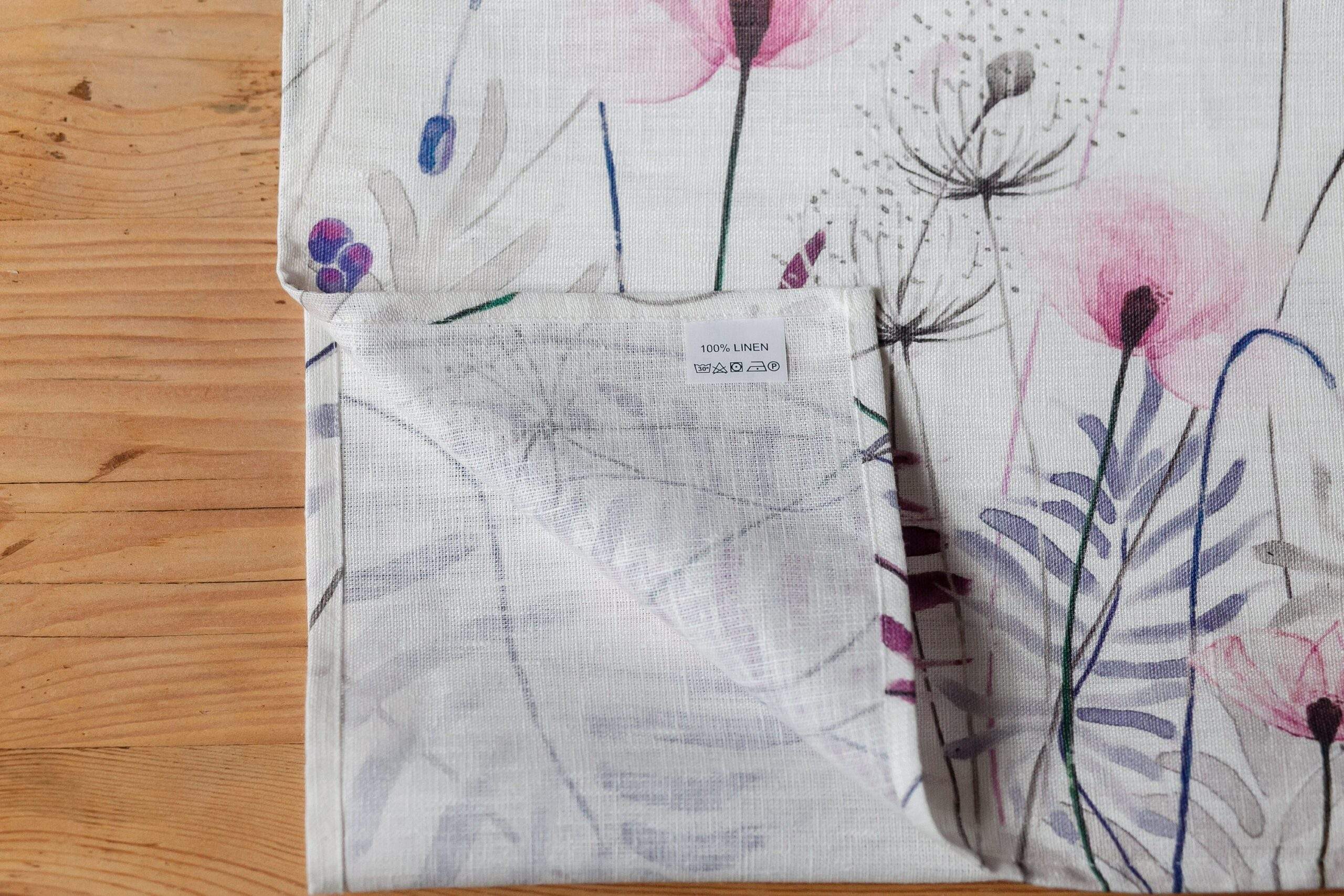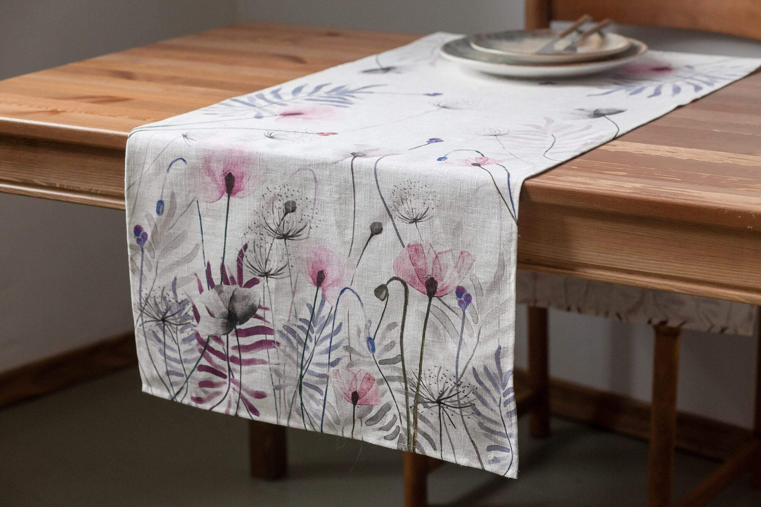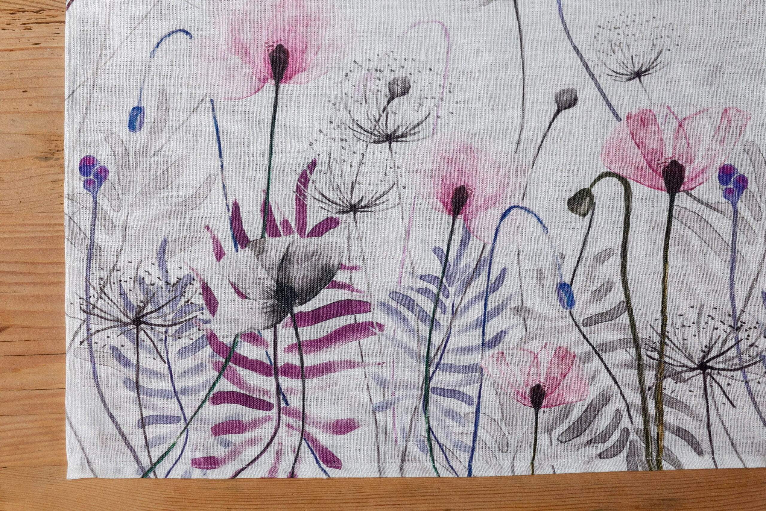 Linen table runner “Pink Poppies”. This table runner can be order with same pattern linen table napkins, placemats or tablecloths (different sizes).