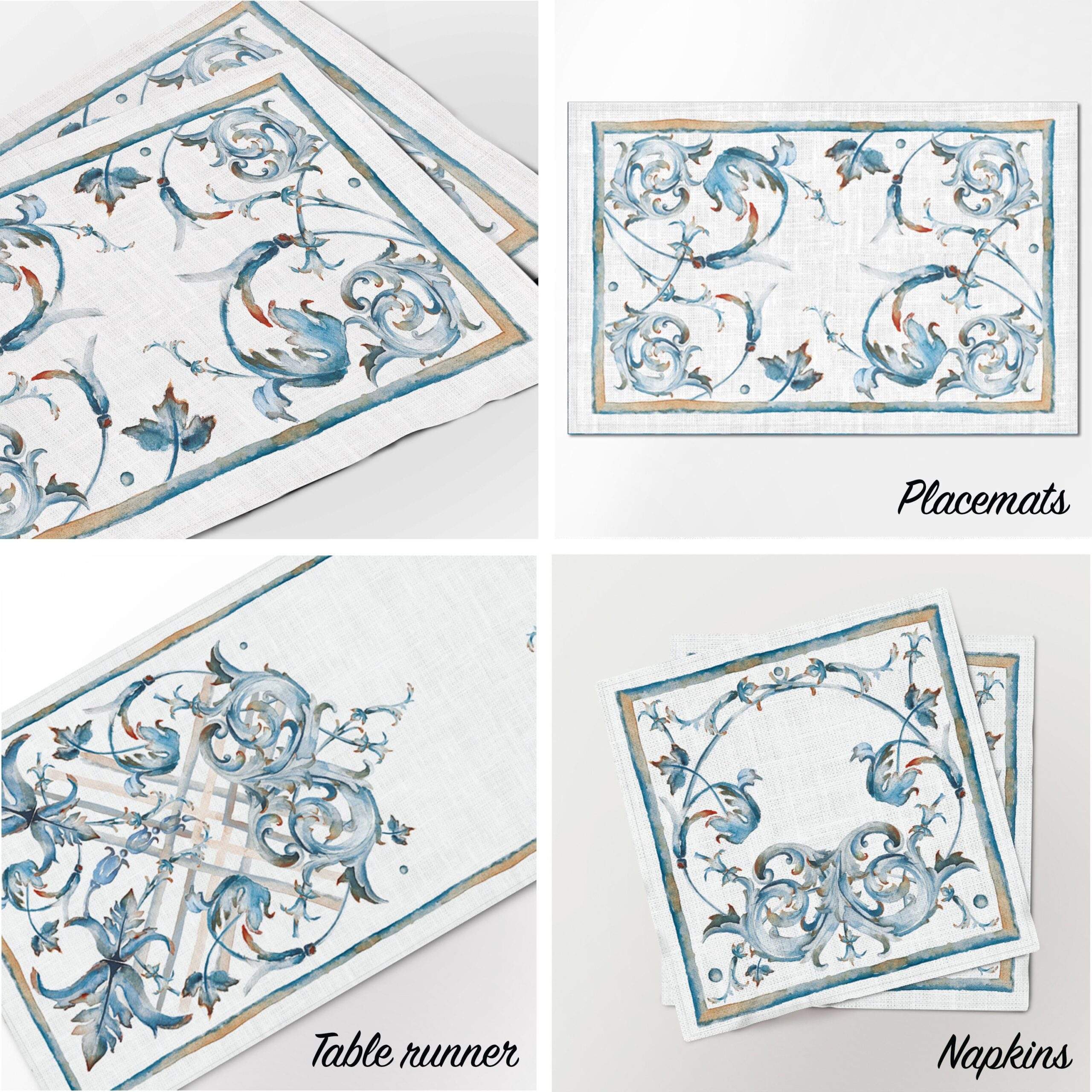 Linen tablecloths with Antique aesthetic pattern. This tablecloth can be order with matching pattern linen table runners, placemats or napkins sets.