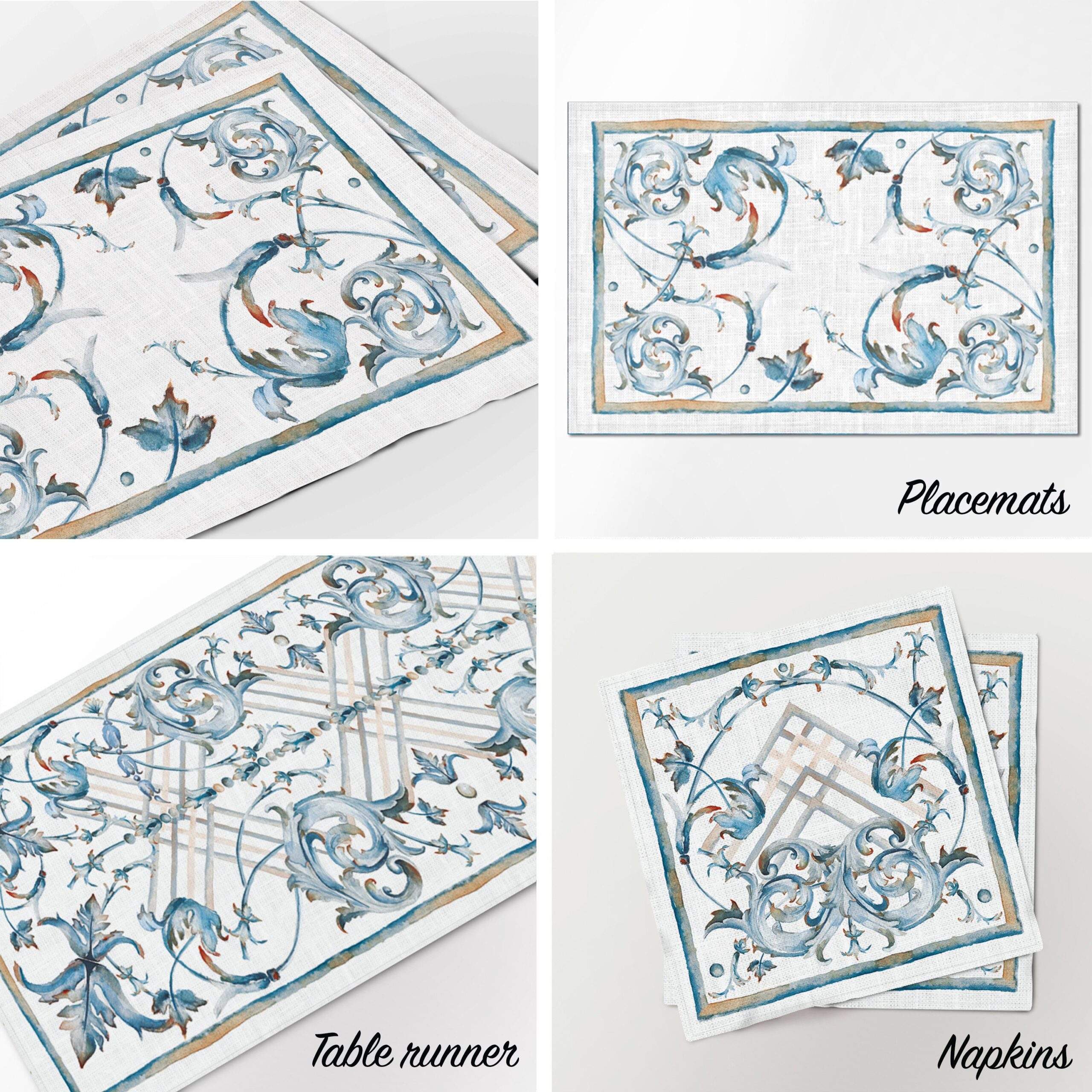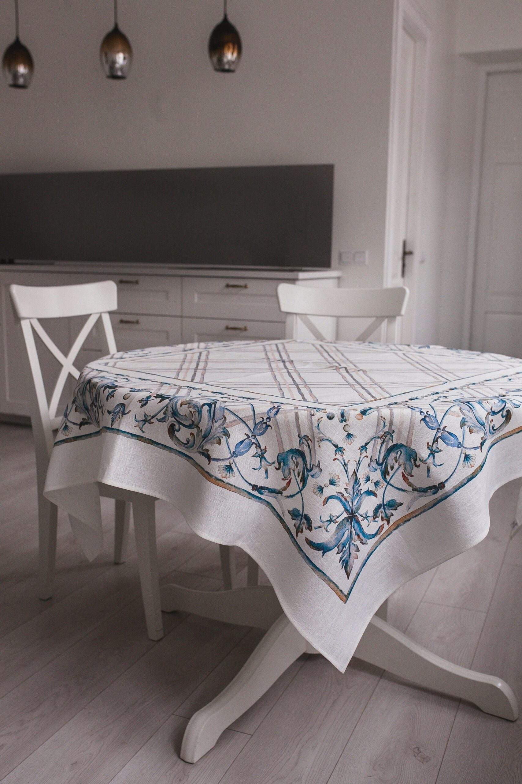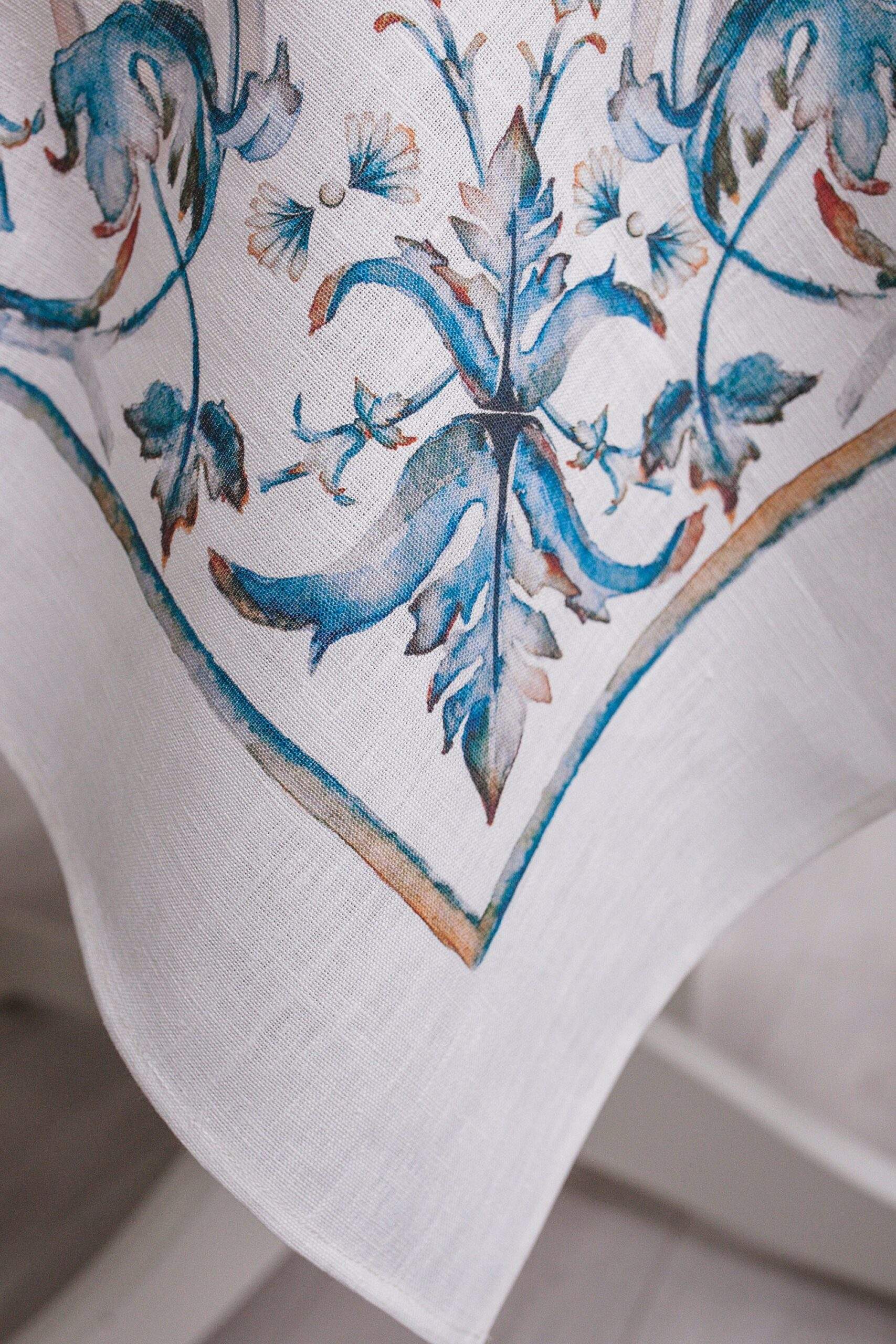 Linen tablecloths with Antique aesthetic pattern. Rectangle / Square / Oval. This tablecloth printed with eco friendly dyes on 100% natural linen fabric. This tablecloth can be order with matching pattern linen table runners, placemats or napkins sets.
