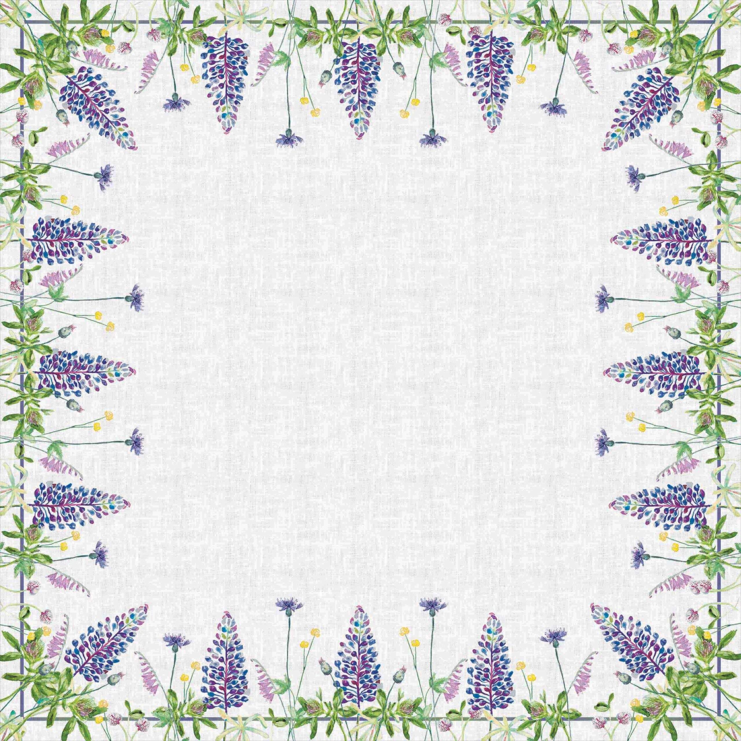 Linen tablecloth with clovers, cornflowers and lupines print around the edges.