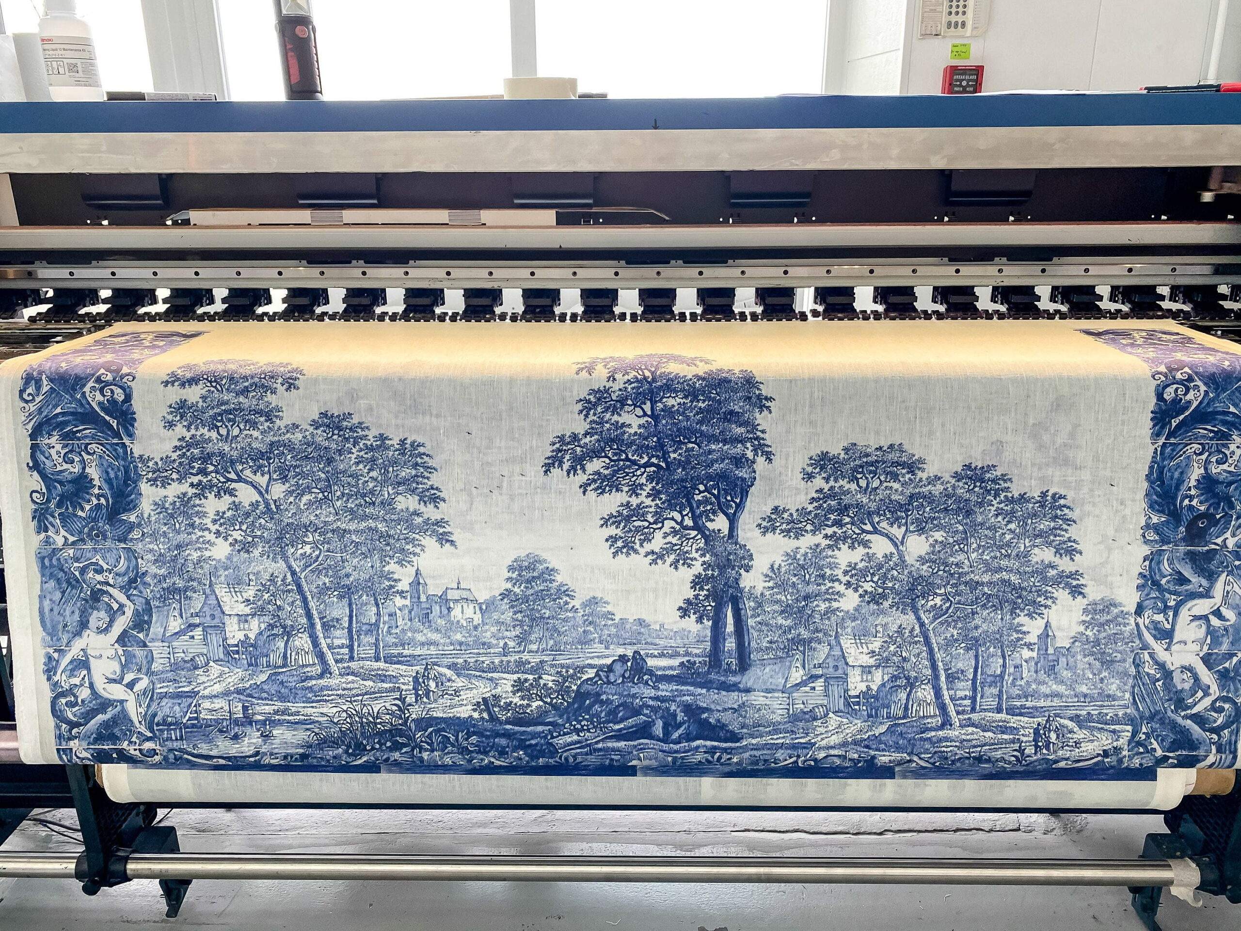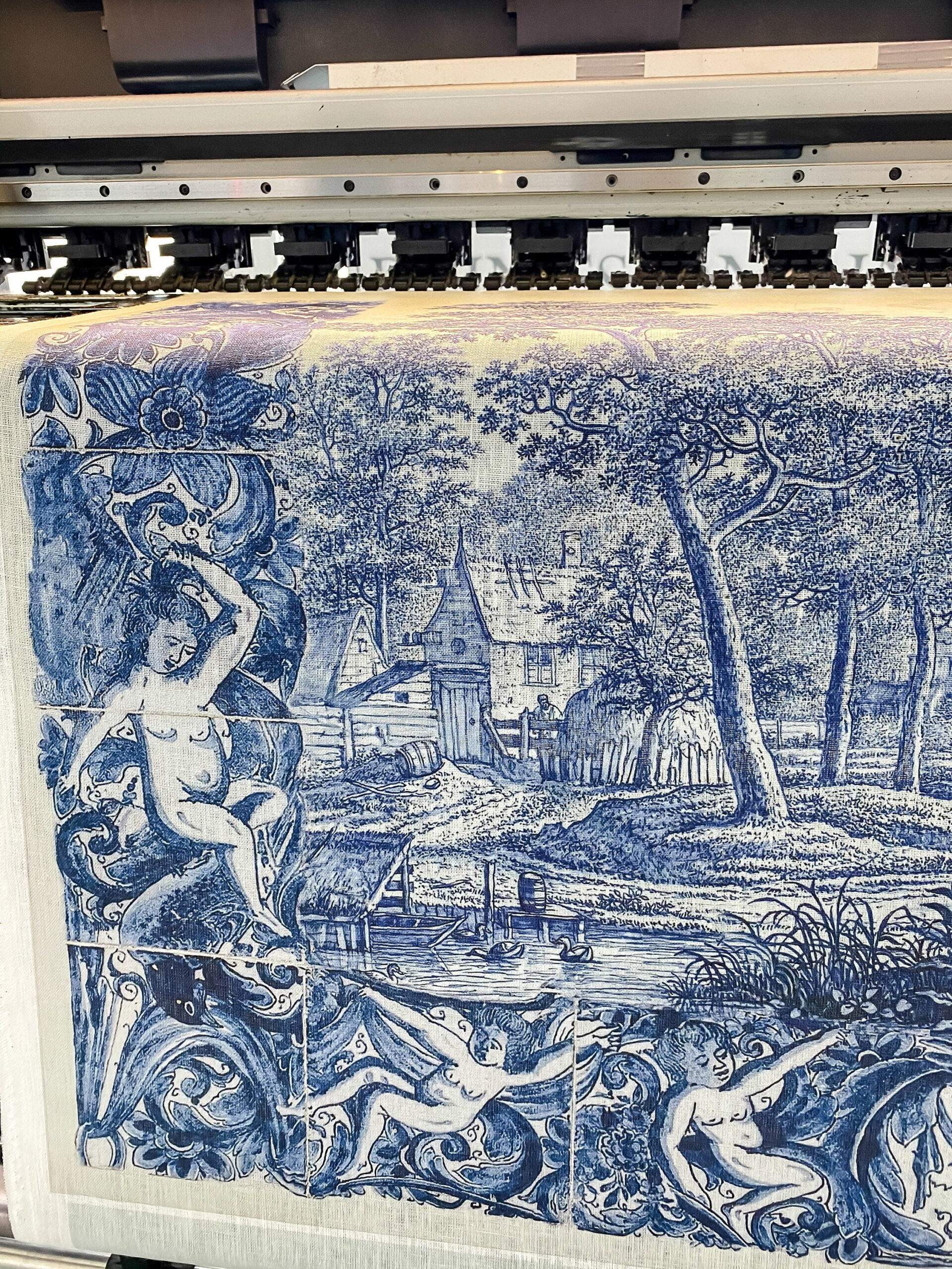 Linen tablecloth “Plaat, beschilderd met een rivierlandschap met kasteel, boerderij en enkele figuren” by Frederik van Frytom.