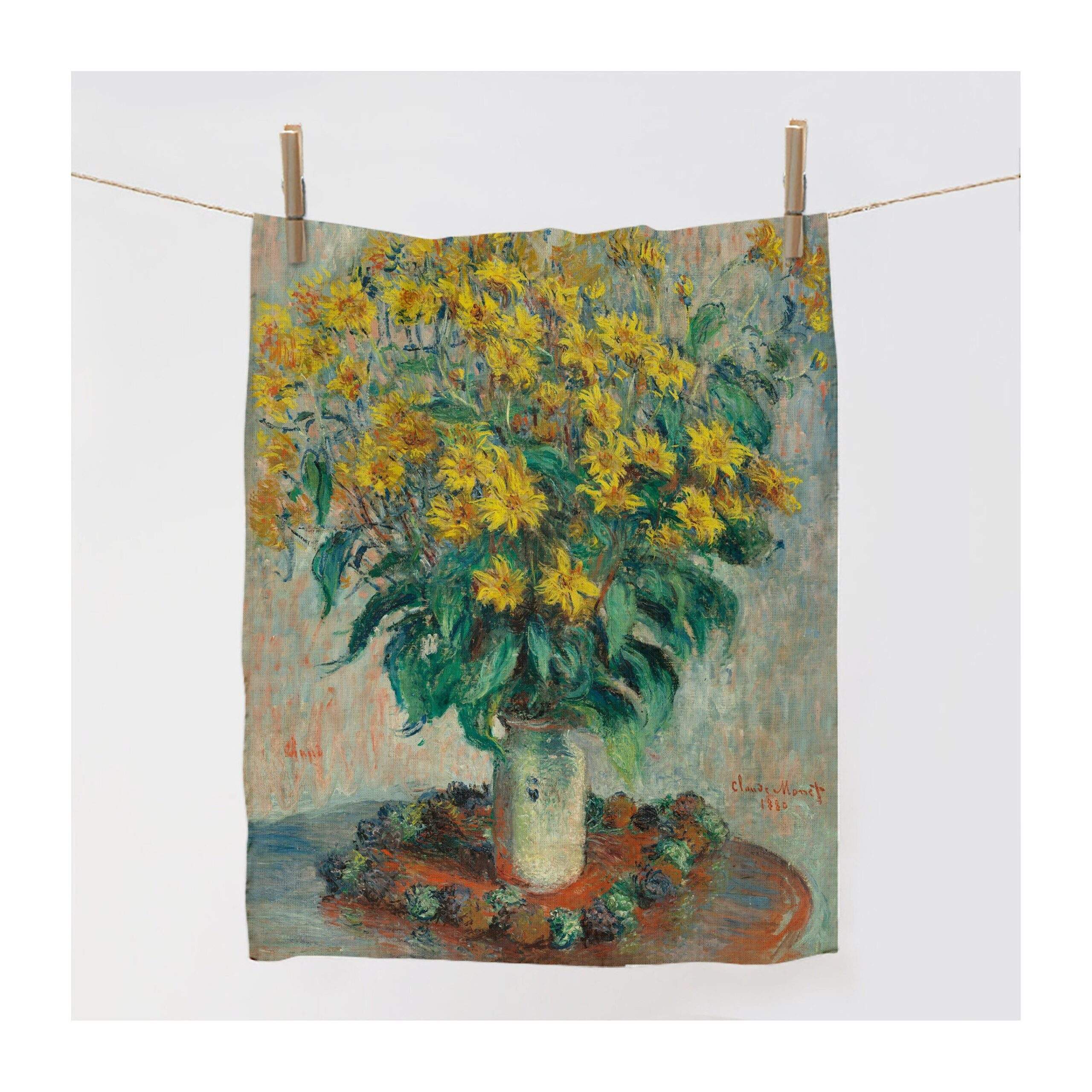 Linen towel Jerusalem Artichoke Flowers (1880) by Claude Monet. Linen kitchen towel with hook. Hand made in Lithuania. Unique kitchen decor, housewarming gift, farmhouse decor.
