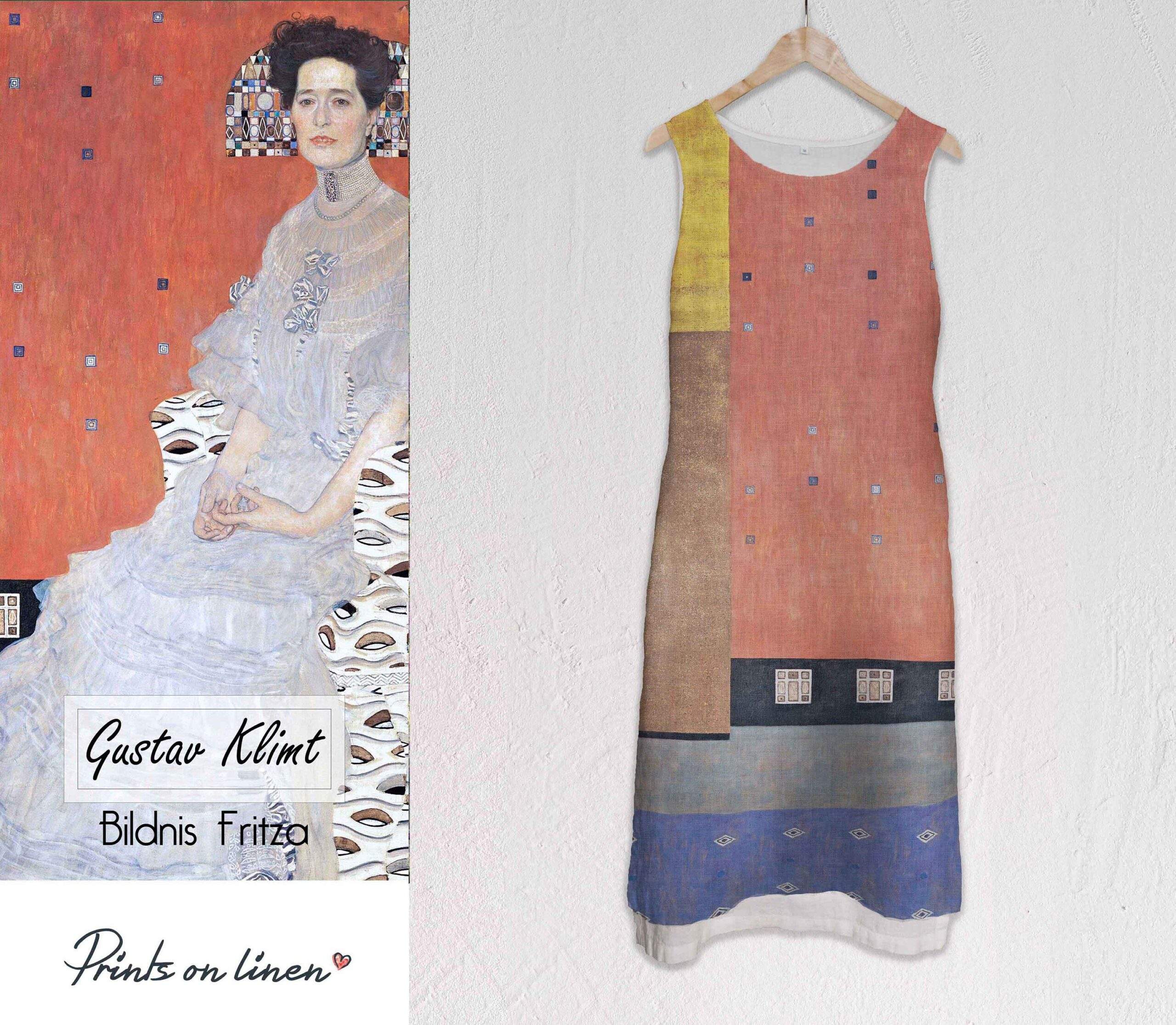 Maxi dress, linen women dress made inspired by Gustav Klimt artwork “Bildnis Fritza”, pattern are on both dress sides, with pockets.