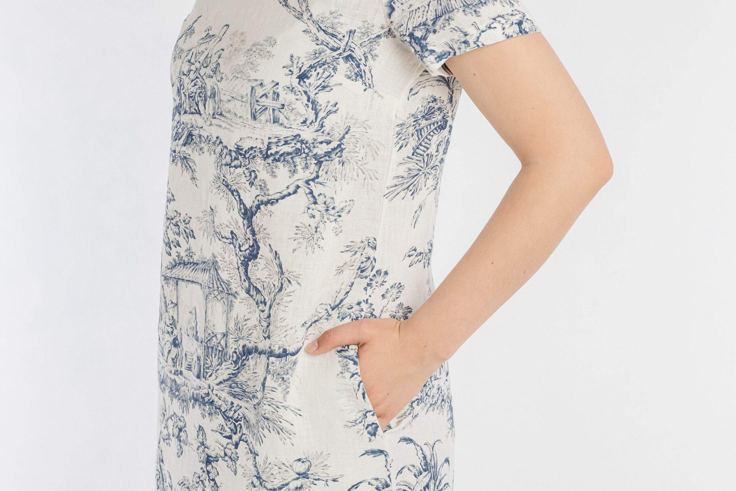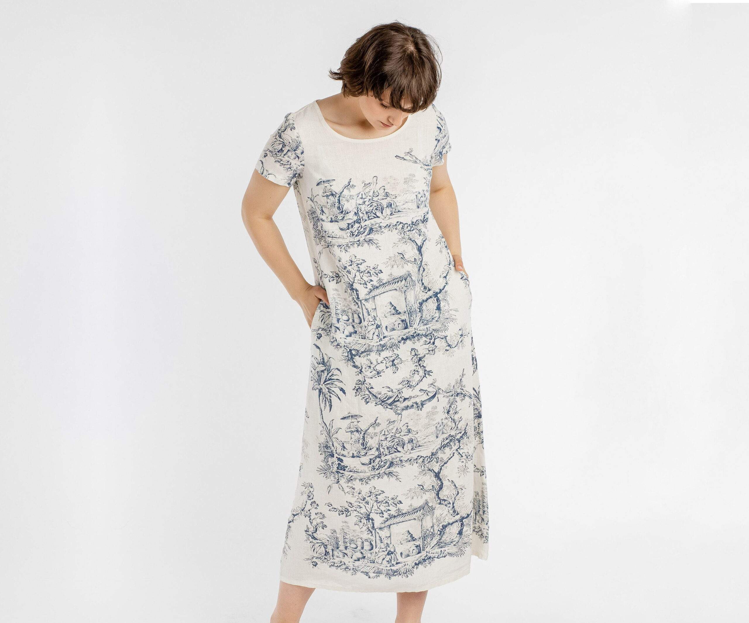 Mid Calf dress Toile de Jouy with a short sleeves. Linen women dress with side pockets.