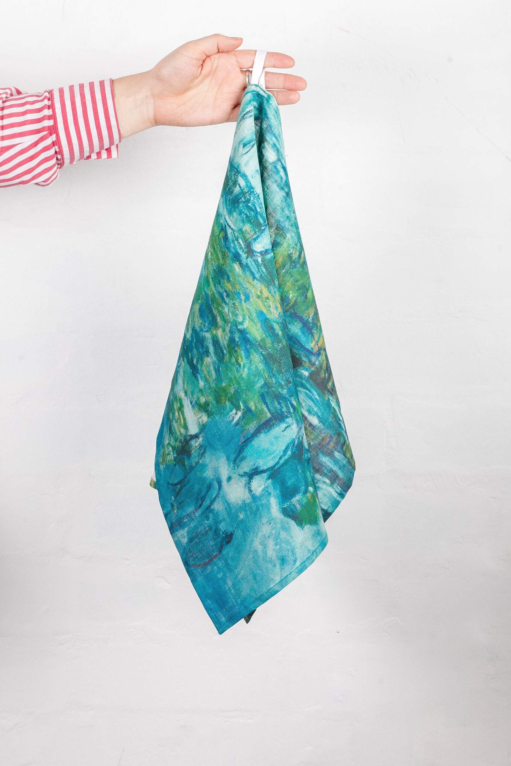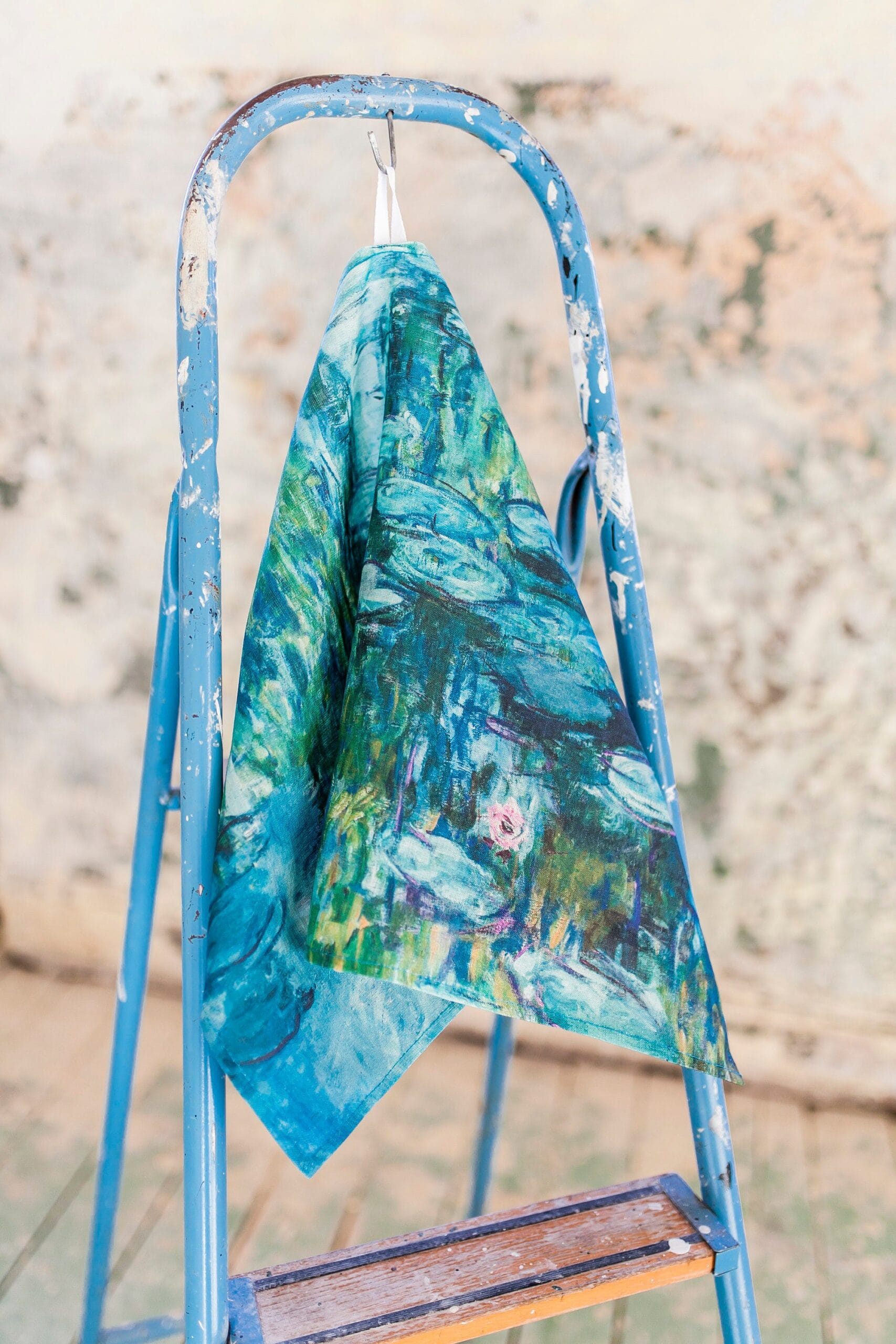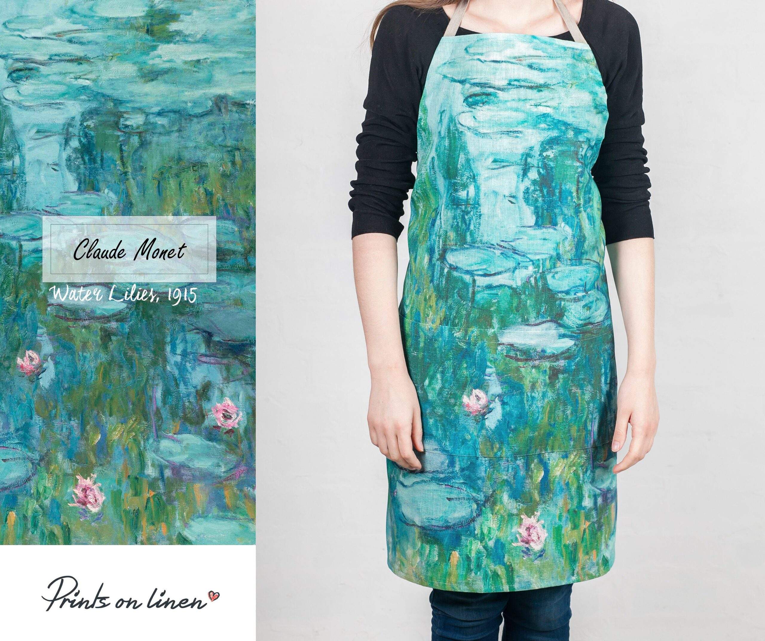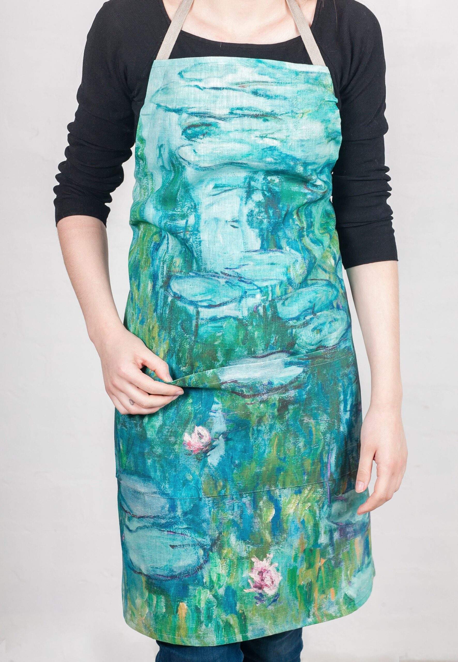 Linen Apron, print – Claude Monet “Water Lilies”. 100% organic linen fabric. Free size linen apron with pocket on top. Cross back apron. Chef apron, personalized apron, custom apron.