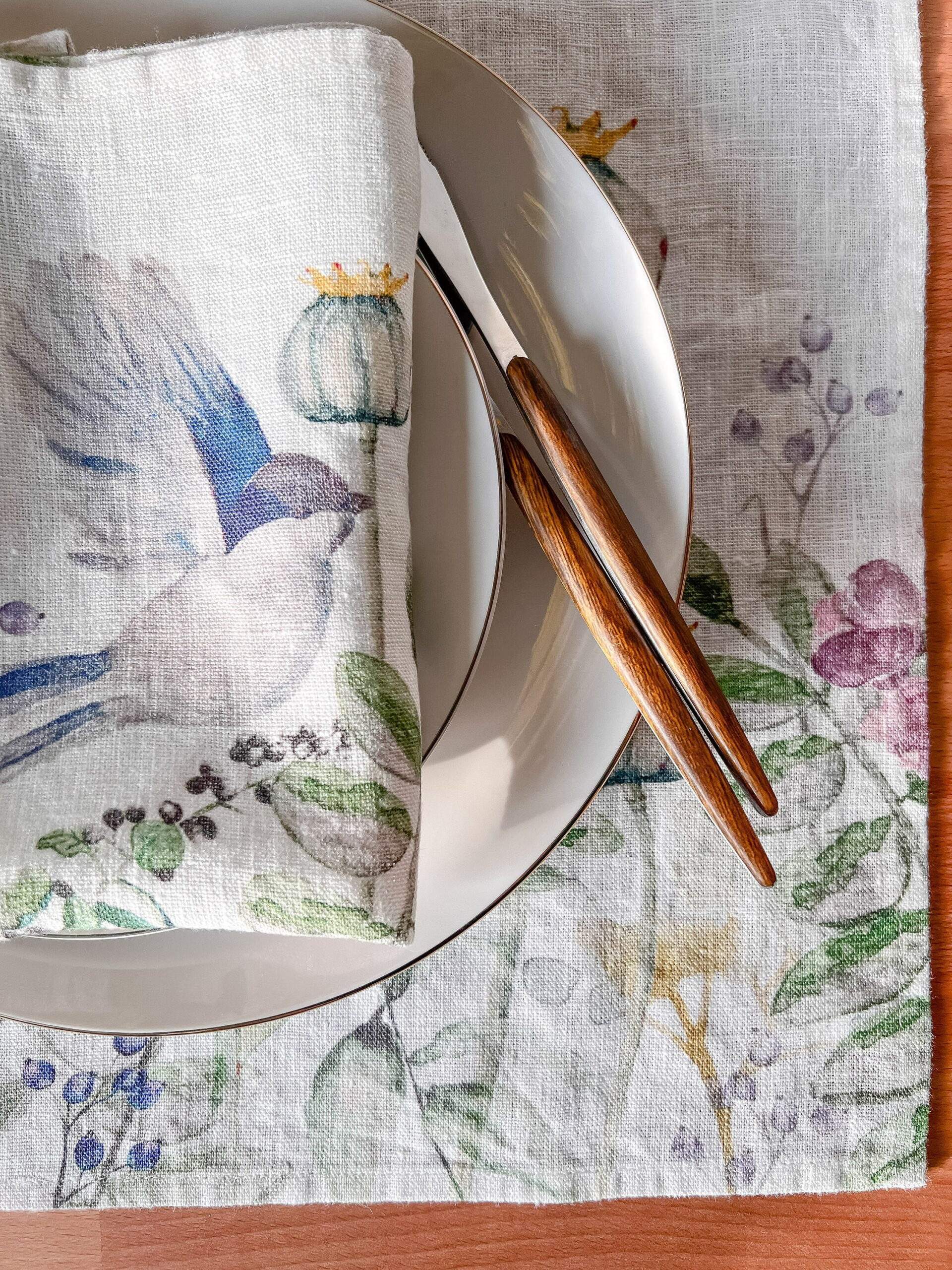 Linen napkins set with spring birds and flowers pattern. It’s unique linen napkins set for your dining room decor or Easter table decor. Matching pattern linen placemats set: https://www.etsy.com/listing/604150991/placemats-set-spring-birds-and-flowers?ref=shop_home_active_2