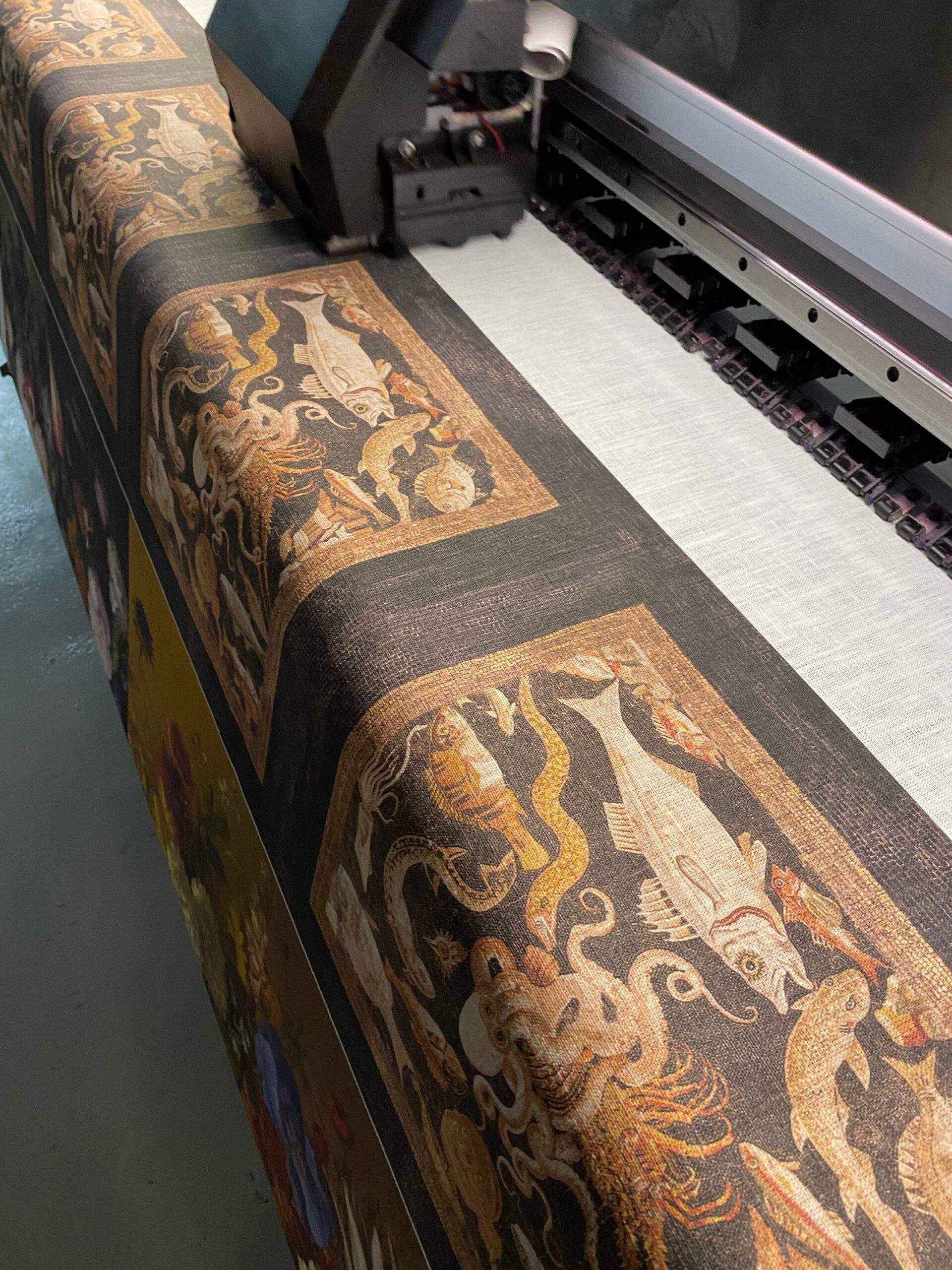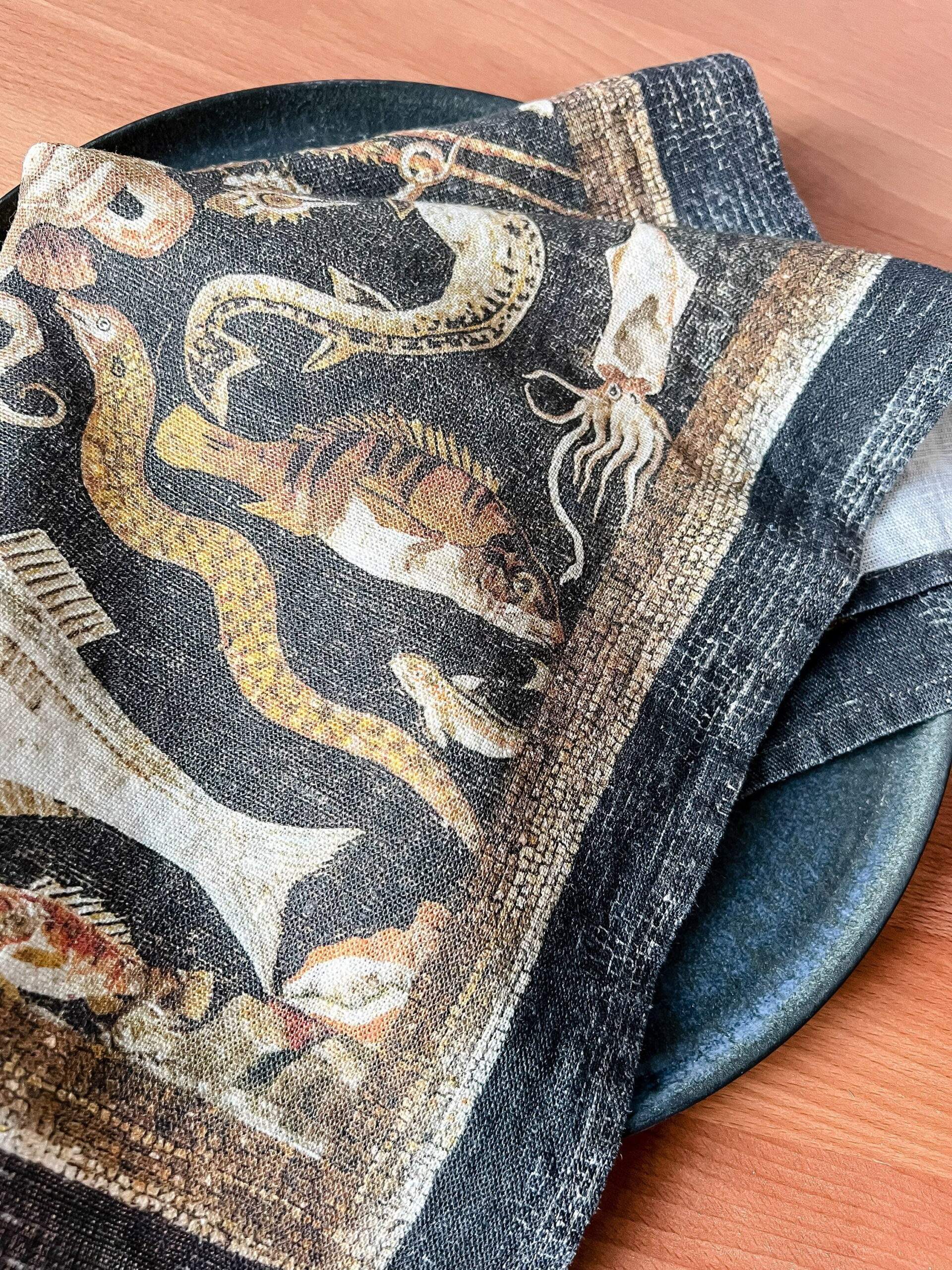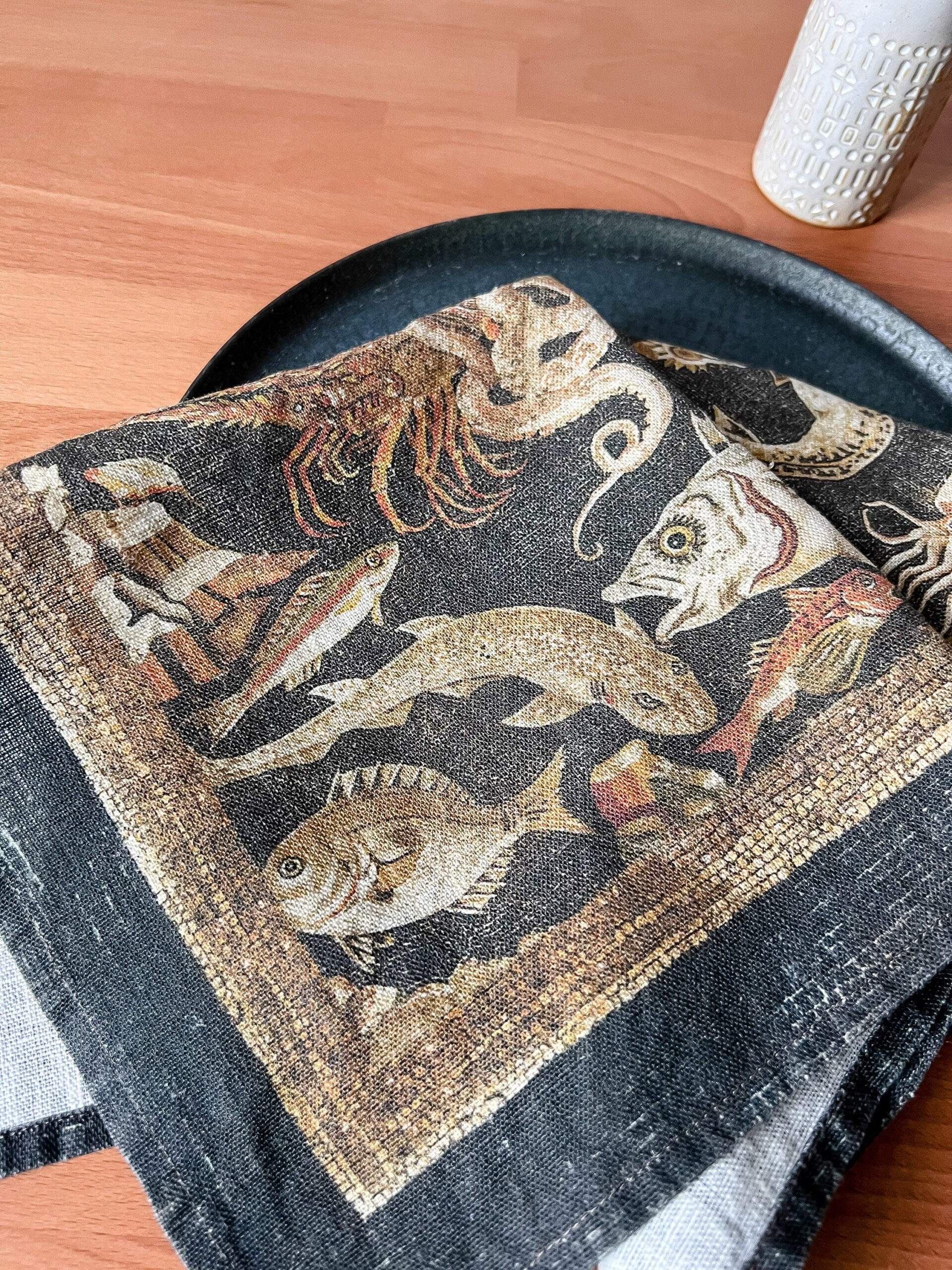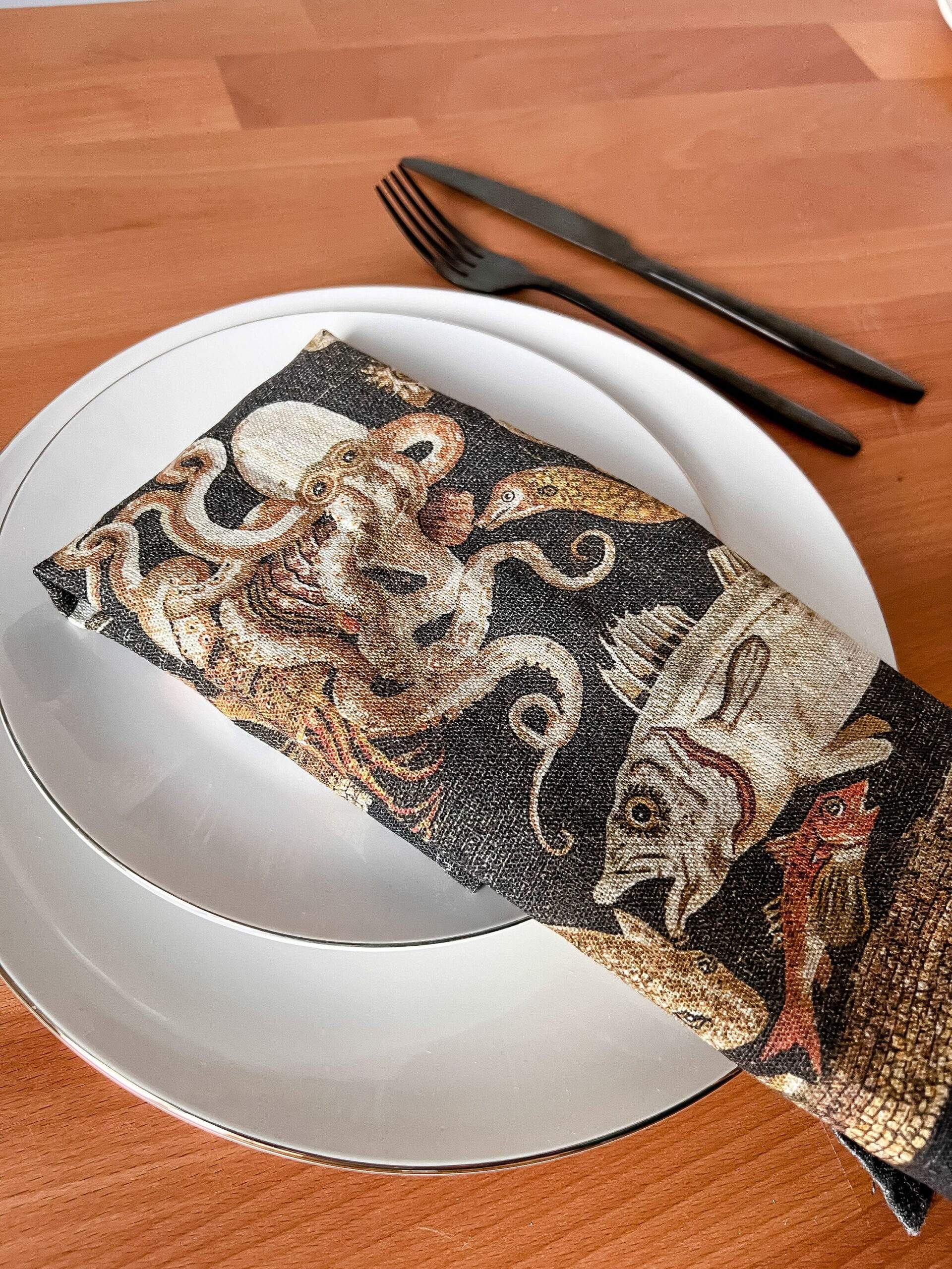 Linen napkins set with the famous fish mosaic from Pompeii “Octopus struggling with a crayfish, with a background of fishes and marine creatures”.