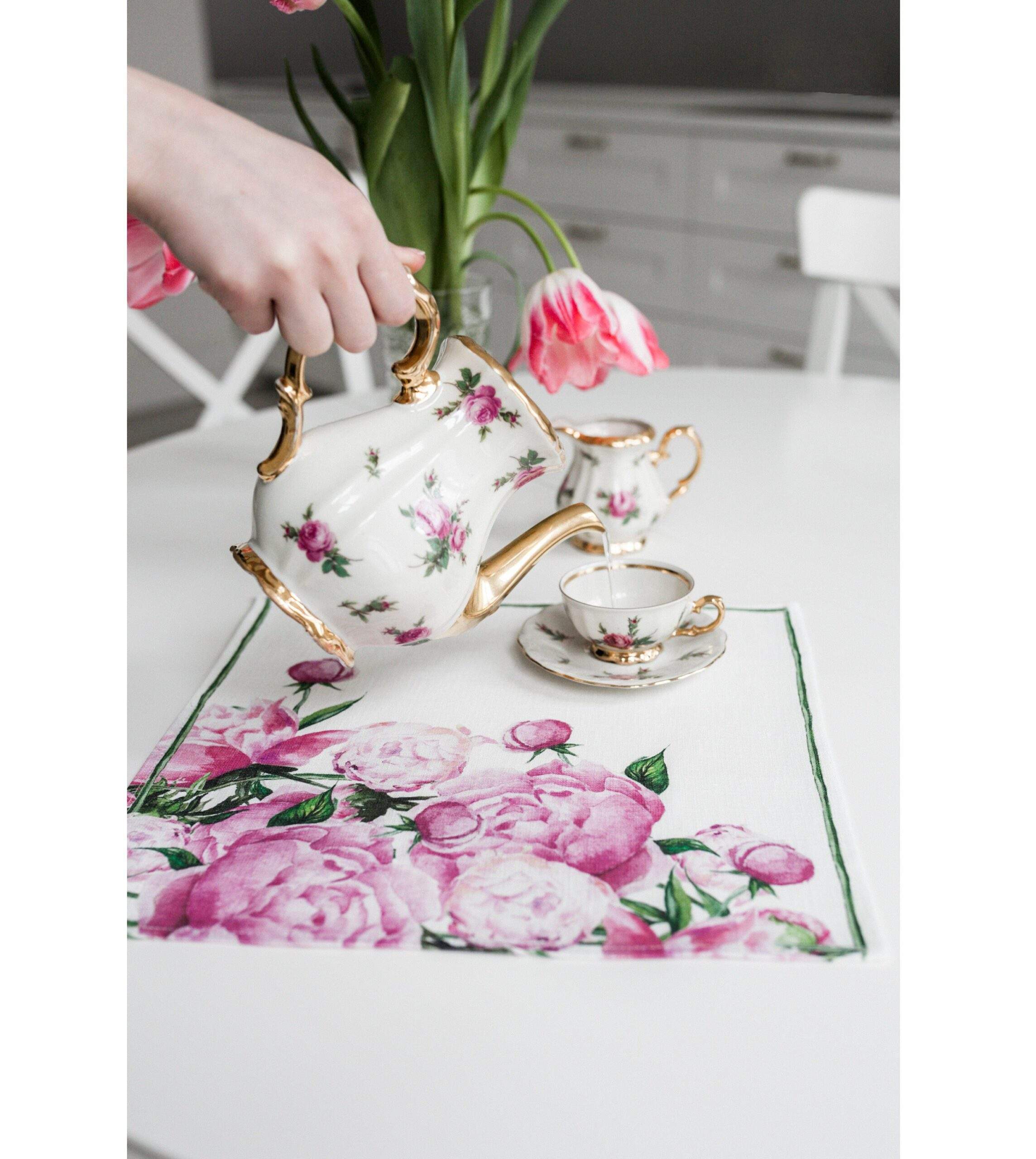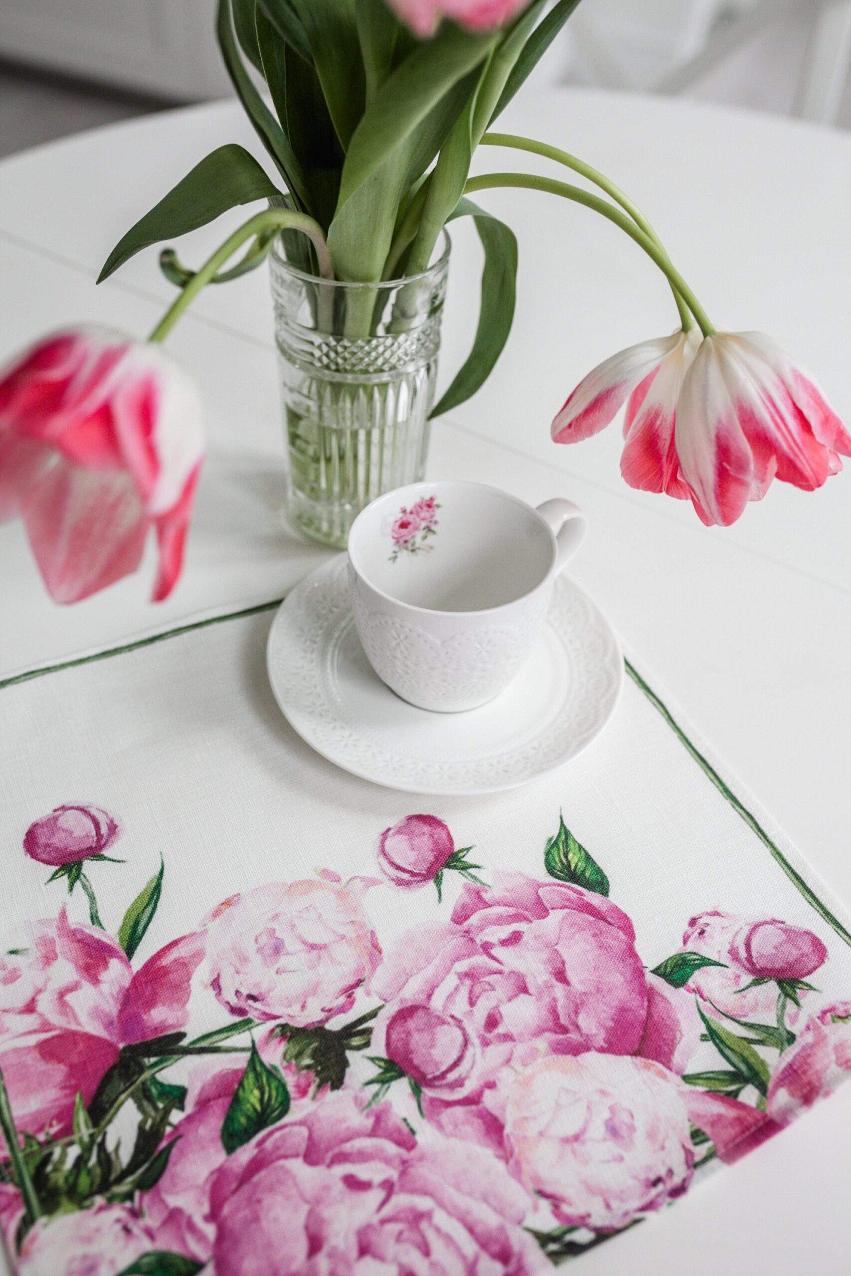 Napkins set Peonies. Hand made in Lithuania. Natural linen fabric.