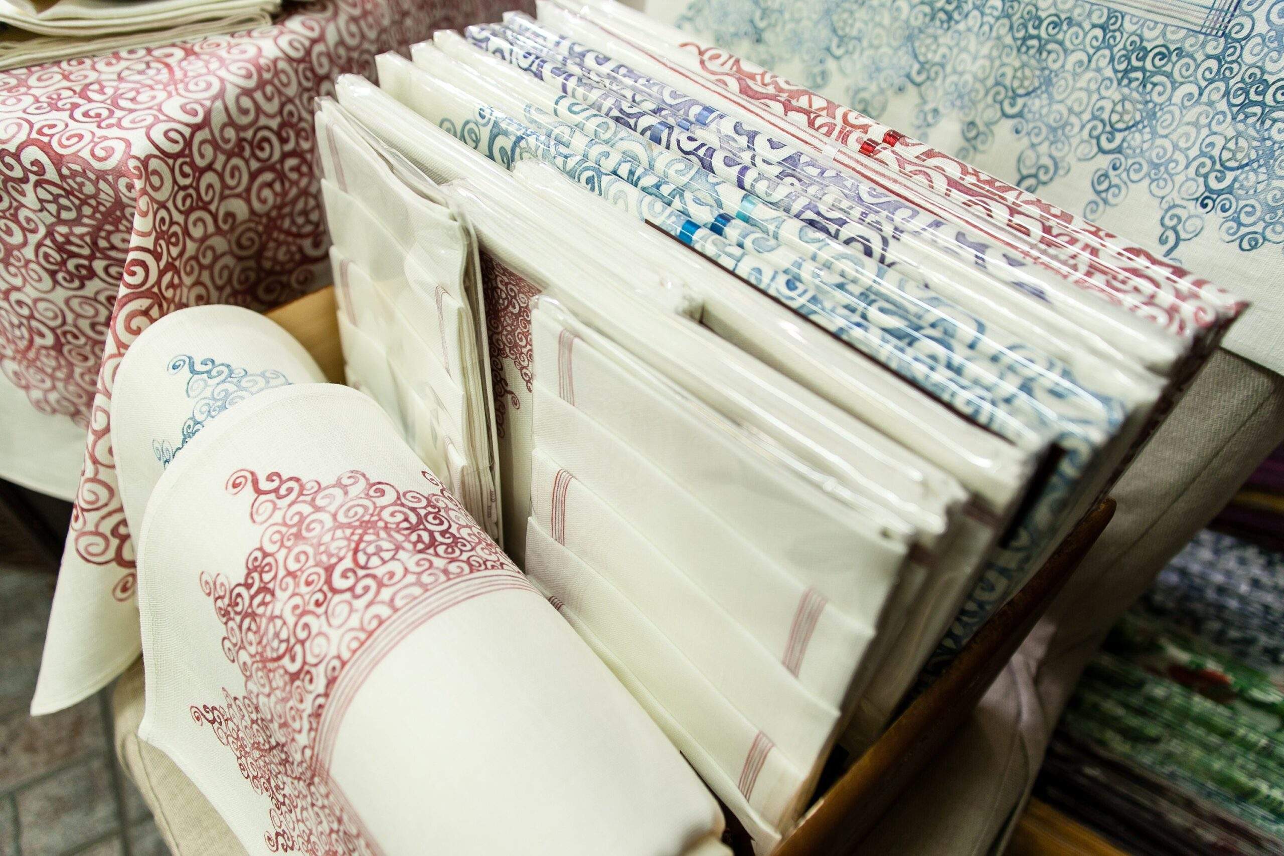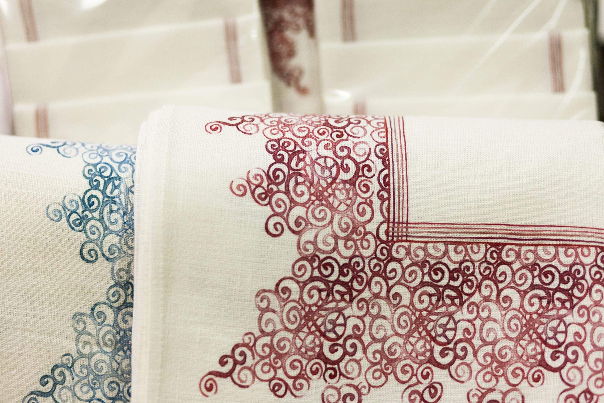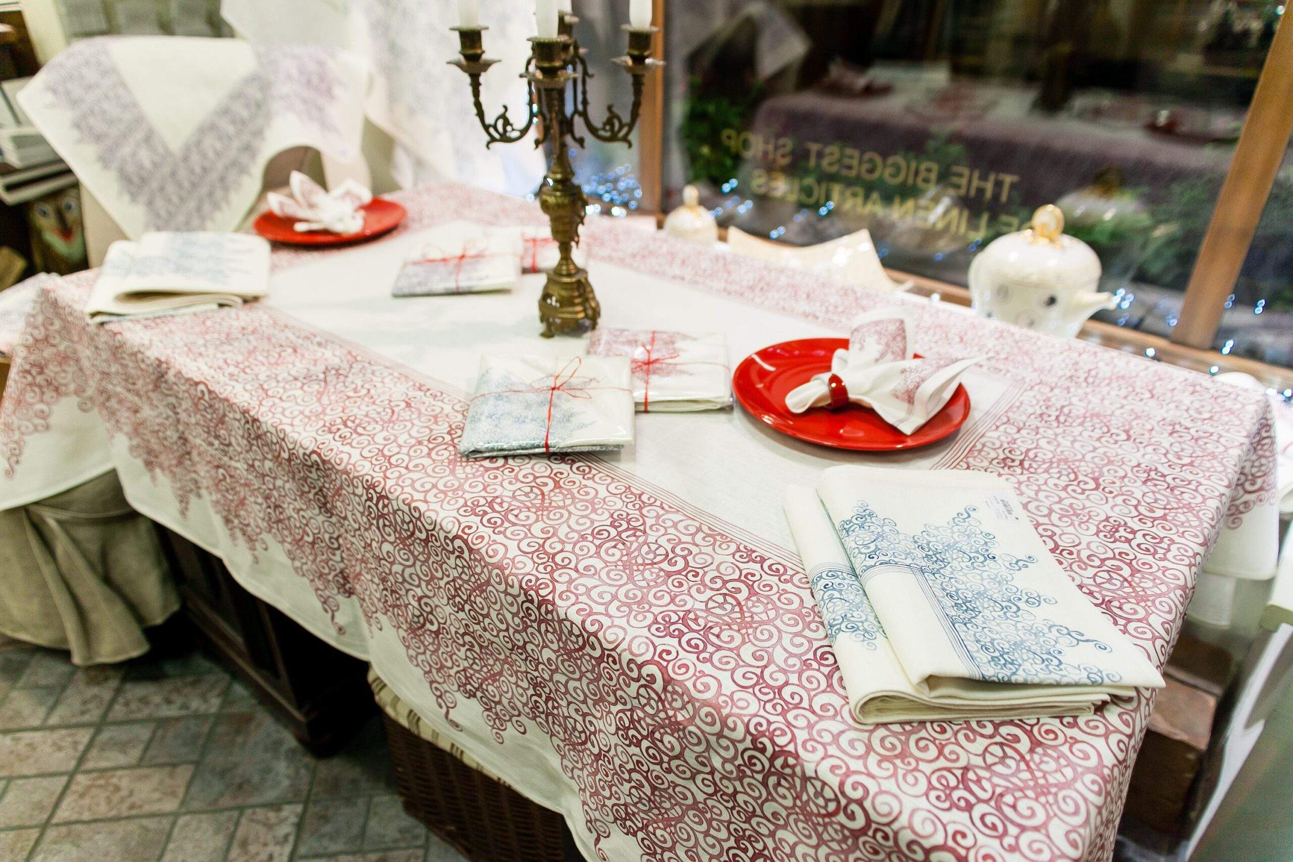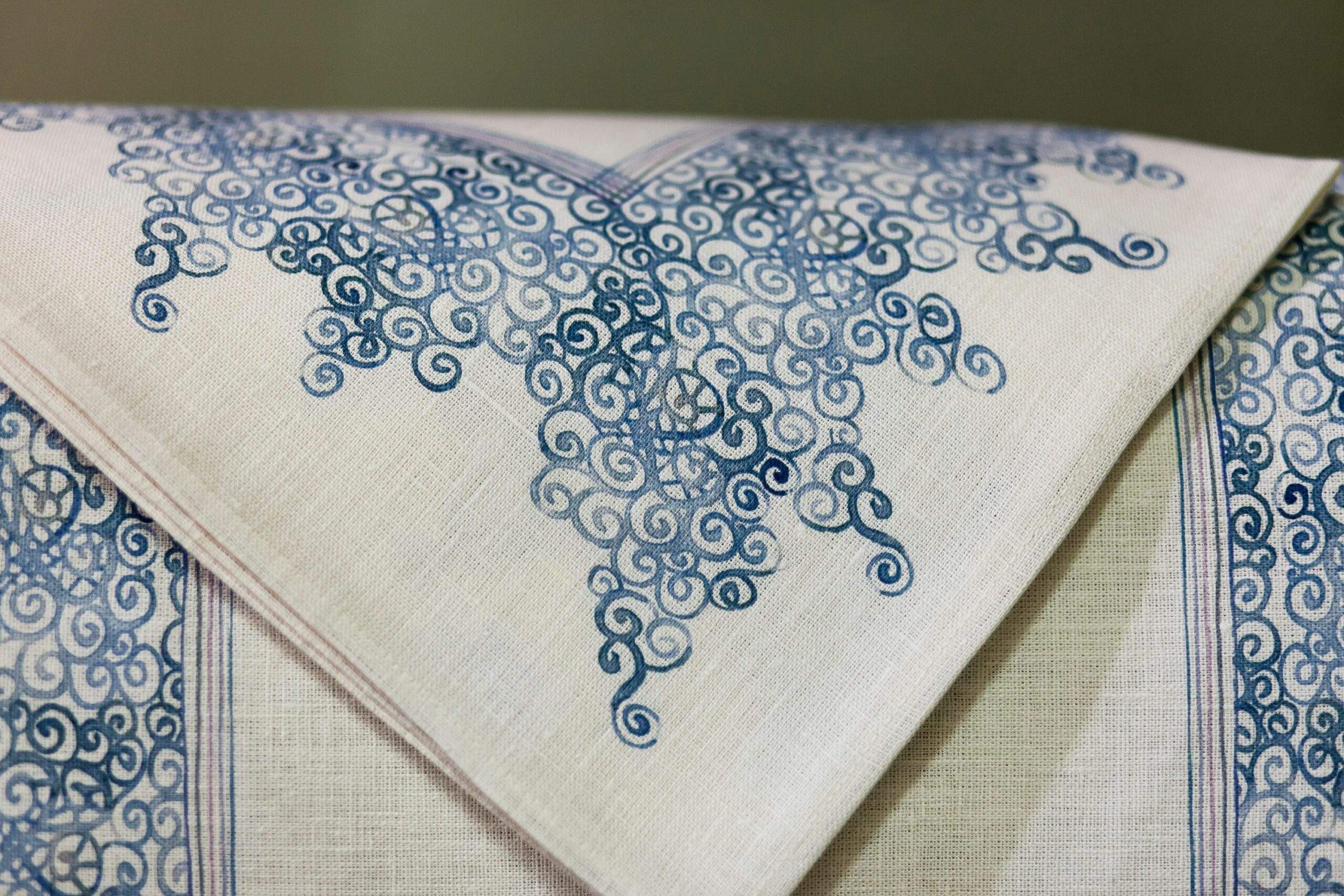 Hand made linen placemats set (four units) from “Laces pattern” collection, printed on natural white linen fabric. This linen placemats can be order with same pattern linen table napkins, placemats or tablecloths (different sizes).