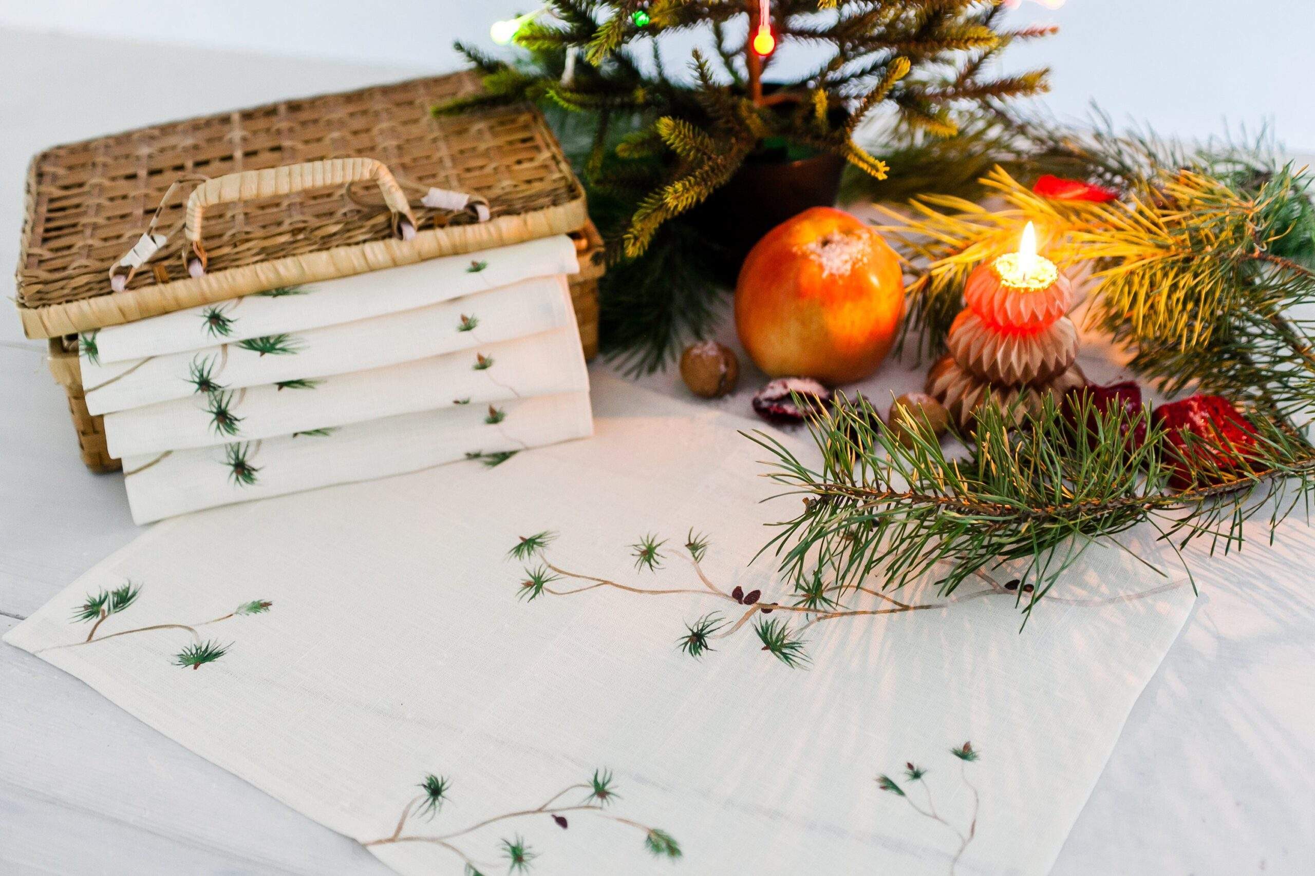 Line placemats set Minimal Christmas. There are two designs – with green border around the corners ant without. We have matching tablecloth, napkins and table runners.