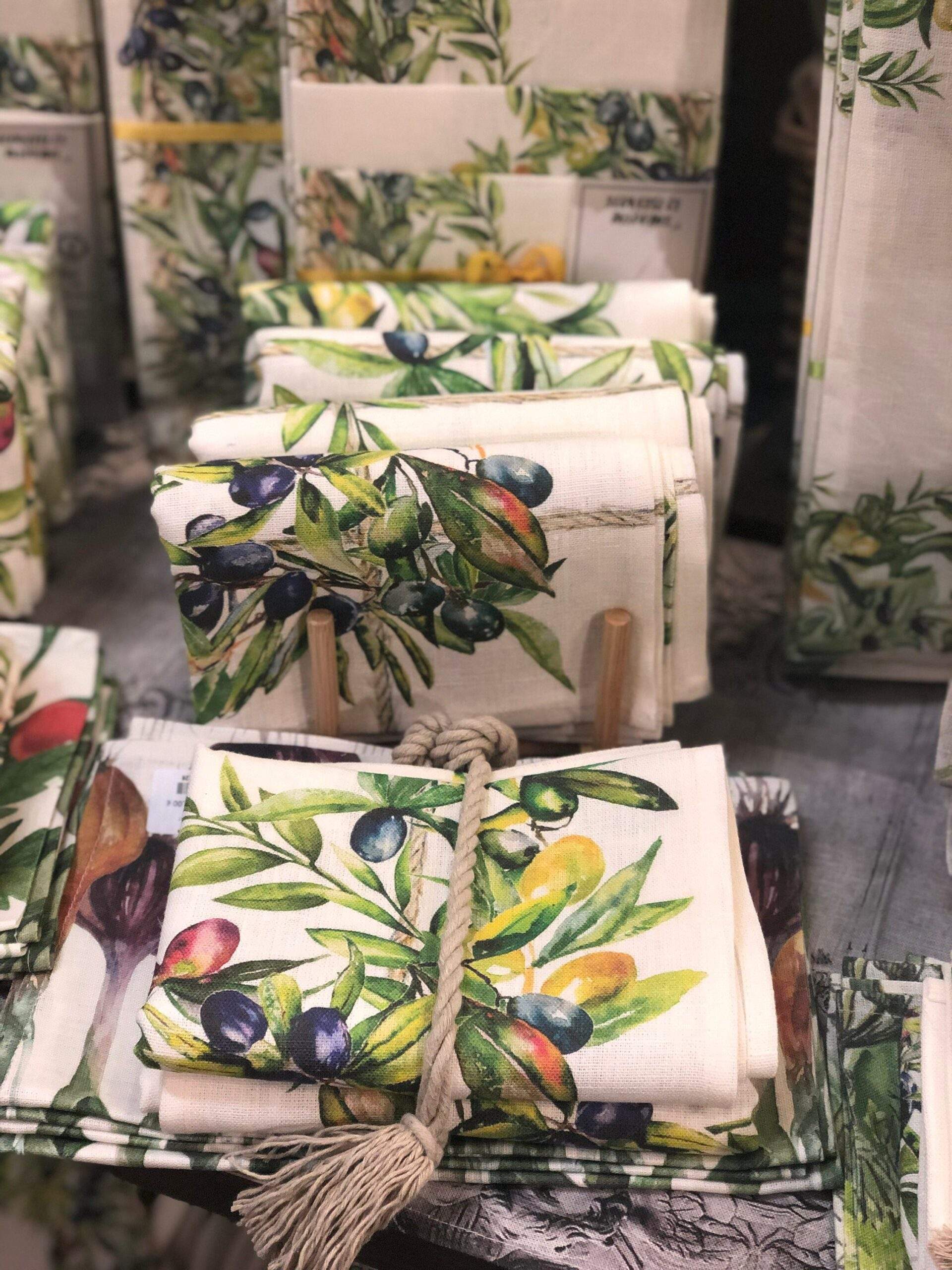 Linen placemats set with olive pattern print. We have same pattern linen napkins set, table runner or tablecloth, 4 or 6 units are available.