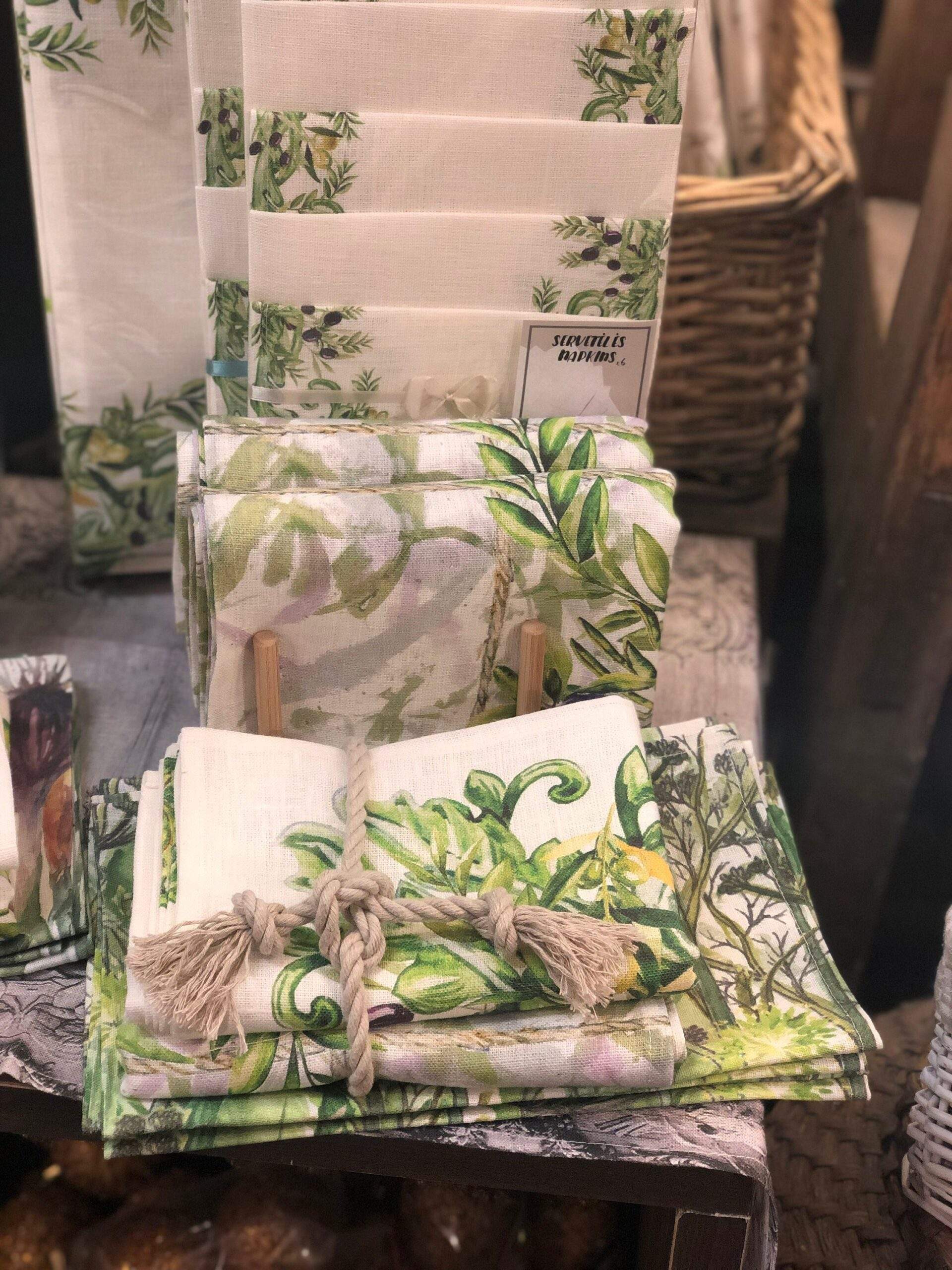Linen placemats set with olive pattern print. We have same pattern linen napkins set, table runner or tablecloth, 4 or 6 units are available.