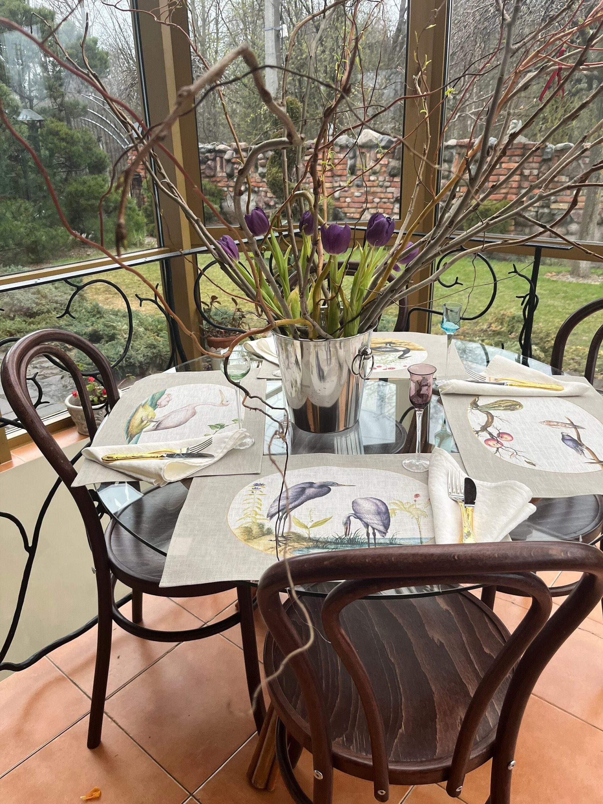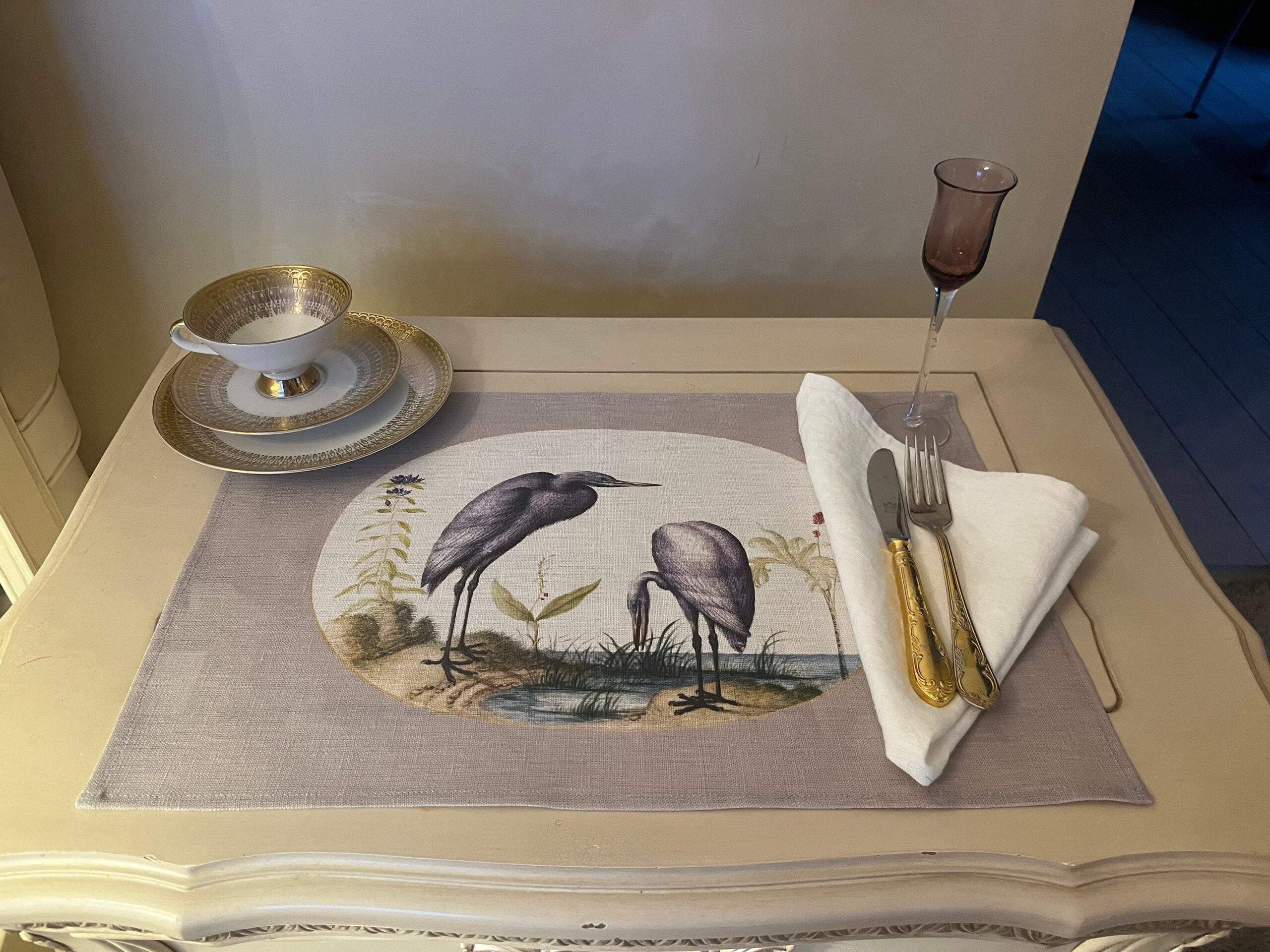 Placemats set “Two Great Egrets with Green Breeding Masks” (1575–1580) by Joris Hoefnagel. Joris Hoefnagel or Georg Hoefnagel was a Flemish painter, printmaker, miniaturist, draftsman and merchant. He is noted for his illustrations of natural history subjects, topographical views, illuminations and mythological works.
