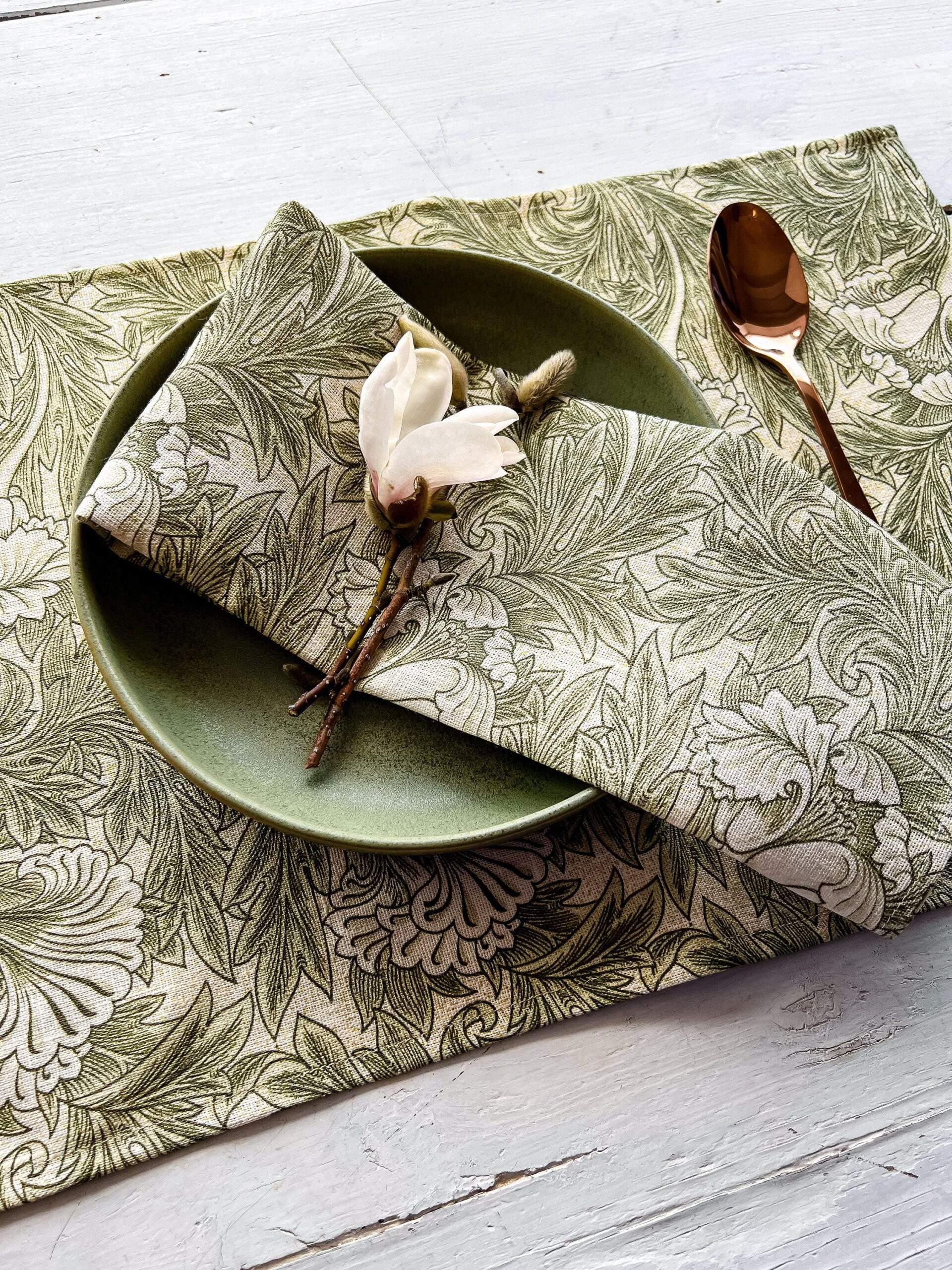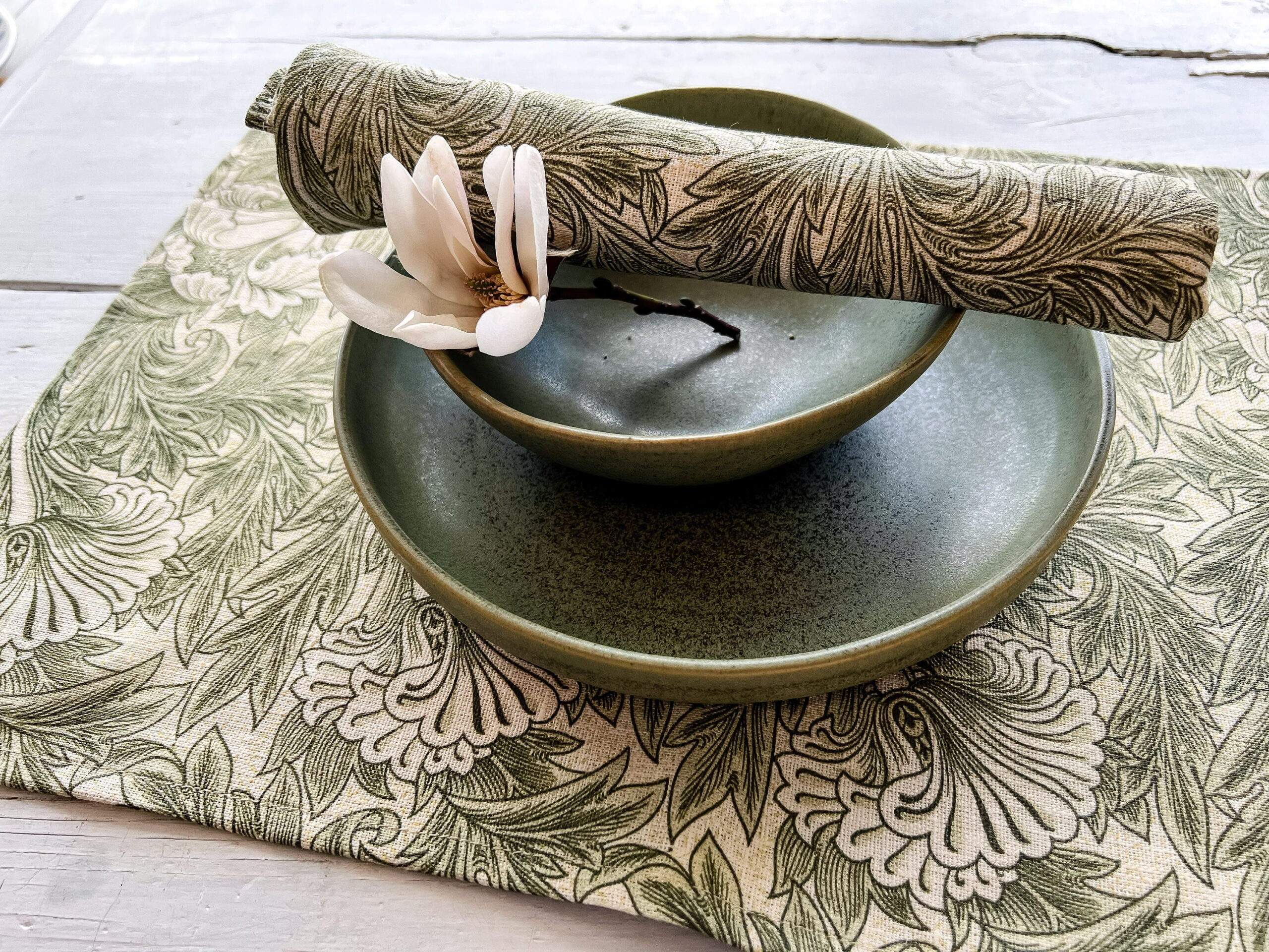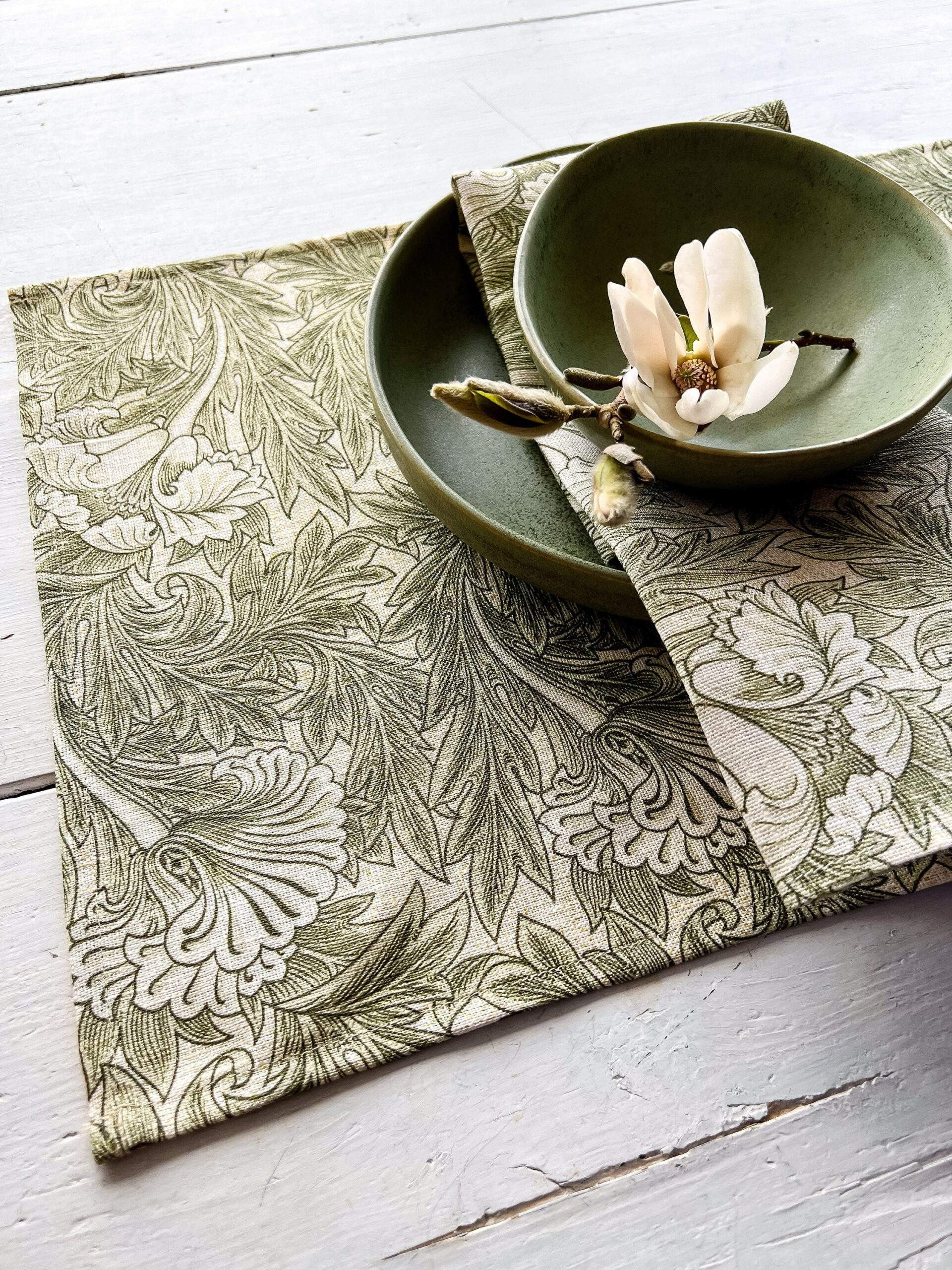 Placemats set “Tulip” pattern (1875) by William Morris. Linen placemats with bright green vintage pattern. White linen fabric.
