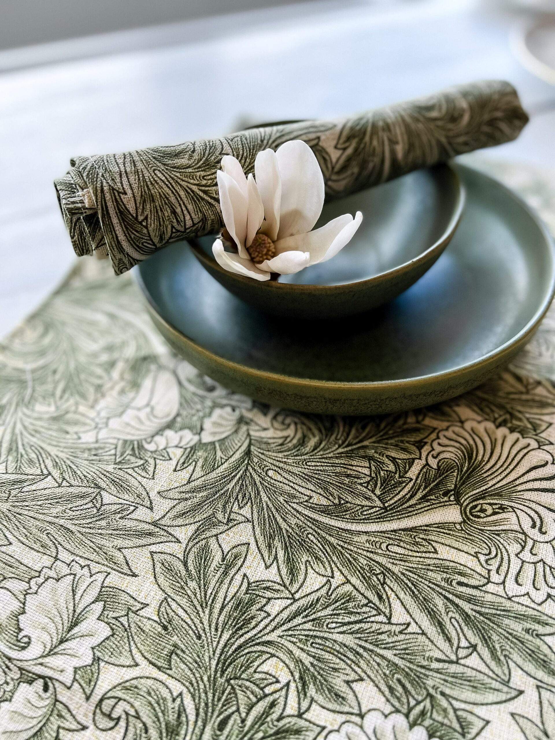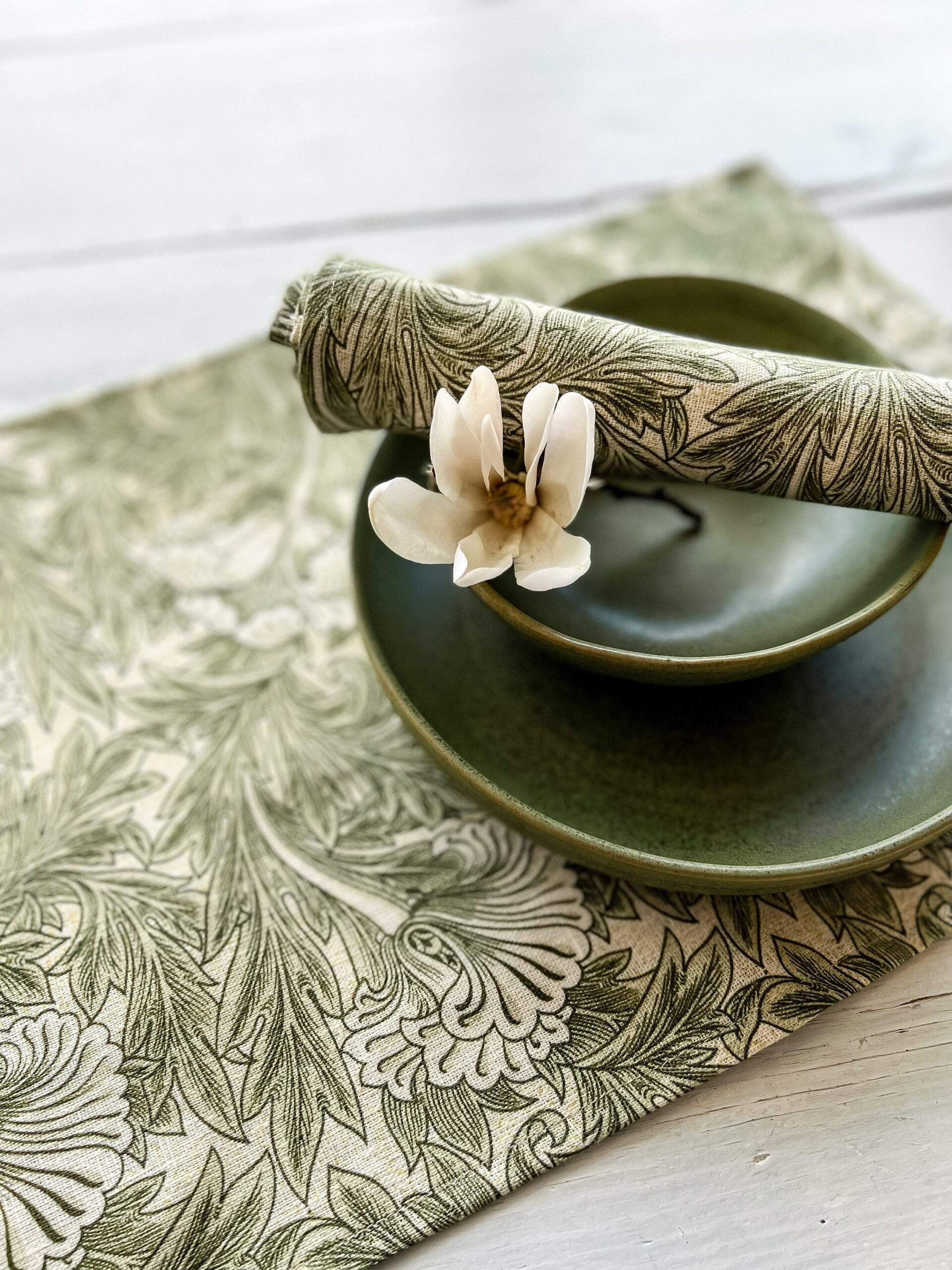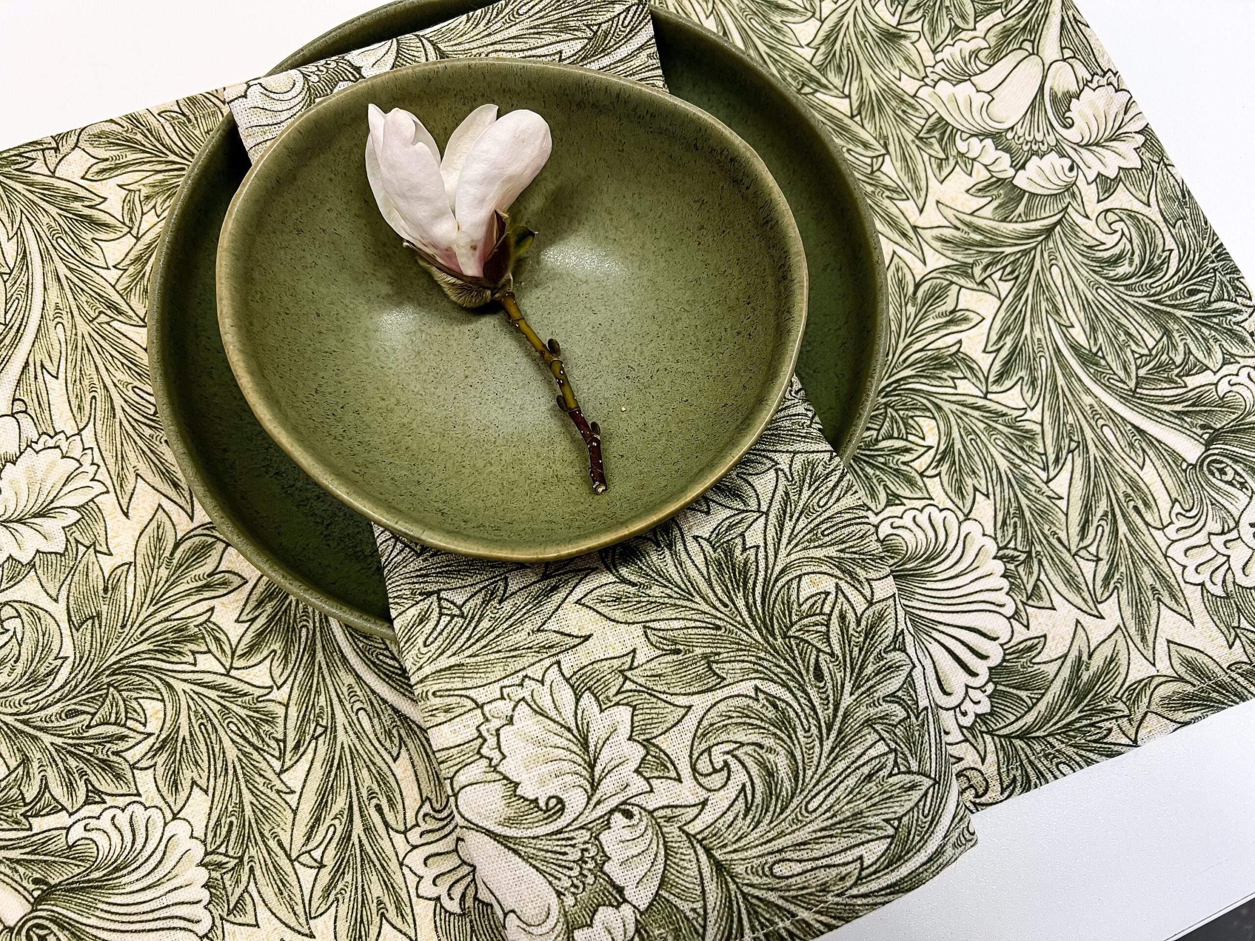 Placemats set “Tulip” pattern (1875) by William Morris. Linen placemats with bright green vintage pattern. White linen fabric.