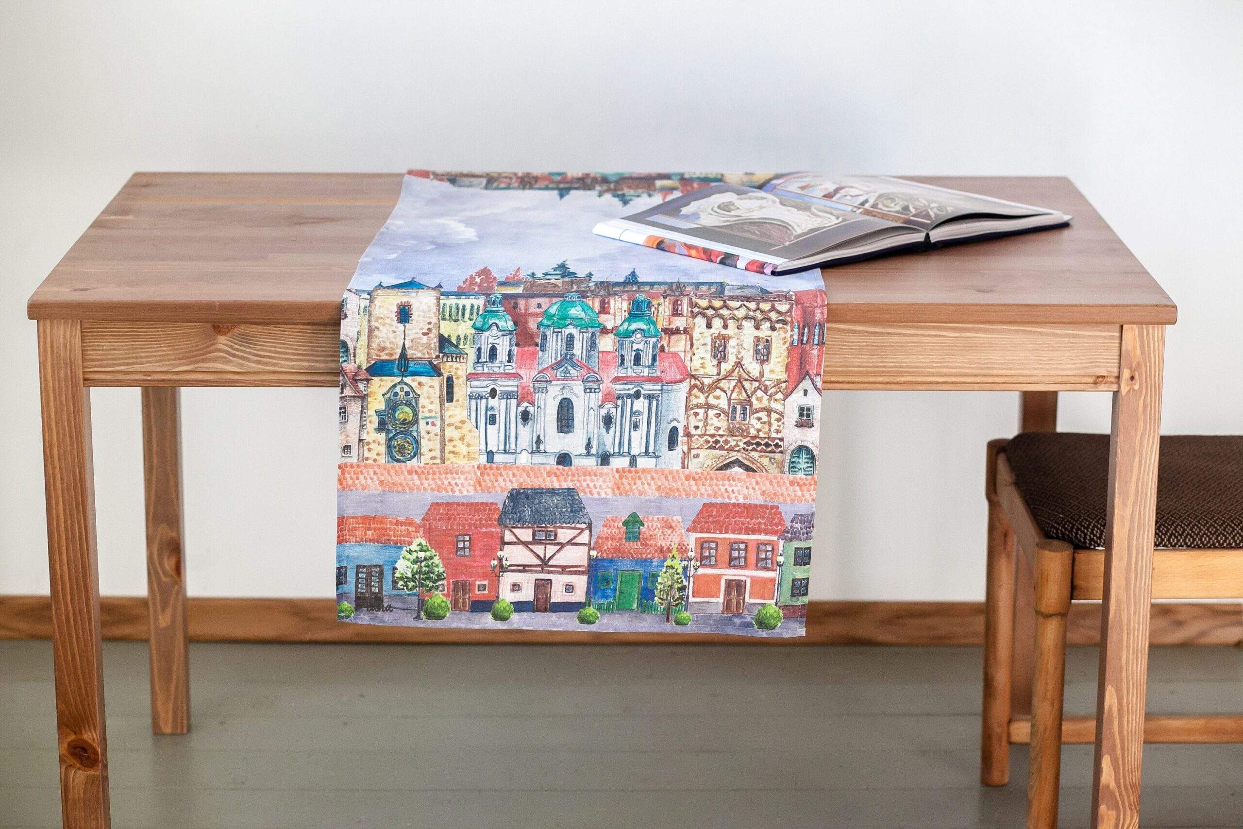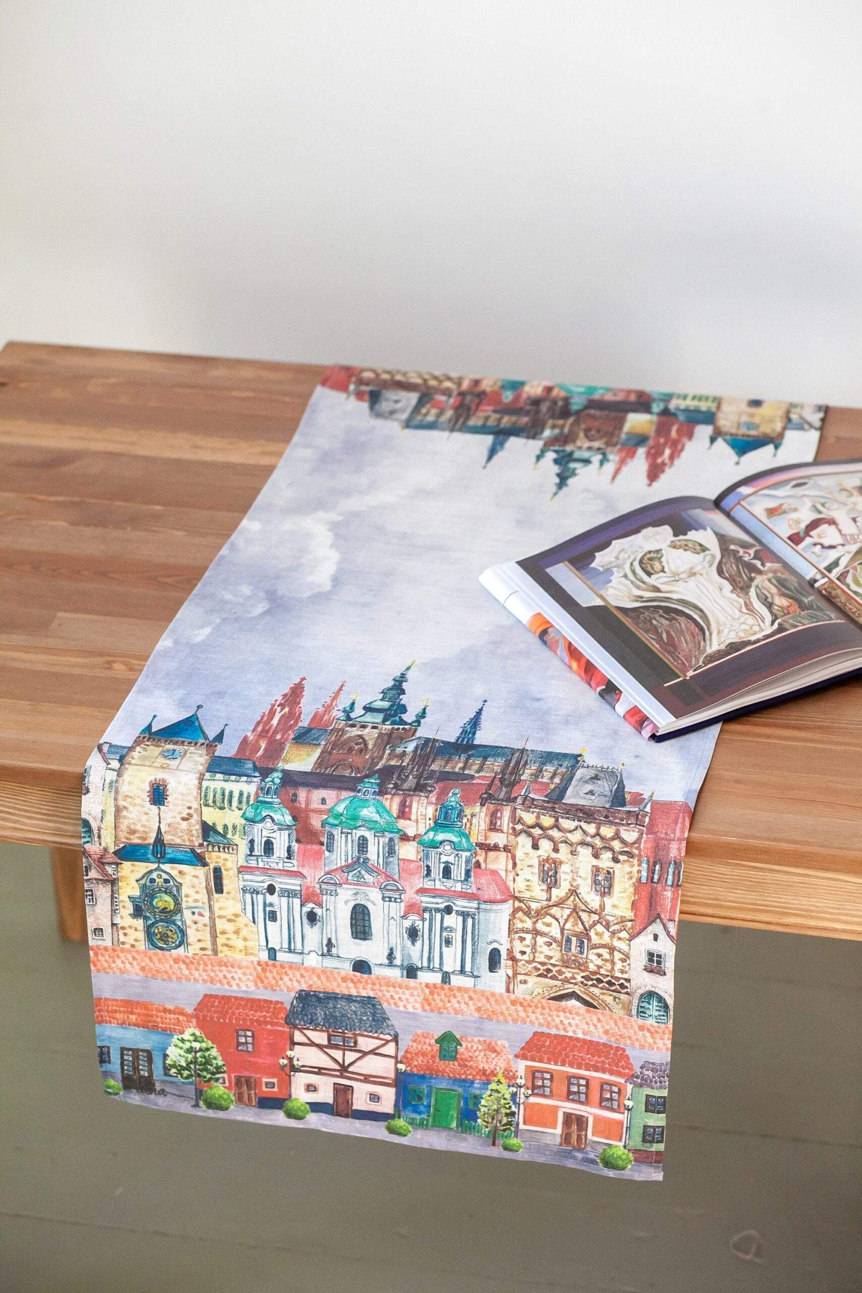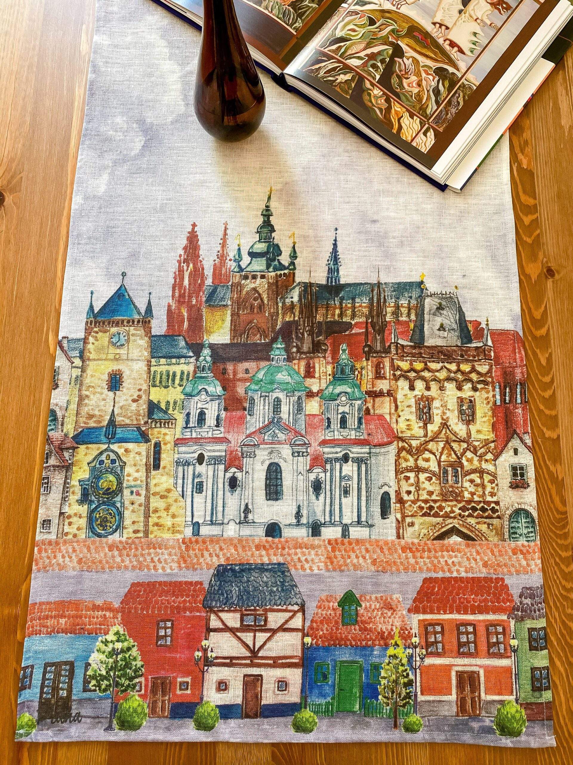 Linen table runner from new collection “Prague” with Prague city fragments print. This table runner can be order with same pattern linen table napkins, placemats or tablecloths (different size).