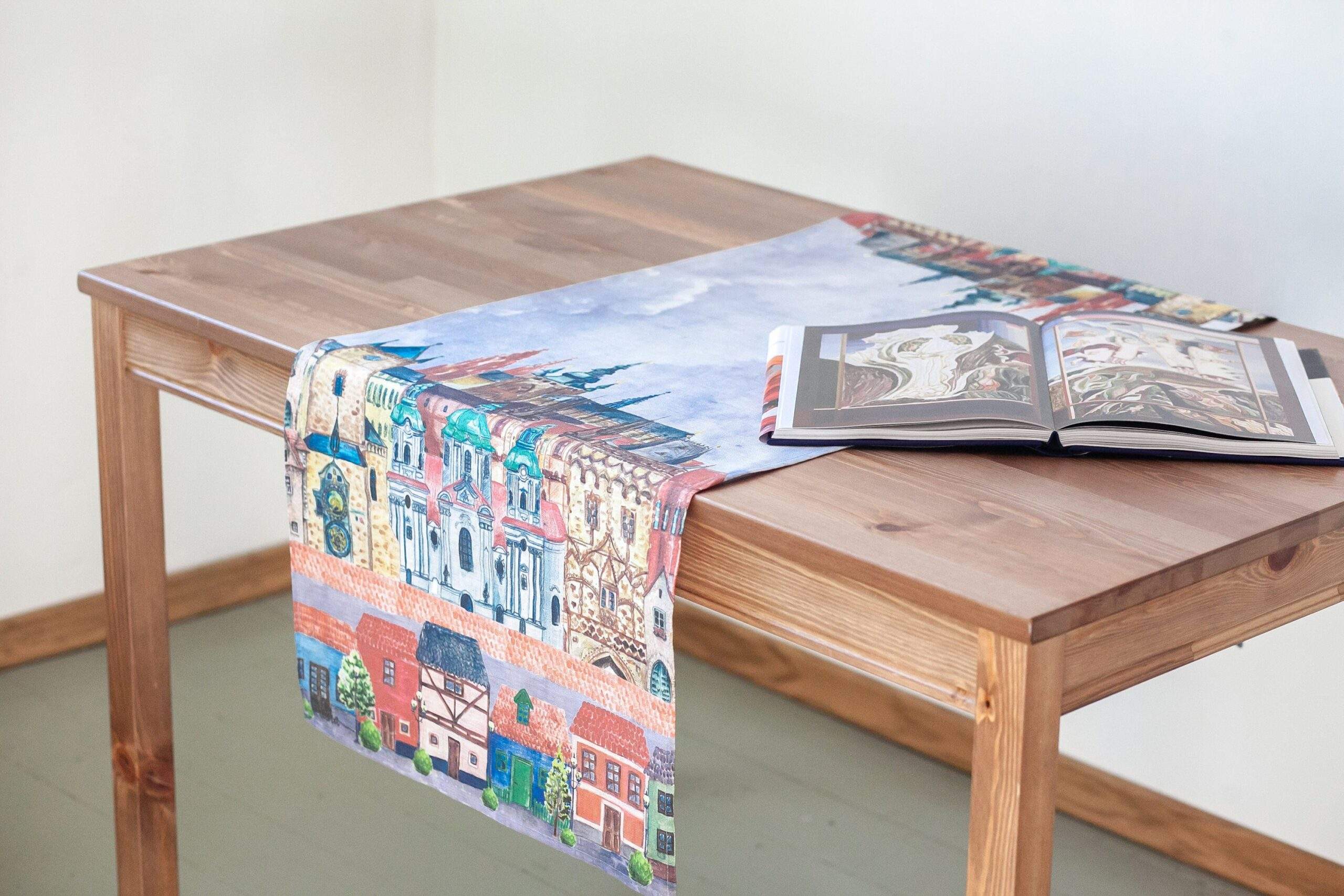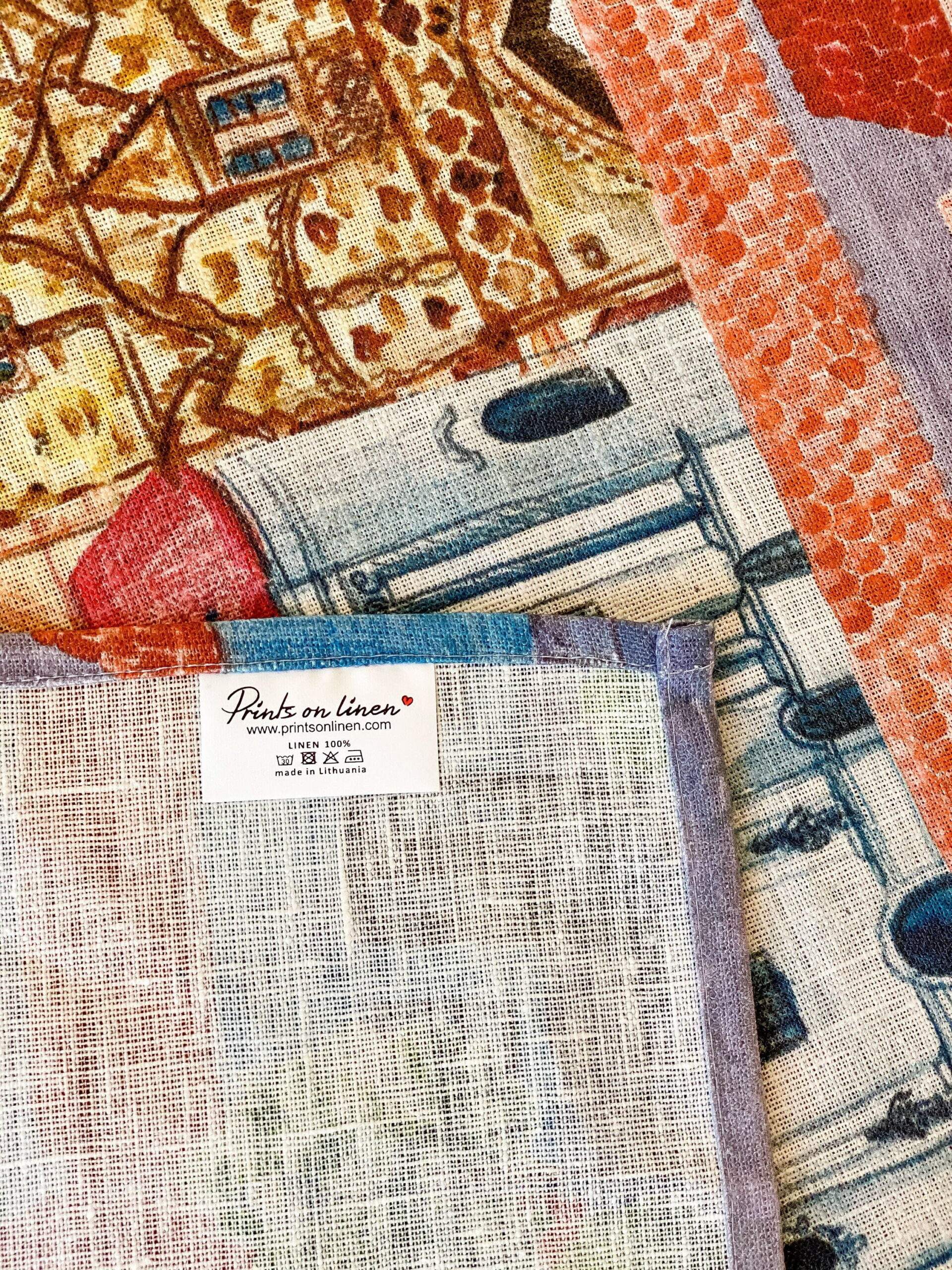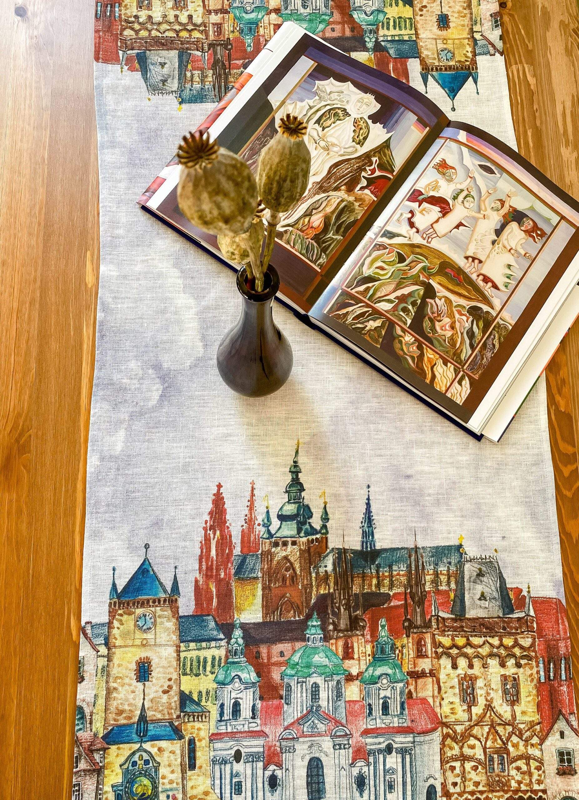Linen table runner from new collection “Prague” with Prague city fragments print. This table runner can be order with same pattern linen table napkins, placemats or tablecloths (different size).