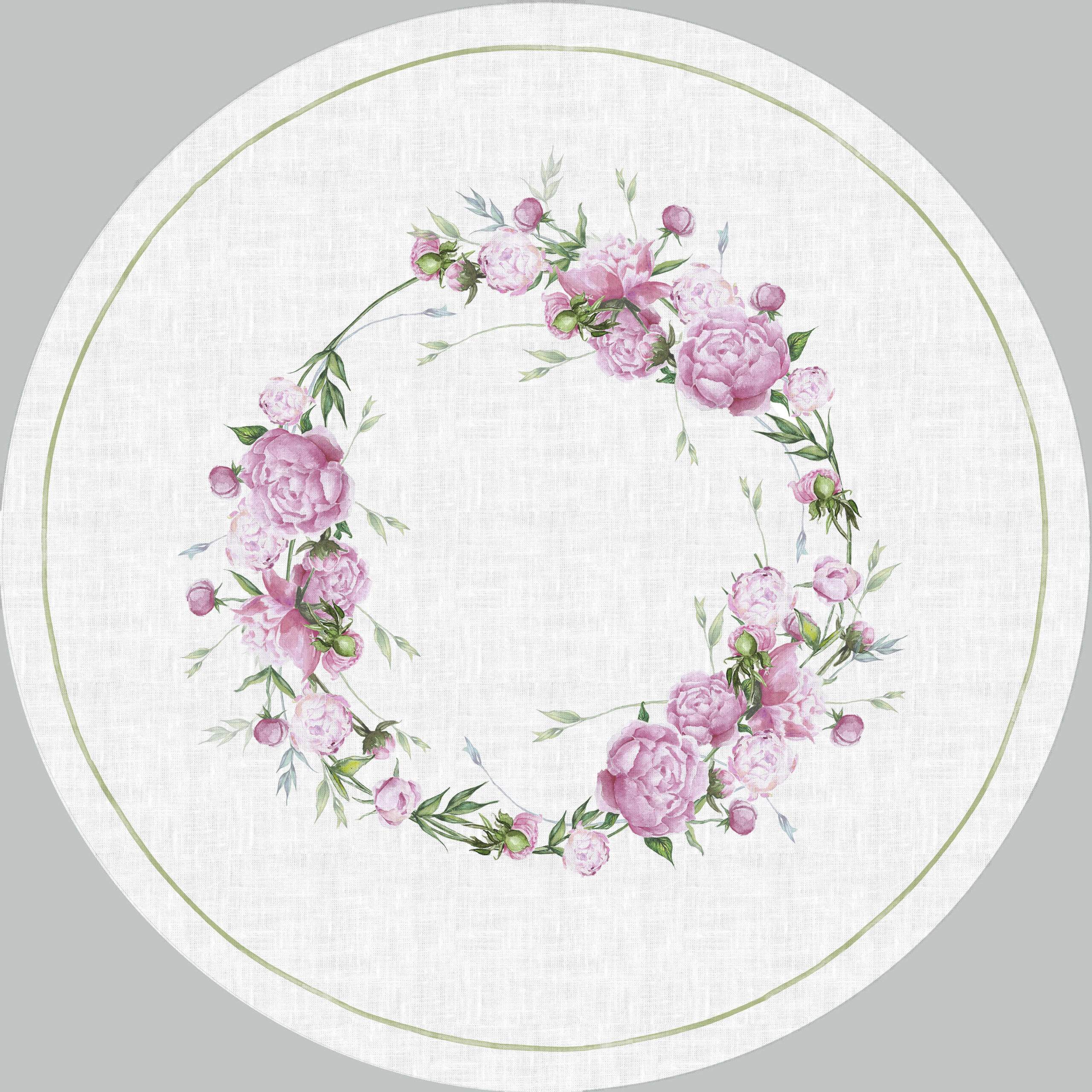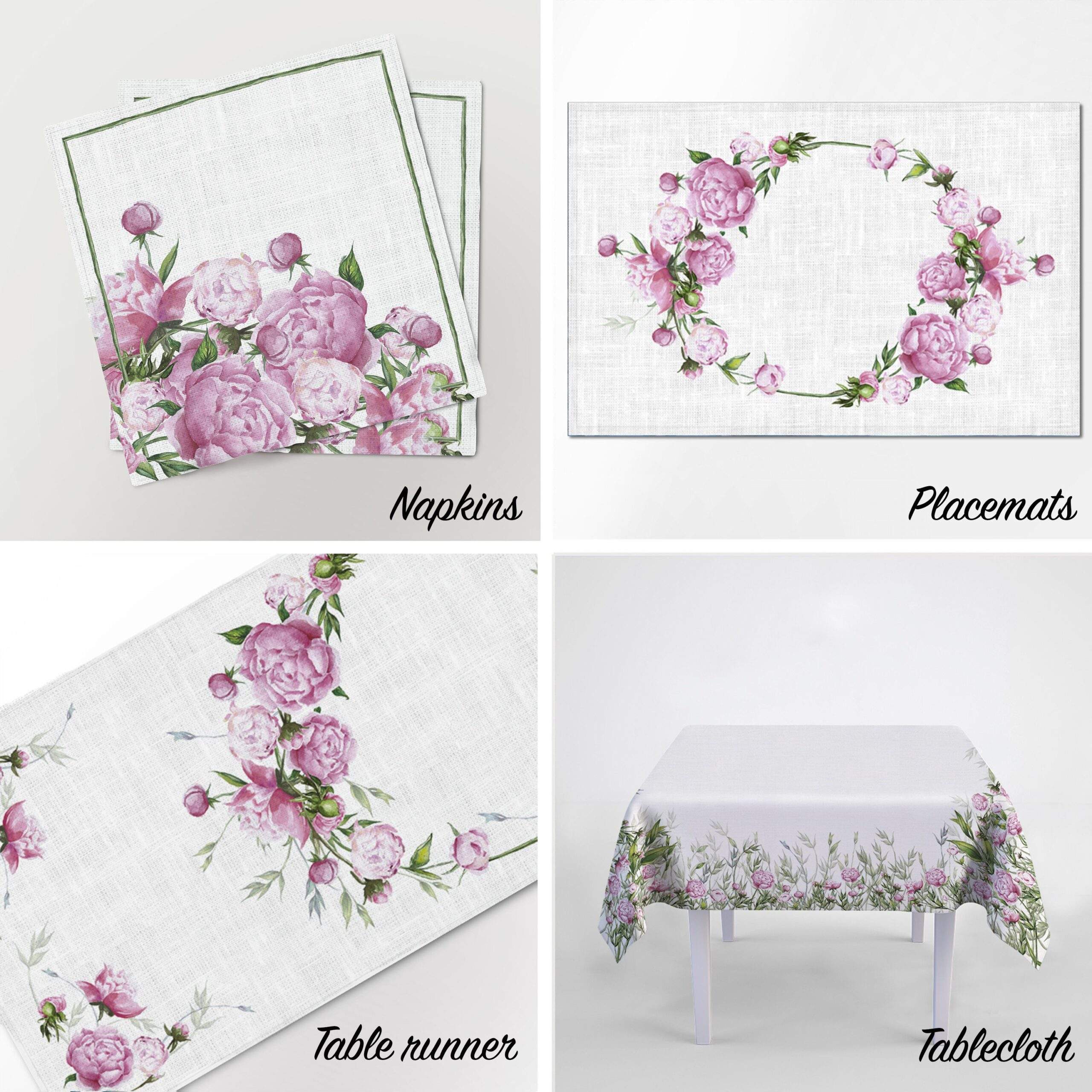 Tablecloth with peonies pattern, circle shape, made of 100% natural linen fabric. Blush pink peonies pattern looks amazing for your spring mood table decor. This tablecloth can be order with matching pattern linen table runners, placemats or napkins sets.