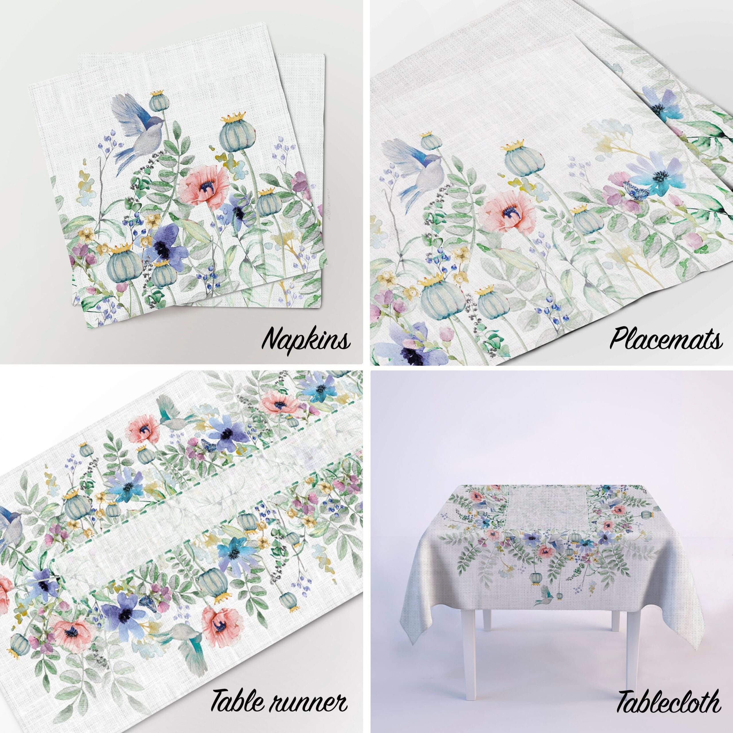 Hand made round tablecloth with flowers and birds pattern. Made from 100% organic white linen. This tablecloth can be order with matching pattern linen table runners, placemats or napkins sets.