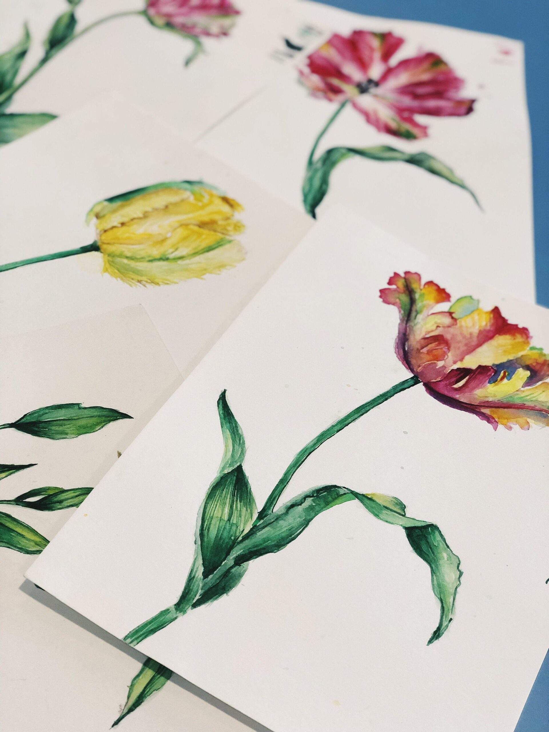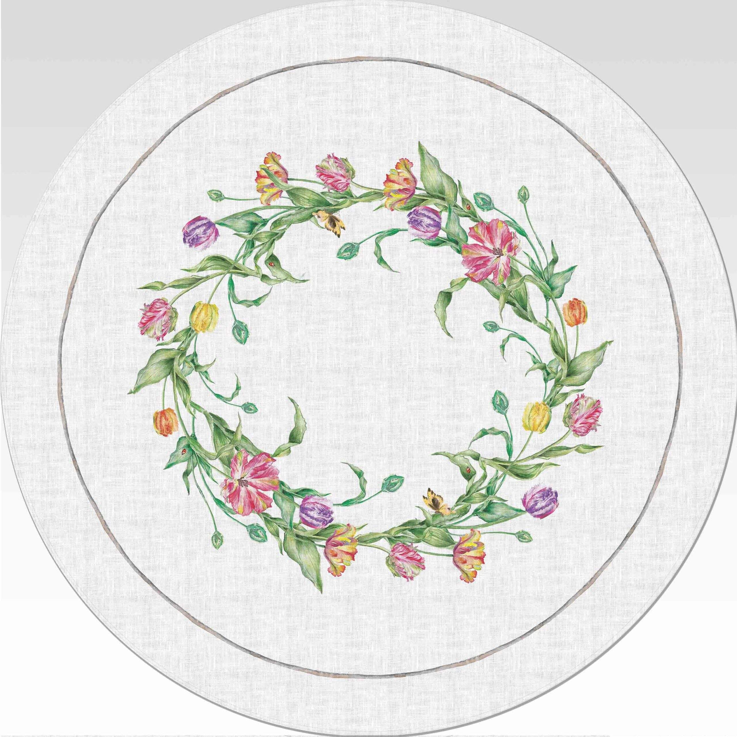 Round tablecloth “Parrot Tulips”. This tablecloth can be order with matching pattern linen table runners, placemats or napkins sets.