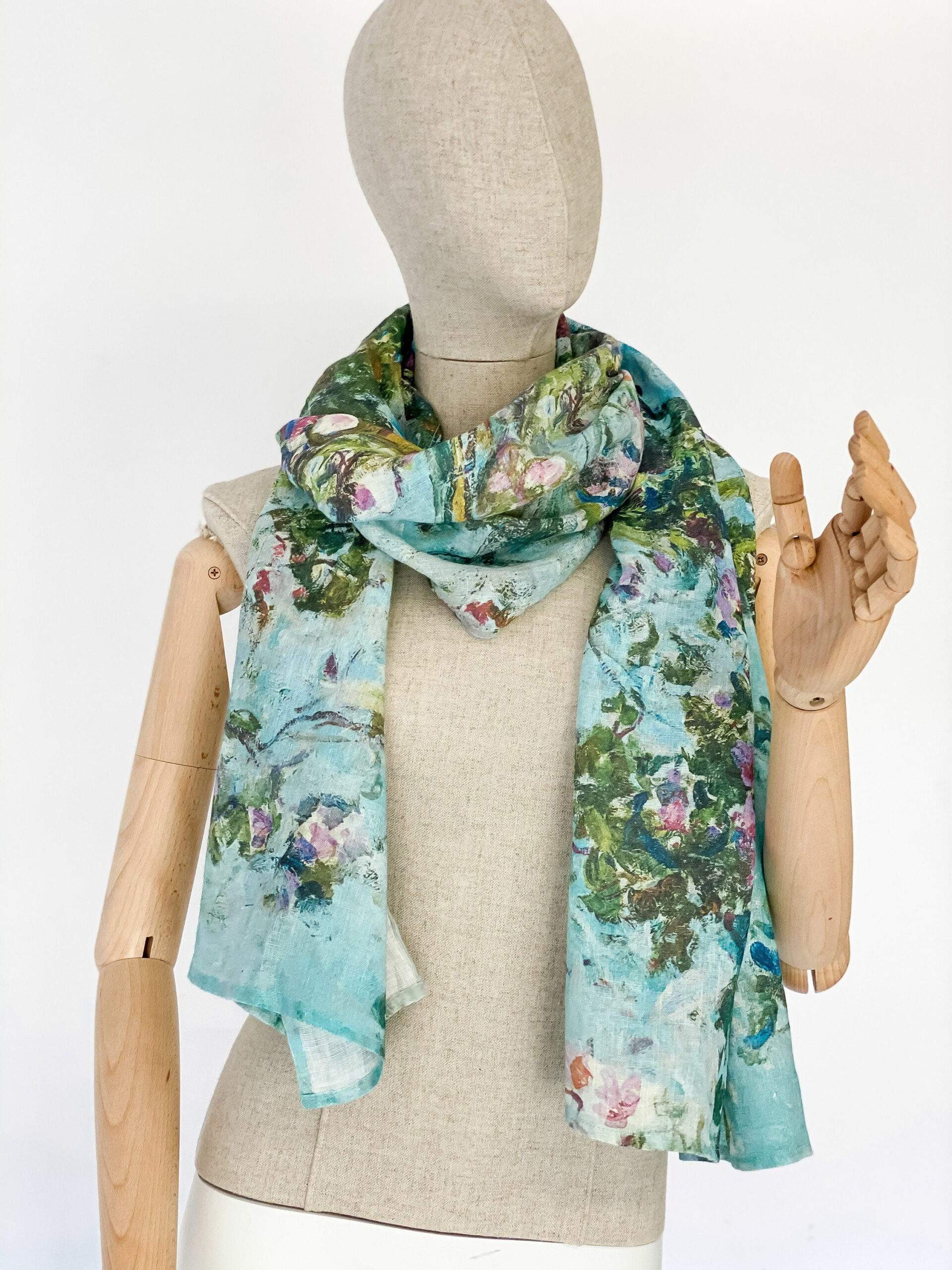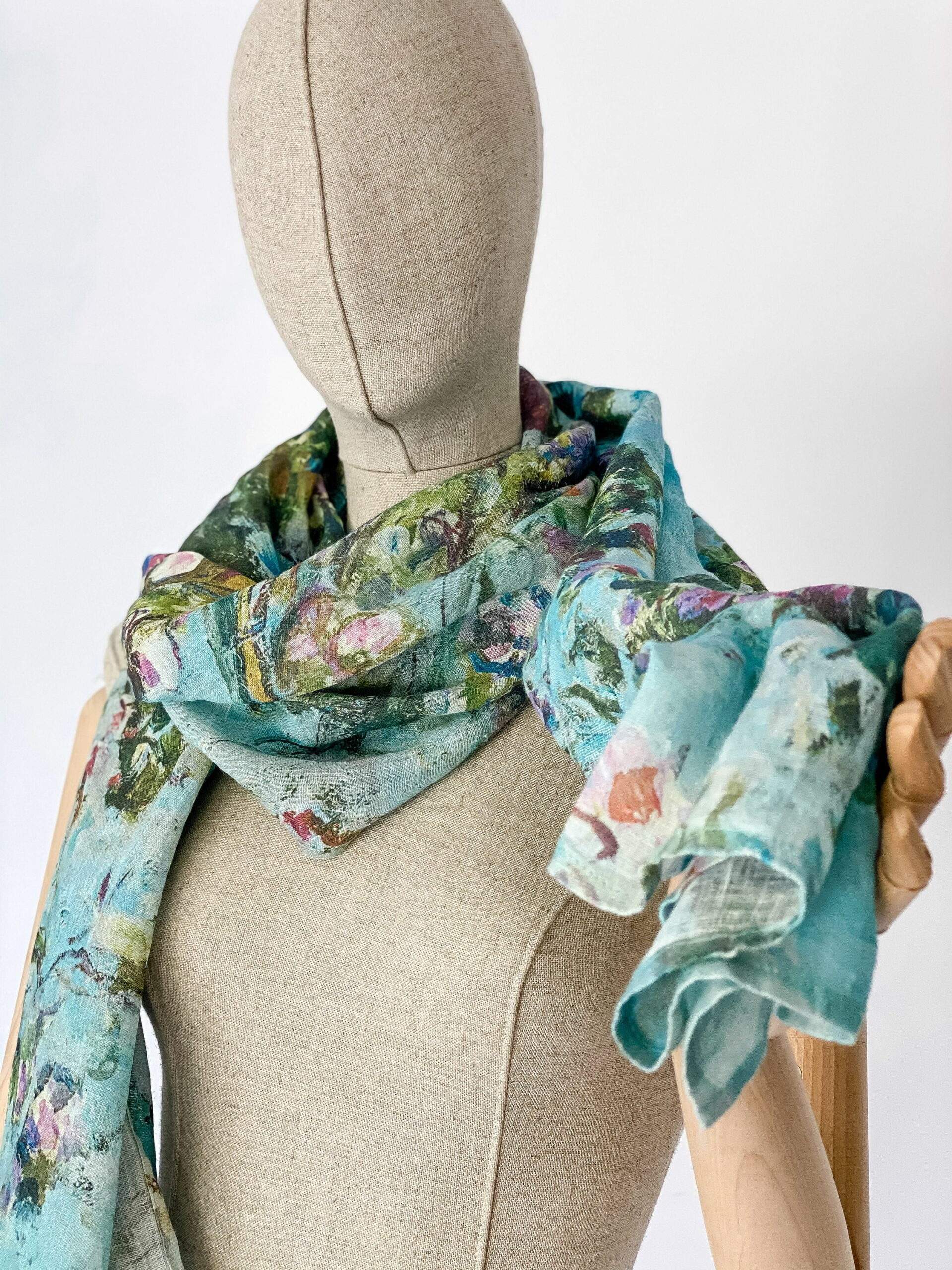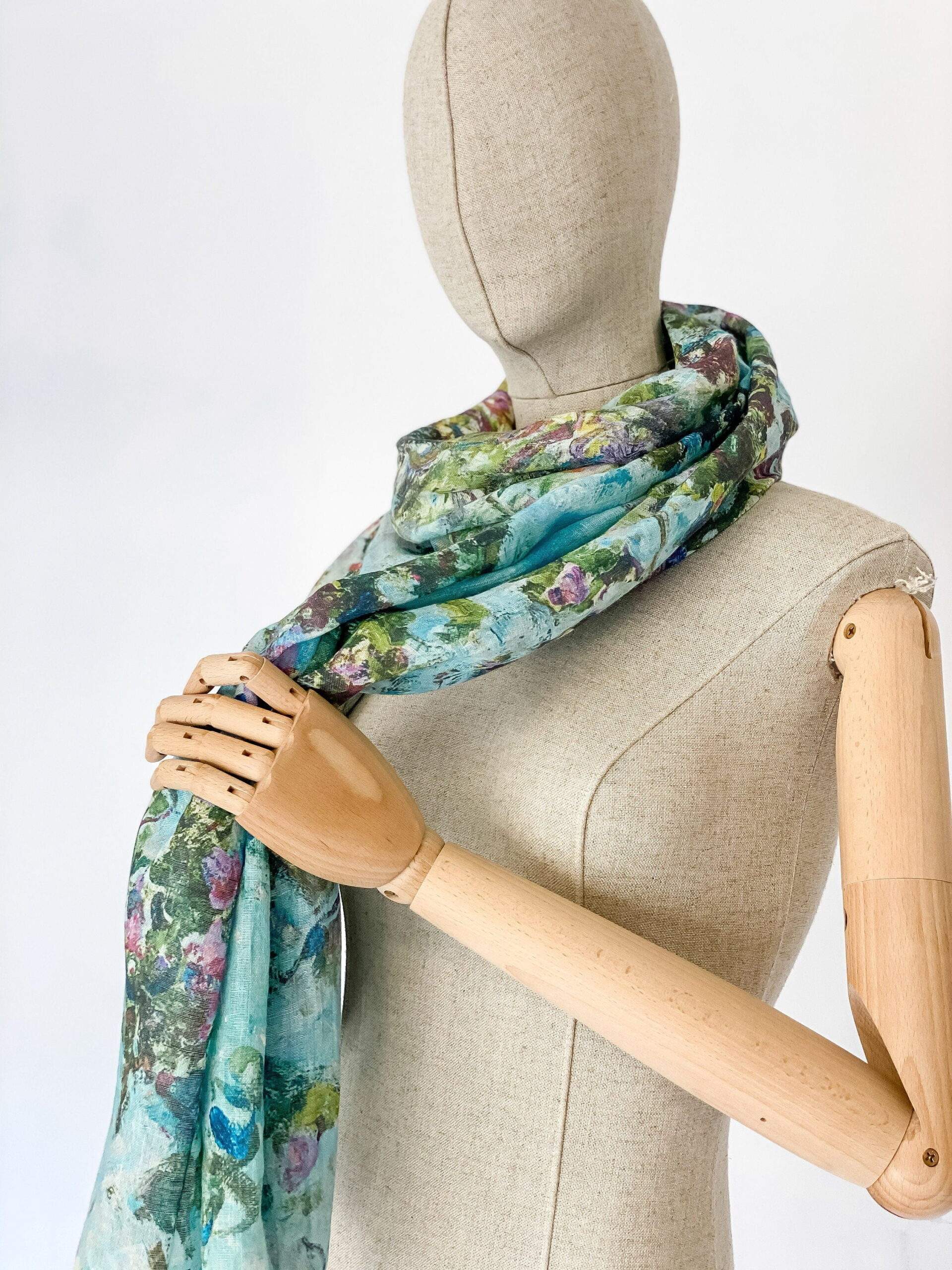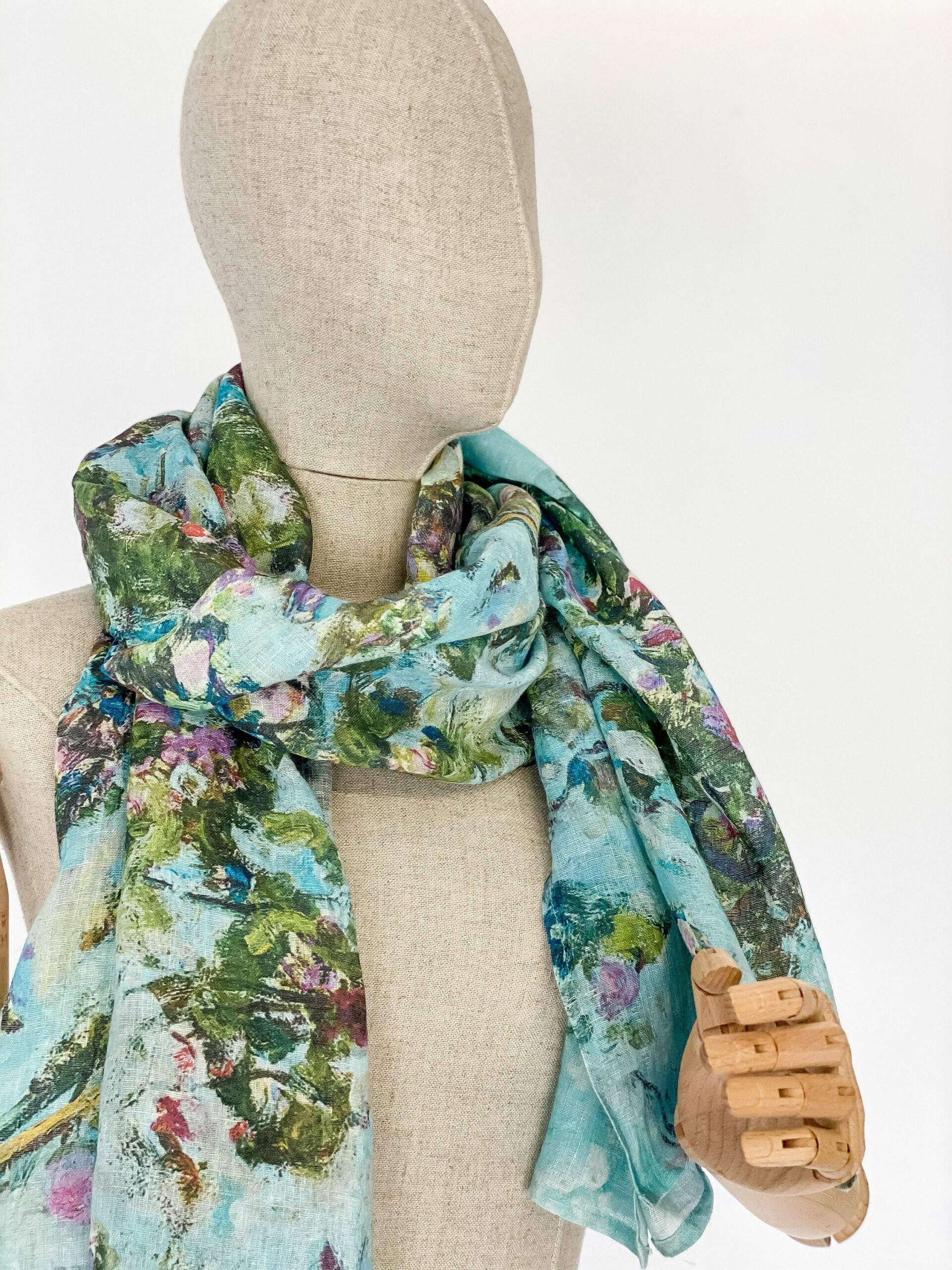 Linen scarf Claude Monet “The Roses Bush”. Oscar-Claude Monet was a French painter, a founder of French Impressionist painting and the most consistent and prolific practitioner of the movement’s philosophy of expressing one’s perceptions before nature, especially as applied to plain air landscape painting.